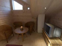 Внизу находятся большая и просторная гостиная с камином, 1 двухместная комната с отдельными кроватями, кухня и стол на 10 человек, туалет, сауна и ванная комната с 2мя душами, и большой холл.