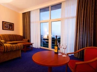 Полулюкс. 54м2. Удобства: Холодильник и телевизор с плоским экраном, Кабельные каналы, Сейф, Кондиционер, Рабочий стол, Отопление, Ковровое покрытие, Диван, 2-х спальная кровать, Душ, Халат, Туалетные принадлежности, Туалет, Ванная комната, Тапочки, Холодильник, Полотенца, Белье.