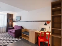 Современный номер со стильным и удобным дизайном. Большая кровать с ортопедическим матрасом, удобное рабочее место, просторный санузел - вообщем все, что нужно для комфортного и приятного проживания.