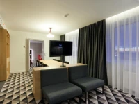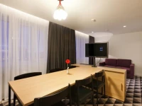 Шикарный просторный номер для Гостей, ценящих комфорт и роскошь. Удобная большая кровать с ортопедическим матрасом, собственная мини-кухня с микроволновой печью, а также отдельная переговорная комната на 10 человек.