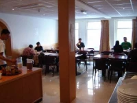 Ресторан расположен на первом этаже, там обслуживают завтраком и обедом в стиле шведского стола. Это большой зал, который выглядит довольно темным, с деревянными панелями и расположен после бара.