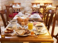 • Традиционный континентальный завтрак: две небольшие сдобные булочки (круассаны, слоеные булочки с шоколадом, изюмом или ванильным кремом), свежая деревенская булочка, два вида варенья, мед, сыр, фрукты, апельсиновый сок и горячие напитки на ваш вкус.