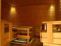 Внизу расположена кухня со столовой, гостиная с камином и две спальни. кроме этого на нижнем этаже находится сауна и комната для переговоров (40 кв.м.). Наверху три спальни с односпальными кроватями.