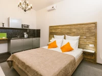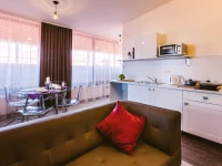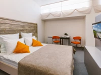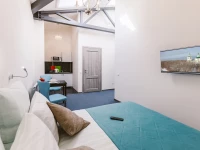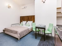 Однокомнатные номера Студии выполнены в трех цветовых стилях: "Морской бриз", "Южная ночь" и "Мятная свежесть" с прихожей, оборудованной кухней и спальней. Общая площадь каждого номера: 23-25 м².
