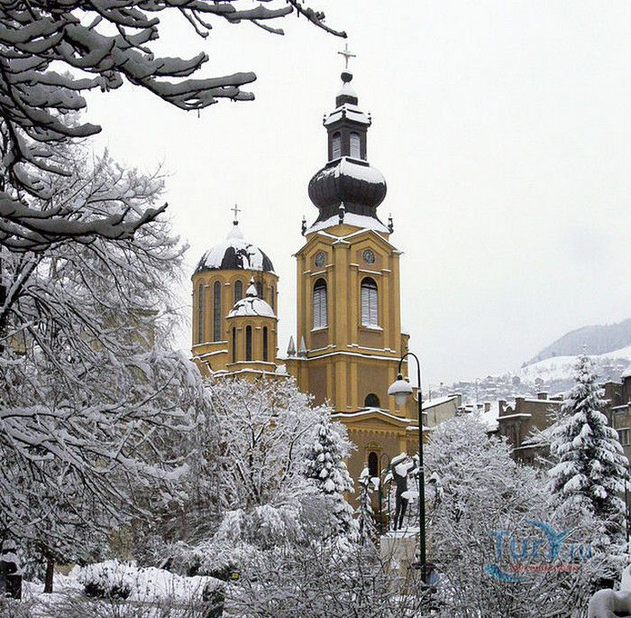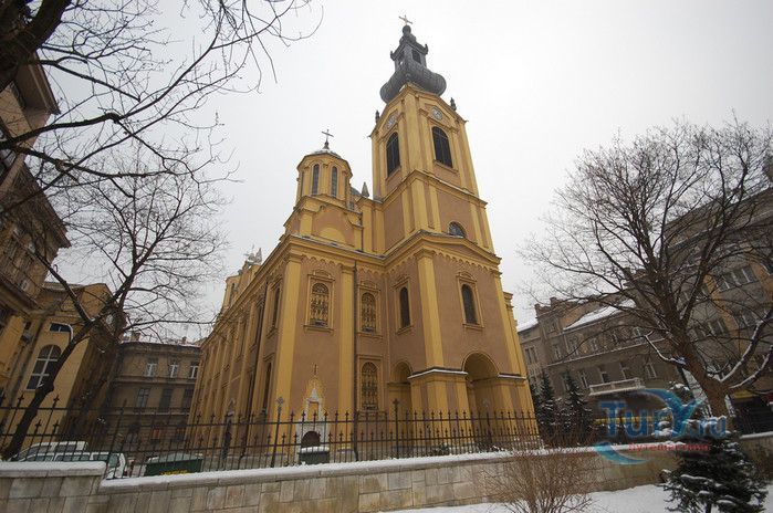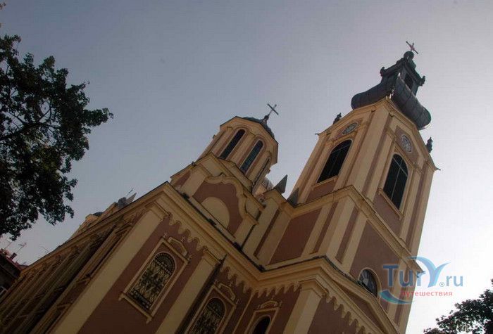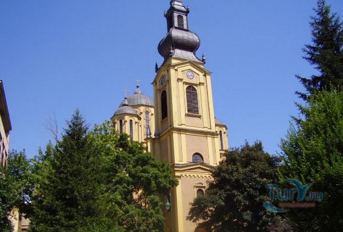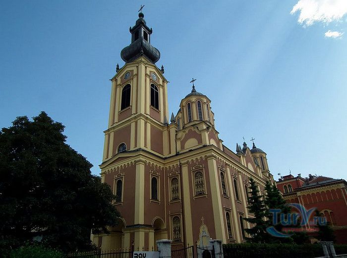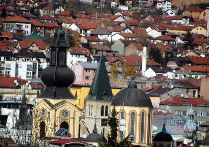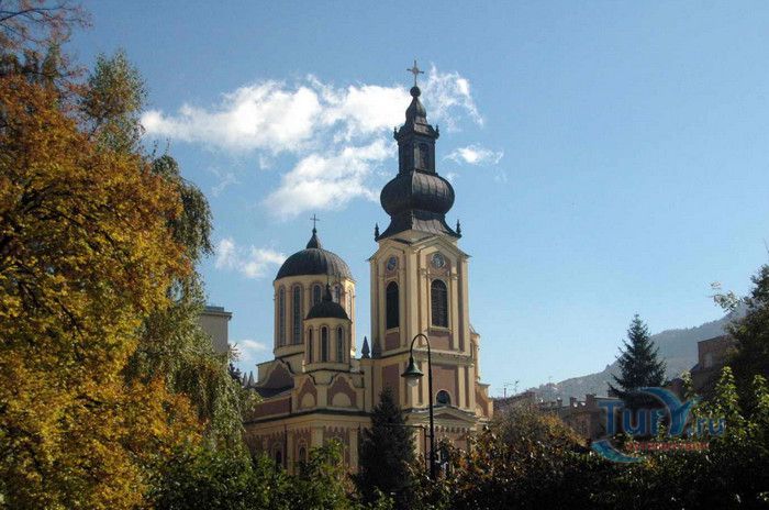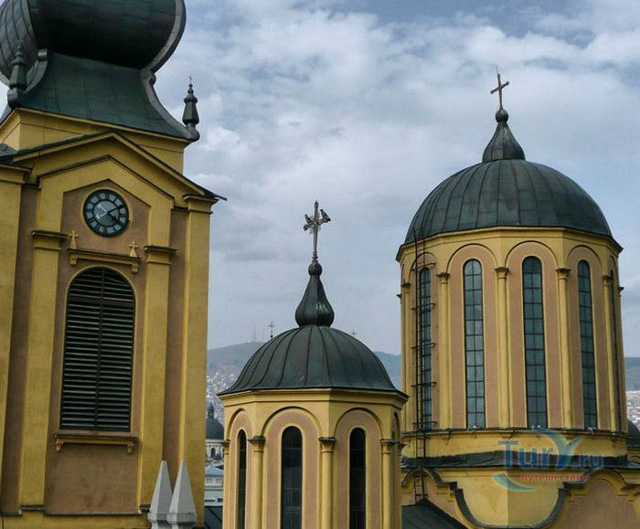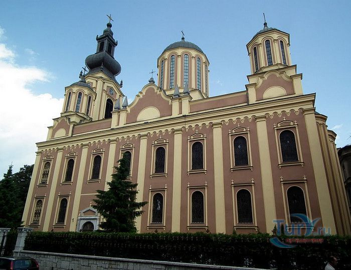 Соборная Церковь Рождества Пресвятой Богородицы - главный православный храм Сараево и один из крупнейших на Балканском полуострове. Решение о возведении православной церкви в Сараево было принято в 1859 году, строительные работы начались в 1863 году. Церковь была построена на пожертвования, которые собрали православные верующие Сараево, окрестных сёл, купцы из Белграда, Дубровника, Вены и Триеста, представители сербской знати. 556 дукатов выделил на возведение храма султан Абдул Азиза, который дал разрешение на строительство православной церкви в Сараево, чтобы смягчить Европу, которая обвиняла Османскую империю в религиозной нетерпимости и притеснениях коренных жителей, исповедующих христианство. Значительная сумма была собрана в России, кроме того были переданы иконы для иконостаса, церковные книги, утварь и облачения. Освящение храма состоялось 20 июля 1872 года, а строительные работы полностью завершены в 1874 году. Церковь построена архитектором Андреем Дамяновым. Храм имеет вид трёхнефной базилики с пятью куполами, в плане образует крест. Длина церкви - 37 метров, ширина - 22,5 метра, высота - 15,5 метра, диаметр большого купола - 34 метра. 45-метровая колокольня, построенная в стиле барокко, украшена резьбой. Внутренние стены церкви расписаны фресками, а окна украшены великолепными витражами. Во время Первой мировой войны австрийцами с церкви были сняты кровля и колокола, внутренне убранство было повреждено. Реставрационные работы были начаты в 1921 году. Крыша была покрыта медными пластинами, восстановлено покрытие пола, иконостас покрыт позолотой и установлены три новых колокола, отлитые в Триесте. Восстановительные работы были окончены в канун Рождества 1922 года, а на Рождество Христово была отслужена первая послевоенная литургия. Вторую мировую войну церковь Рождества Пресвятой Богородицы пережила без разрушений. В 2007 году при храме была основана библиотека, фонд которой насчитывает более 2000 томов религиозной и художественной литературы.