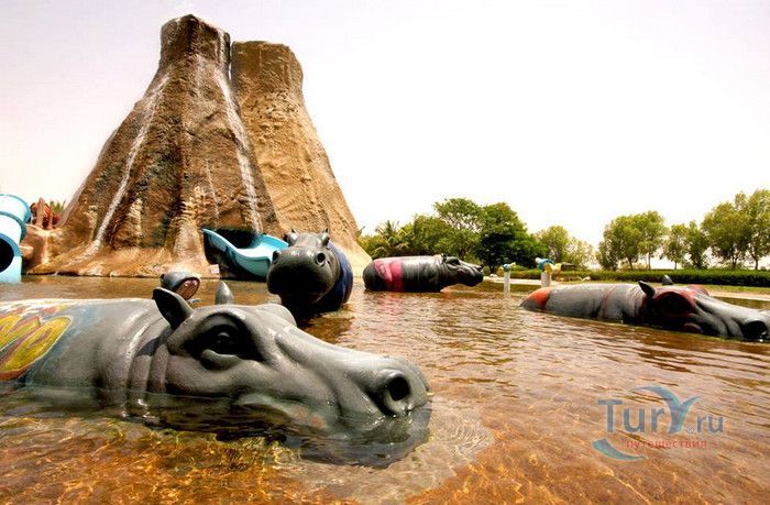 На территории аквапарка построен искусственный вулкан высотой 18 метров. Уникальные световые эффекты создают великолепную имитацию настоящего действующего вулкана. Также в аквапарке есть амфитеатр и зверинец.