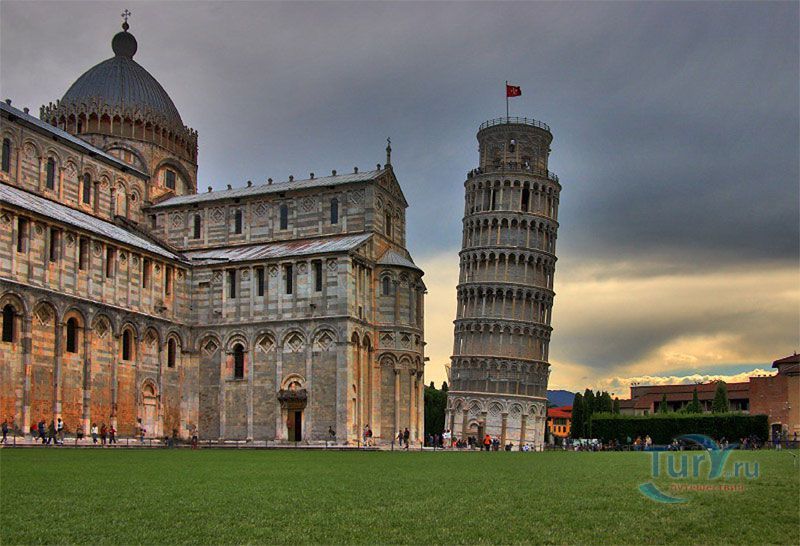 Вскоре, после начала строительства в 1173 году, фундамент Пизанской башни положили неровно. Строительство было остановлено и возобновлено только спустя 100 лет. Только потом стало ясно видно, что Пизанская башня "падает" наклонившись к югу. С того времени, как начались постоянные измерения башни в 1911 году, было зафиксировано, что вершина наклоняется на 1,2 миллиметра в год. На сегодняшний день, вершина Пизанской башни наклонена на 5,3 м от центра. Башня достигает в высоту 55 метров, а надпись на ней свидетельствует, что заложена она в 1174 году. Но поскольку пизанский календарь, как выяснилось, на один год опережал общепринятый, реальной датой начала строительства следует считать 1173 год. Архитекторами башни были Боннано Пизано и Вильгельм фон Иннсбрук, но им обоим не суждено было увидеть окончательное завершение своего замысла. Кстати, до второй половины XIV столетия башня оставалась без увенчивающей ее звонницы. В 1564 году в Пизе родился Галилео Галилей, будущий знаменитый ученый. Судя по его собственным рассказам, он использовал Пизанскую башню для своих опытов. С верхнего ее этажа он бросал различные предметы, чтобы доказать, что скорость падения не зависит от веса падающего тела. Знаменитый соборный ансамбль в Пизе - шедевр средневековой итальянской архитектуры. В Пизанском соборе находятся несколько захоронений различных исторических деятелей, среди которых - гробница германского императора Генриха VII.