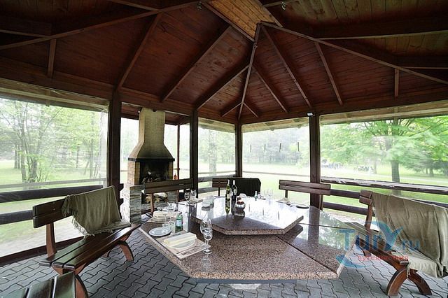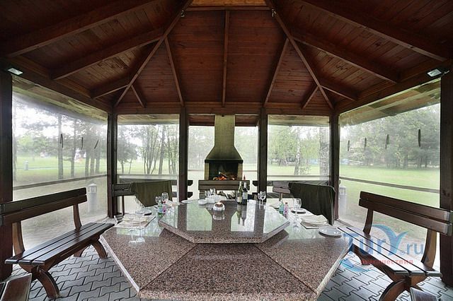 Летний ресторан одновременно готов принять более 120 гостей. БЕСЕДКИ ДЛЯ БАРБЕКЮ с мангалом и камином, на 10-12 человек. Беседки предлагаются с костровым комплектом (мангал, шампуры, уголь, жидкость для растопки, дрова).