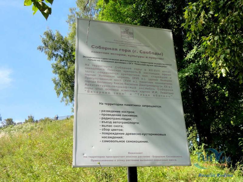 Соборная гора или гора Свободы в городе Плес - это памятник истории, культуры и природы, это место, где началась история основания города. Поселение было основано в XII веке, предположительно Юрием Долгоруким для защиты Ростово-Суздальского княжества от вторжений Волжской Булгарии. Крепость была выстроена у подножия Соборной горы, но просуществовала она недолго. Разрушена первая крепость была в феврале 1238 года во время нашествия Батыя. После утраты крепости город продолжил свое существование. В 1410 году, когда московский князь Василий I, сын Дмитрия Донского, оказался в Костроме, спасаясь от татарского хана, он повелел построить на горе укреплённую таможенно-сторожевую заставу. Это место было выбрано не только из-за своей высоты, но еще и потому что Волга здесь не петляет, а это позволяло увидеть противника с большого расстояния. Но и эта вторая крепость была сожжена татарами, а затем еще раз отстроена. В начале XVI века крепость была уничтожена поляками, но город постоянно отстраивался. Сейчас на Соборной горе можно увидеть место, где находилась крепость - оно выложено из бревен. Кроме места бывшей крепости на Соборной горе сохранился Крепостной вал, старейшая в Плесе Успенская церковь XVII века, здание бывших Присутственных мест XVIII века и памятник основателю города Великому Князю Василию Дмитриевичу, установленный в начале XX века. Архитектурно-ландшафтный ансамбль Соборной горы стал основой известных картин И.И.Левитана "Вечерний звон" и "Тихая обитель".
