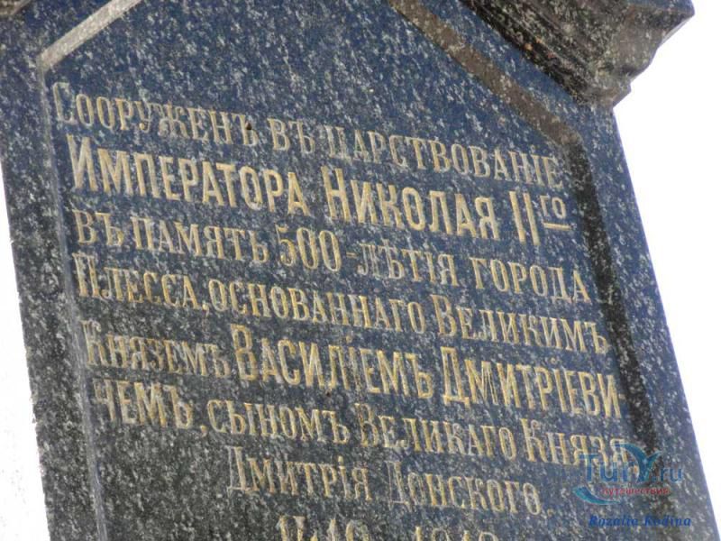 На Соборной горе в городе Плес в 1910 году, в год празднования 500-летия города, был установлен памятник основателю города Князю Василию Дмитриевичу I. Великий московский князь Василий I считается основателем Плеса. Именно он повелел построить здесь укрепленную таможенно-сторожевую заставу в 1490 году. Внизу памятника сделана надпись, которая гласит: ”Сооруженъ въ царствованiе Императора Николая II-го въ память 500-лътiя города Плесса, основаннаго Великимъ Княземъ Василiемъ Дмитрiевичемъ, сыномъ Великаго Князя Дмитрiя Донского. 1410-1910”. Этот монумент стал первым памятником князю Василию I, и его установка стала серьезным событием в масштабах страны того времени. О происходившем в небольшом провинциальном городе торжестве писали даже столичные газеты.