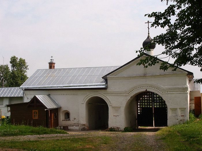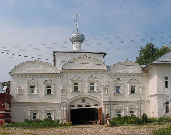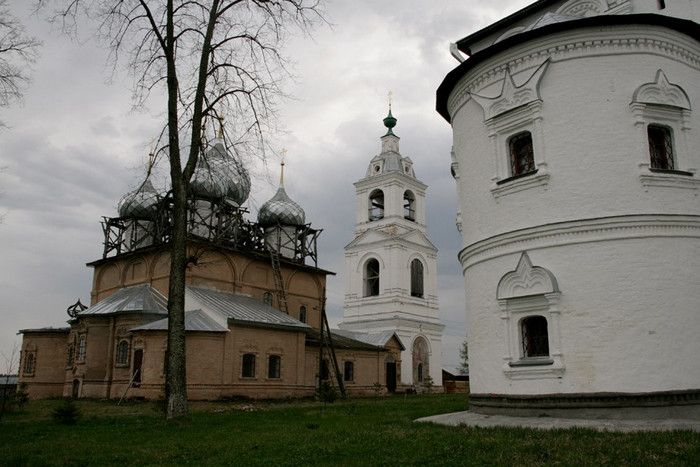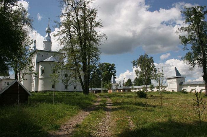 Монастырь, предположительно, основан в начале XV века. Первоначально постройки его были деревянными, каменное строительство началось здесь во второй половине XVII века. К началу XVII века выстроили Никольский собор и трапезную с Введенской церковью. Ансамбль представляет собой традиционную композицию монастырских комплексов XVII-XVIII веков. Прямоугольная в плане территория монастыря ограждена невысокой каменной стеной с восемью разными по форме башнями - круглыми, четырех- и восьмигранными. В центре расположен собор, трапезная, многоярусная колокольня. В монастырь ведут двое ворот - западные, главные (Святые) ворота и восточные - Водяные, обращенные к реке Улейме, чем и объясняется их название. Наиболее интересный памятник ансамбля - трапезная с часозвонницей на фронтоне западного фасада. Трапезная представляет собой целый комплекс объемов. Главный объем - двухэтажное здание самой трапезной палаты. С севера к палате примыкает придел, где расположены сени и жилые помещения. В придел ведет парадное крыльцо - главный вход в трапезную. С востока - одноглавая Введенская церковь, с запада фронтон фасада венчает шатровая часозвонница.