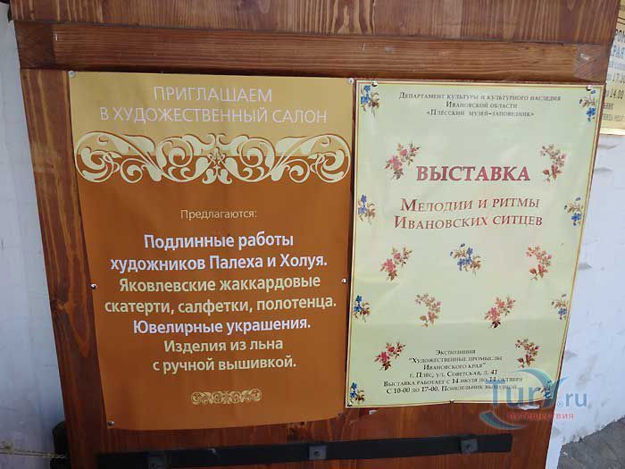 Музей "Художественные промыслы Ивановского края" в Плесе находится на набережной, в здании "Мучных рядов". Здание является памятником архитектуры второй половины XIX века. В экспозиции представлены четыре направления в развитии художественных промыслов Ивановской области -ювелирное искусство, льняное жаккардовое ткачество, лаковая миниатюра Палеха и Холуя, а также оригинальная ивановская вышивка. Особенность экспозиции в том, что наряду с историческими экспонатами, здесь показаны образцы современных изделий. Посетителям предоставляется возможность не только познакомиться с коллекцией, но и приобрести изделия, выполненные современными мастерами.