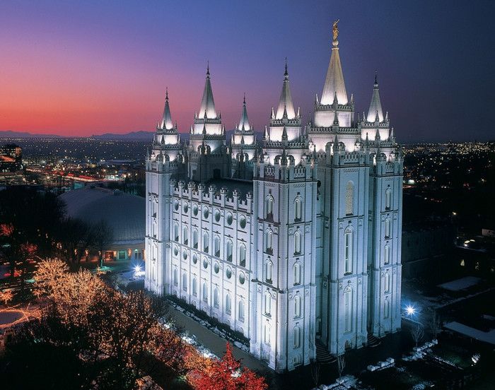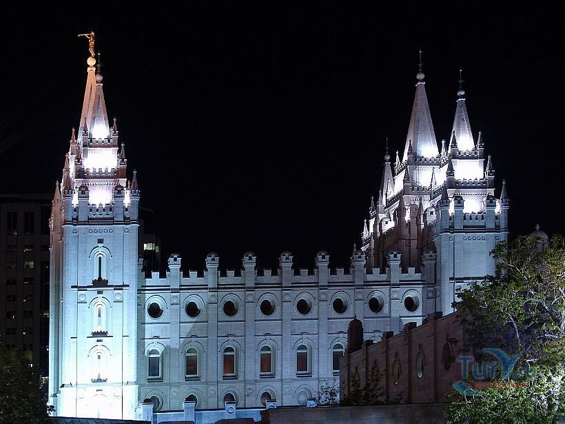 Храм Мормонов расположен в центре города Солт-Лейк-Сити и является одной из его главных достопримечательностей. Готический храм был построен в 1847-1853 годах, его остроконечные башни и шпиль с фигурой трубящего ангела видны из любой точки города. Длина здания - 57 метров, ширина - 36 метров, а толщина несущих стен - 4,9 метра. Самая высокая точка (64 метра) - шпиль восточной башни. На нем стоит фигура Ангела, который будто бы явил в откровении Джозефу Смиту, основателю секты, золотую доску с записанной "Книгой Мормона". Ангел отлит из меди и покрыт золотой фольгой. Рост его - 3,8 метра, а у губ он держит золотую трубу, которой и возвестит о втором пришествии Христа. В храм допускаются только мормоны. Но и вокруг него для туристов найдется немало интересного, и в первую очередь -Тэйбернэкл (Tabernacle -навес, молельня) с крышей в форме черепахи. Кажется, будто крыша длиной 76 и шириной 46 метров снизу вовсе ничем не поддержана. Говорят, проект этой крыши создал сам Бригем Янг. У него была идея выстроить такой зал собраний на 8000 человек, где колонны никому не мешали бы смотреть вперед. Над залом - деревянная куполообразная решетка, по самому краю поддержанная каменными колоннами и скрепленная деревянными штифтами и целой системой гибких зажимов. Кажется, что органные трубы - из металла, балкон - из мрамора, а ряды скамей - из дуба. На самом деле все сделано просто из сосны, но раскрашено так искусно, что это практически невозможно отличить от подлинника. В Тэйбернэк-ле поразительная акустика (слышно в буквальном смысле слова, как муха пролетит), а орган - теперь у него