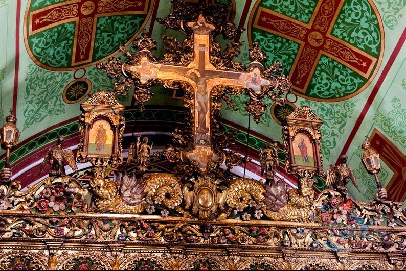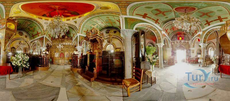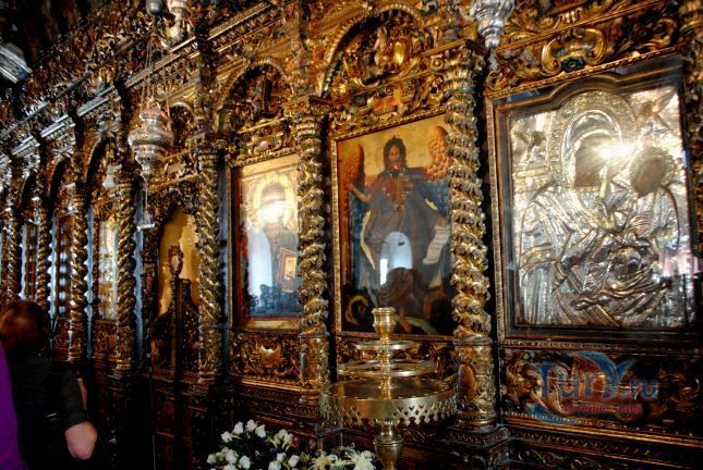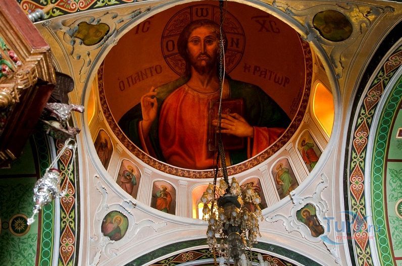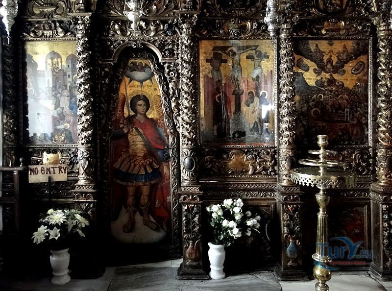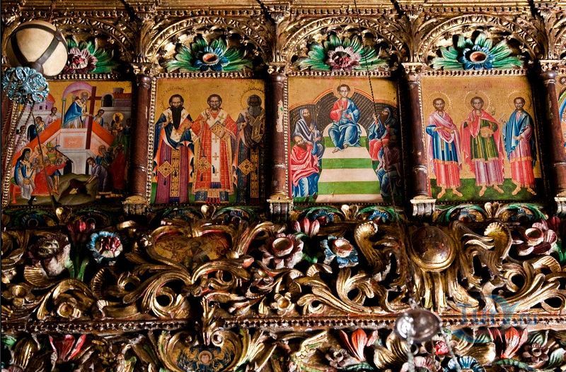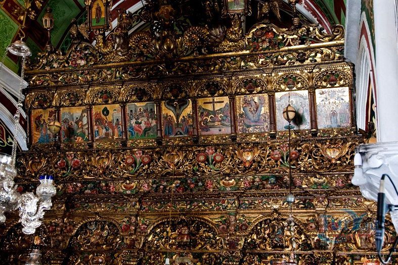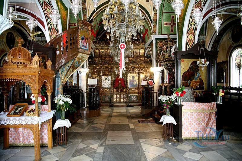 Утверждают, что иконостас, амвон и иконы центрального храма были созданы во Флоренции и Италии в 1775 году. Некоторые детали интерьера указывают на восточное влияние, например, держатели благовоний украшены серебряными драконами. Зал украшен резными фигурками апостолов и большими иконами, иллюстрирующими сцены Нового Завета, маленькими иконами в обрамлении орнамента из зеленых, красных и золотых цветков. В монастыре есть небольшой церковный музей, котором представлены образцы вышивки, литургическое одеяние и резьба по дереву. Во дворе работает отделанный мрамором источник.