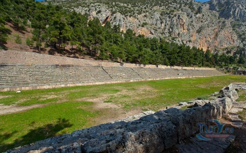 Развалины античного города Дельфы расположены на склоне знаменитой горы Парнас, в 10 км от Коринфского залива в Греции. Древнегреческий город в юго-западной Фокиде, являлся обще греческим религиозным центром с храмом и оракулом Аполлона. Но прославился он тем, что здесь проводились Пифийские игры. "Пифийские игры" (или "Пифии") были после Олимпийских игр вторыми по значимости обще эллинскими играми античности. Первоначально они состояли только из одного вида состязаний - пения под аккомпанемент кифары. Позднее добавились другие художественные и атлетические соревнования, такие как состязания на колесницах и верховая езда. В театре города Дельфы проводились музыкальные соревнования, а на стадионе Дельф - атлетические состязания. Гонки на колесницах устраивались на равнине у соседнего города Криса. Проведение Пифийских игр было запрещено приблизительно в то же время, когда закончилось проведение Олимпийских игр (около 394 г. н. э.).