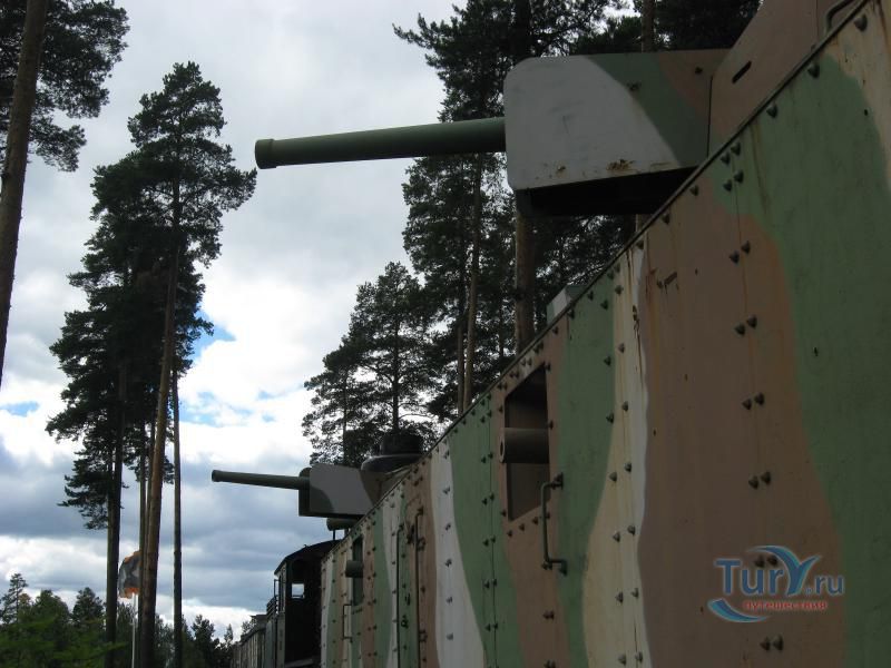 Перед локомотивом расположен вагон, который был захвачен на карельском перешейке во время гражданской войны в 1918 году.