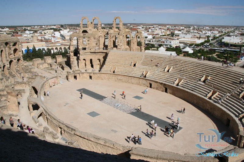 Внушительные руины крупнейшего в Северной Африке амфитеатра, который мог вмещать до 35 тыс. зрителей, обнаружены в небольшом поселении Эль-Джем. Этот памятник III в. иллюстрирует великолепие Римской империи и масштабы ее влияния.