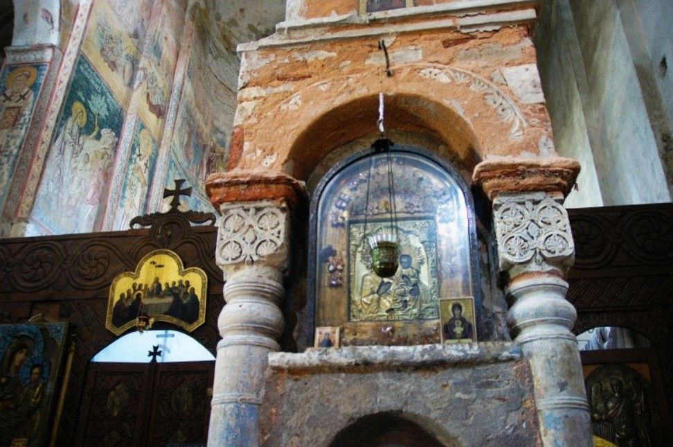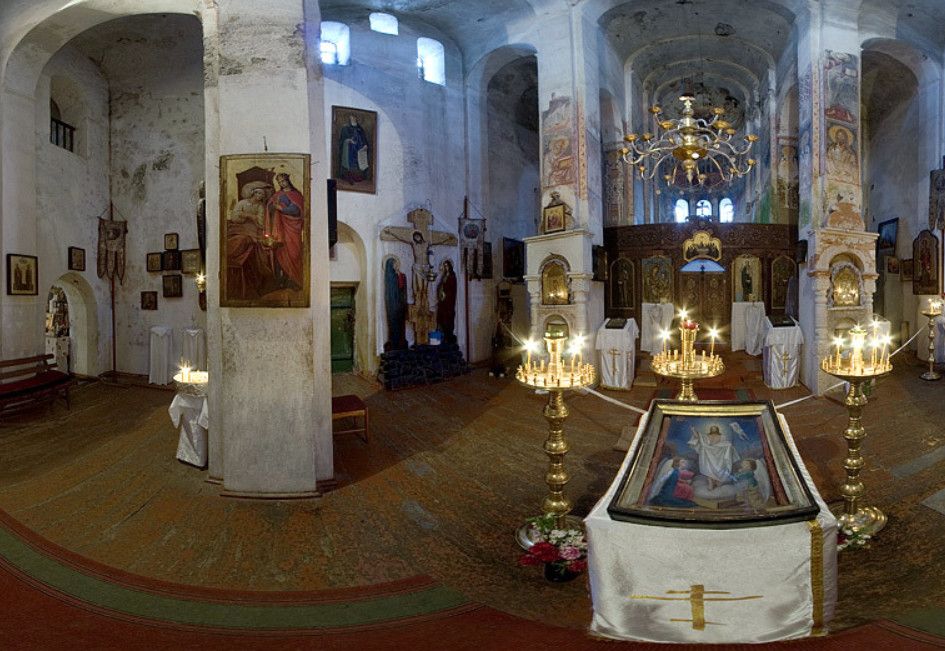 Внутренняя стенная роспись XIV века чрезвычайно богата. В верхней части центральной апсиды изображена сидящая на троне Богоматерь с младенцем и двумя ангелами, многофигурная композиция Евхаристии в двух видах, сцена с женами у гроба, встреча двух жен с воскресшим Христом. В среднем ярусе той же апсиды – сцена гостеприимства Авраама с тремя сидящими ангелами, сцена жертвоприношения Авраама, изображения ангелов и святителей. В нижнем ярусе – фигуры святителей (святого Василия Великого, святого Григория Богослова). На западной стене – фрагменты композиции Успения Богородицы и передачи пояса святому апостолу Фоме.