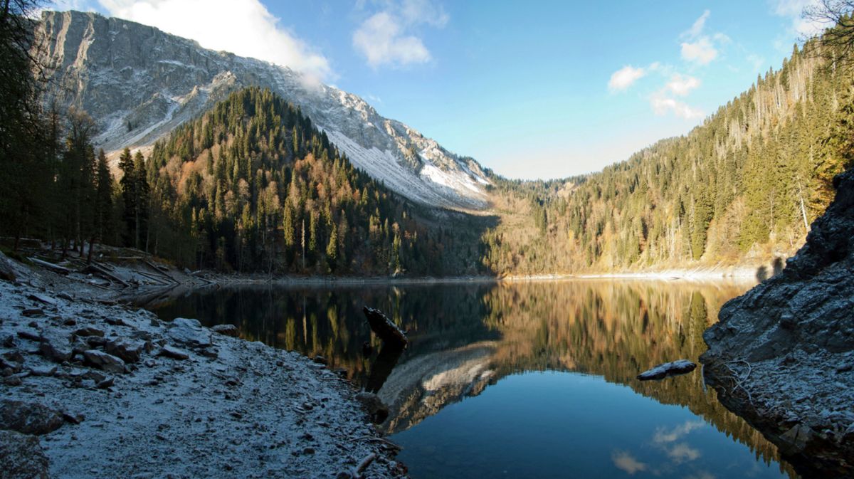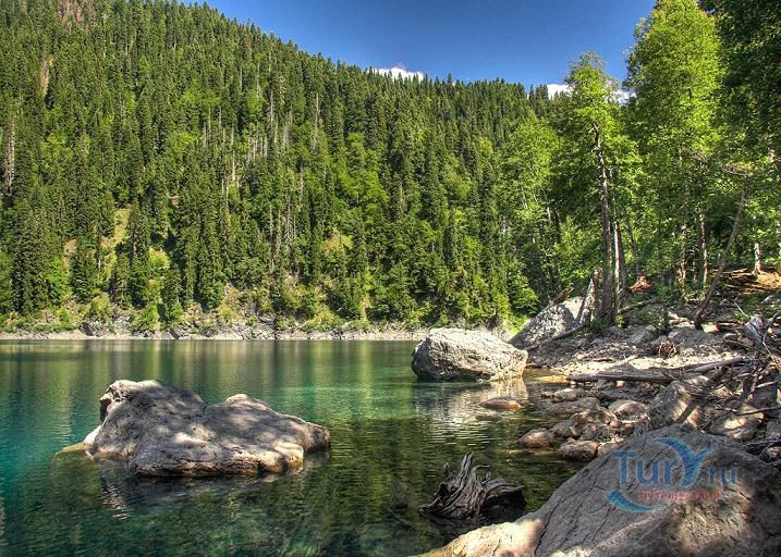 Озеро Малая Рица - одно из самых красивых озер Абхазии, оно расположено в бассейне реки Гега, в 5 км от знаменитой Большой Рицы, на высоте 1235 метров над уровнем моря. Длина озера - 234 метра, ширина - 130 метров, глубина - 80 метров. Вода в озере очень чистая и прозрачная, просматривается до 18 метров в глубину, так как в озеро не впадает ни одна речка (его питают подземные источники). Цвет воды в озере сине-зелёный, иногда - ярко-бирюзовый. В озере водится единственный его обитатель - гребенчатый тритон, занесенный в международную Красную книгу. Озеро Малая Рица поражает своей фантастической красотой, словно переливающийся драгоценный камень, оно находится в оправе снежных горных вершин. Этим завораживающим пейзажем можно любоваться бесконечно.