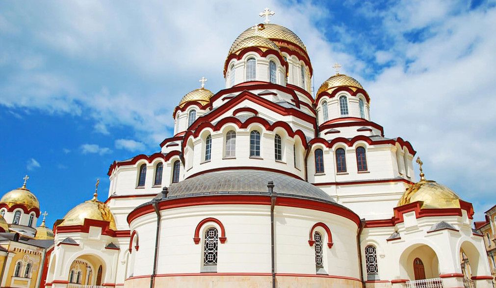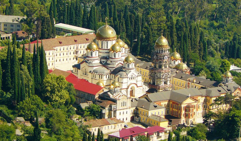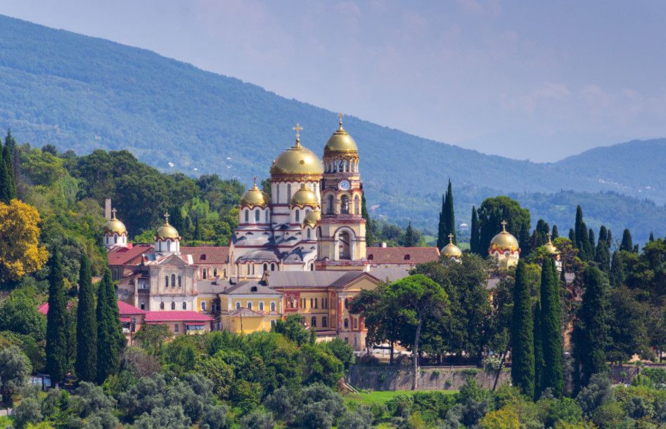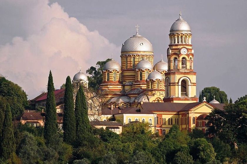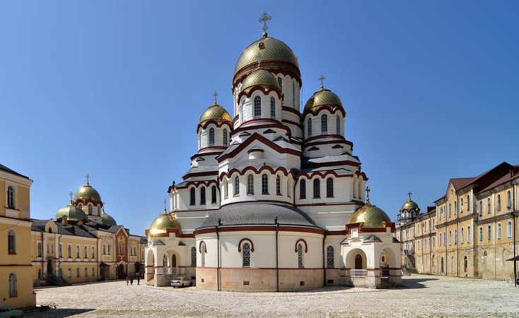 Новоафонский монастырь был основан в XIX веке русскими монахами из знаменитого монастыря на Святой горе Афон в Греции. Это грандиозное и величественное сооружение возводилось на протяжении более 15 лет и сегодня является одной из знаменитейших святынь православия. Монастырь расположен на высоте 75 метров над уровнем моря, у подножия Иверской горы, недалеко от древнего храма Симона Канонита. Издалека монастырь производит впечатление сказочного города из русского фольклора. Те же величественные купола, осененные крестами и золотые маковки церквей. Крупные храмы – трехкупольная церковь Вознесения, Церковь Святого апостола Андрея Первозванного и Церковь Святых угодников Афонских. Рядом с ними широкая, выложенная разноцветной плиткой, дорога, уводящая под высокую арку ворот. В центре западного корпуса возвышается 50-метровая колокольня с часами. Но самое грандиозное сооружение монастыря – это Пантелеймоновский собор. Он не только производит впечатление своими размерами: длина - 53,3 метра , ширина - 33,7 метра, но и поражает красотой и архитектуры и внутреннего убранства. Собор - крупнейшее культовое сооружение Абхазии. В нем может одновременно поместиться более трех тысяч человек.