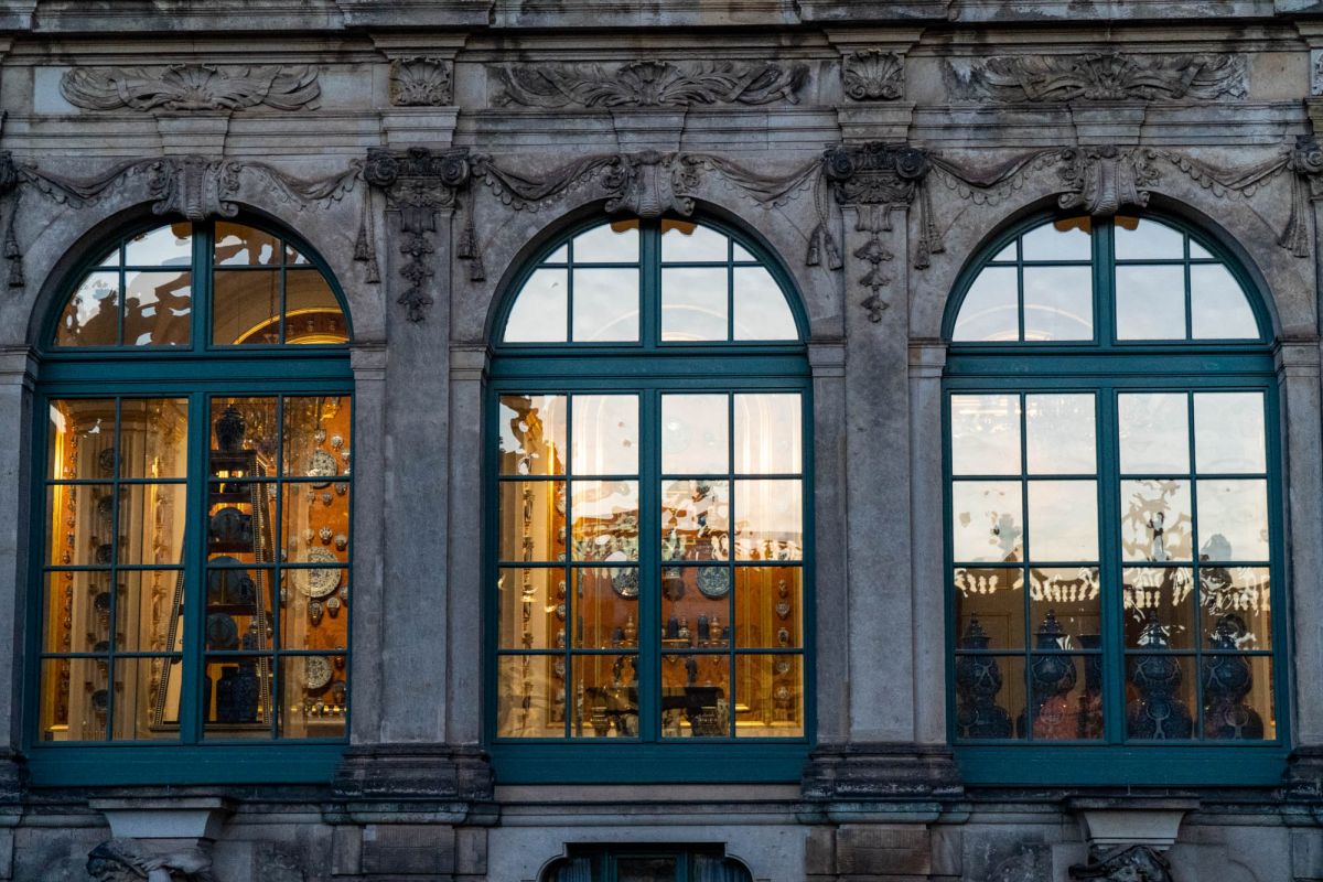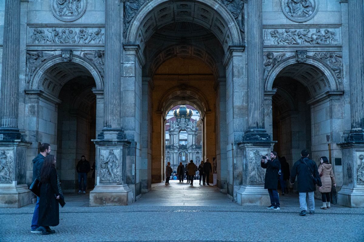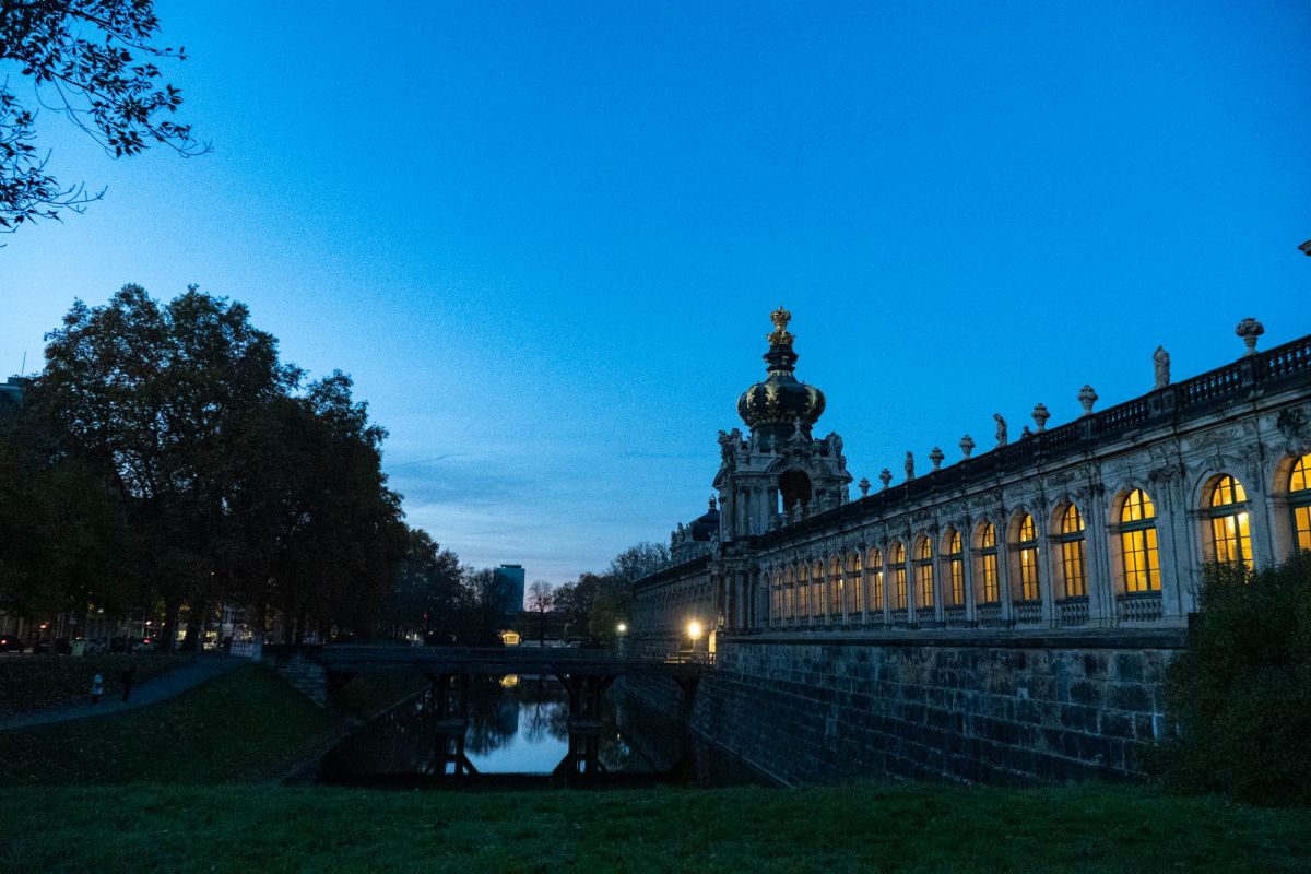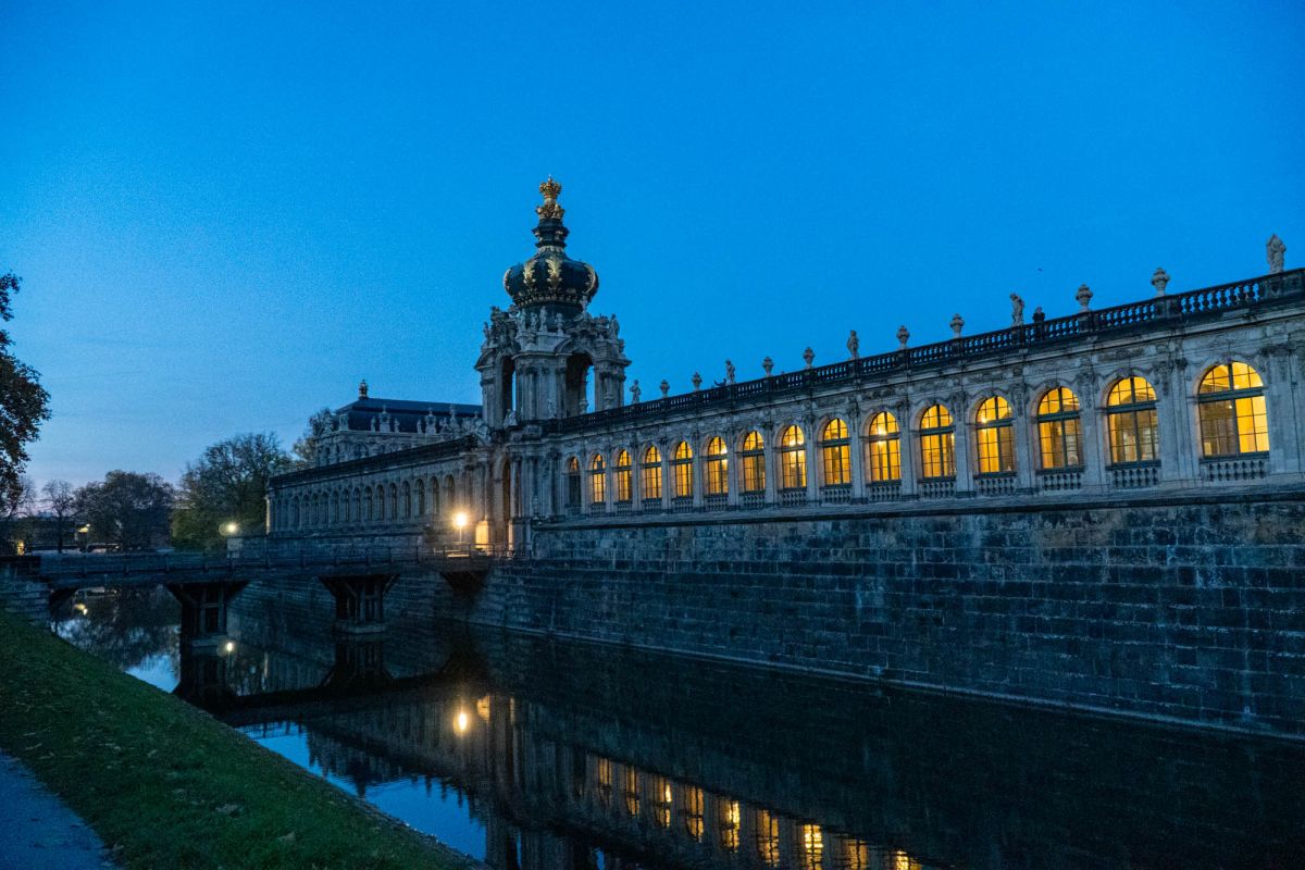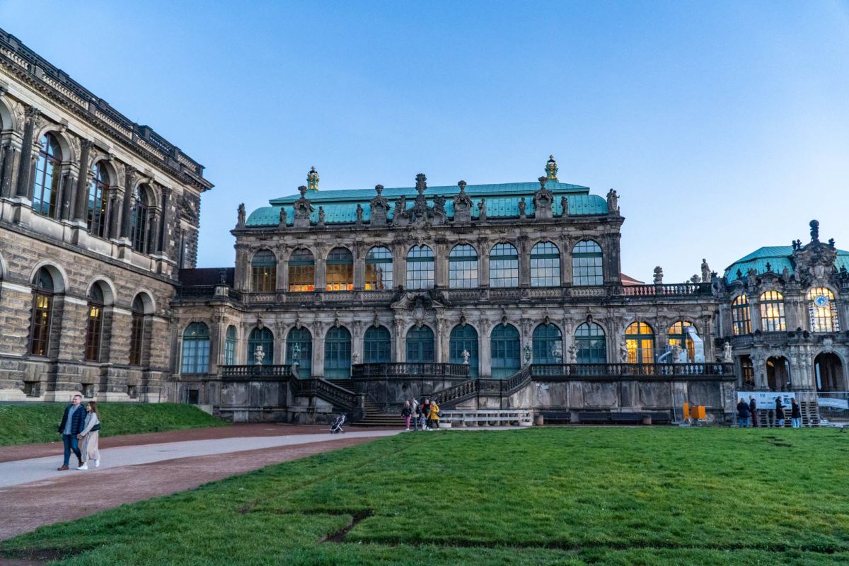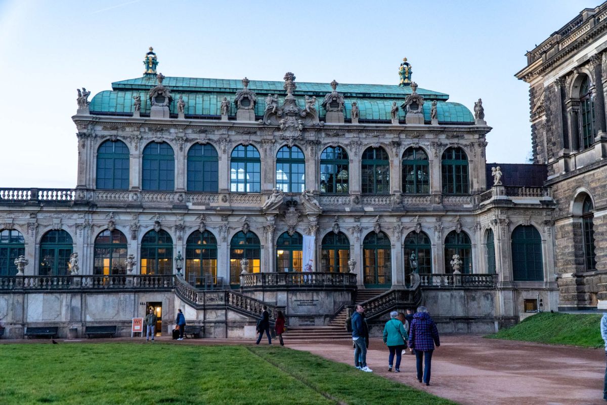 Дрезденский Цвингер - это символ столицы культуры, которая на протяжении столетий как магнит притягивала к себе поэтов и художников, зодчих и музыкантов. Дворцовый ансамбль, находящийся в Альтштадте (Старом городе) Дрездена (Германия), яркий памятник немецкого барокко (1711–1722, арх. М.Д.Пёппельман), состоящий из изящных нарядных павильонов, объединенных галереями, и здания Дрезденской картинной галереи, построенной в стиле неоренессанса (начата в 1847 Г.Земпером, закончена придворным архитектором Крюгером к 1855). Целый комплекс строений сгруппирован вокруг двора с фонтанами: прямые одноэтажные галереи сменяются дугообразными контурами ворот и павильонов. Южной границей Цвингера служат Прямые галереи и Коронные ворота, увенчанные королевской короной из золоченой меди, а северной – пристроенное в середине 19 в. здание Картинной галереи. С восточной и западной стороны композиция почти зеркально повторяется: Закругленные галереи в плане образуют подобие подковы, опирающейся на два небольших павильона. По центру западной «подковы» расположился Павильон на валу. Два небольших павильона, соединенных с ним Закругленными галереями, называются Физико-математическим (по названию коллекции, которая в нем находится почти 300 лет) и Французским, так как на его верхнем этаже размещались картины французских мастеров. За Французским павильоном, примыкающим к Картинной галерее, находится знаменитый грот – Купальня нимф, попасть в который можно, пройдя через первый этаж Французского павильона. Подобная композиция повторяется и на восточной стороне. В центре между обеими восточными Закругленными галереями расположен павильон, называемый Колокольным, так как по обе стороны часов, установленных в его среднем окне, висят белые колокола из мейсенского фарфора, бьющие каждый час. Небольшой прямоугольный павильон, примыкающий к Картинной галерее на восточной стороне, называется Немецким, так как в его верхнем зале расположен отдел немецкой живописи. Подобный же павильон, стоящий перпендикулярно Прямой галерее, – это Павильон, в котором размещается Музей фарфора.