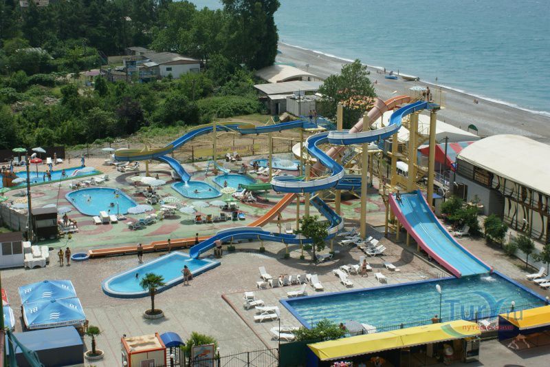 Аквапарк в Гагре - мир головокружительных горок и бирюзовых бассейнов, идеальный способ развлечься всей семьей в жаркий летний день. Этот вид отдыха одинаково хорош как для взрослых, так и для детей. К услугам посетителей аквапарка - скоростная горка, винтовая горка, плавательный бассейн с лежаками и шезлонгами, детский бассейн с горкой, душевые кабинки и раздевалки. Также к услугам посетителей предлагается возможность перекусить в кафе-баре со спутниковым телевидением и широким ассортиментом блюд и напитков. Каждый день гостей ждут выступления музыкантов, веселье и зажигательная дискотека до рассвета. Гагрский аквапарк – это место отдыха для всех возрастов. Аквапарк расположен на берегу моря возле гостиницы «Абхазия». Рядом с аквапарком расположен целый комплекс развлечений – вдоль набережной к услугам туристов многочисленные рестораны, кафе, дискотеки, детская игровая площадка.