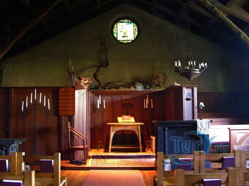 Очень необычны поддерживающие потолок земляничные деревья - идея молодого Майбека. По легенде эти стволы выбирали в лесу Санта-Круз и заворачивали в специальную ткань, чтобы избежать повреждения, а уже потом доставляли поездом.