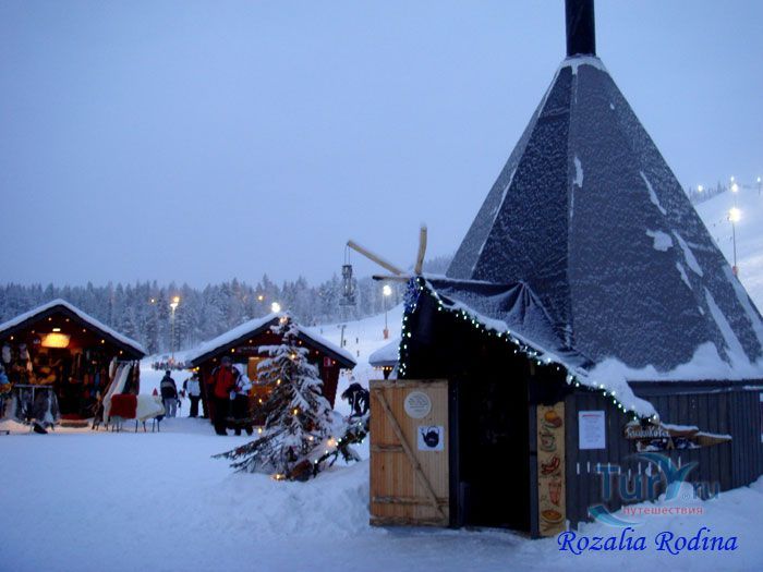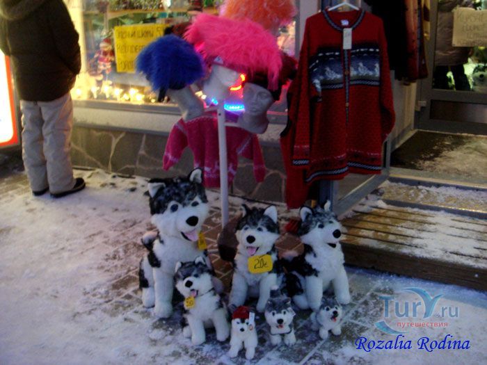 Рядом с горнолыжными склонами полукругом стоят деревянные домики, в которых вы можете купить не только сувениры, а и санки разнообразных расцветок, хорошим дополнением к которым будет овечья или оленья шкура, продающаяся тут же.