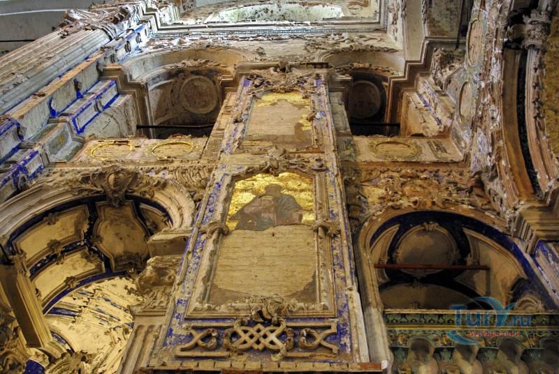 Огромный храм лишь приблизительно повторяет иерусалимский образец, первоначально его задумали как очень сложное сооружение, вмещавшее 356 приделов по числу дней в году. Но от этой мысли во время начавшейся постройки пришлось отказаться. Тем не менее храм выглядит как весьма сложное сооружение. Главы подземной церкви вырастали почти что из-под земли. За нам виднелась основная часть - храм Воскресения, завершенный могучей главой на крестчатом основании. Далее высился огромный каменный шатер, устроенный над часовней Гроба Господня. Размер шатра бал настолько велик, что зодчие не сумели его достаточно прочно построить, и он рухнул в 1723 году без всякой видимой причины.