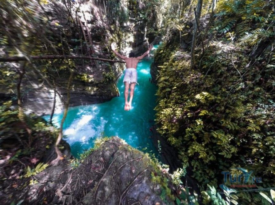 Водопад Кавасан - один из красивейших водопадов на Филиппинах, расположен на юго-западном побережье острова Себу, в горах Барангай Матутинао, в муниципалитете Бадиан. Трёхуровневый каскадный водопад с кристально чистой бирюзовой водой расположен посреди тропических джунглей, в окружении пышной зелени и каменных сводов речных каньонов. Струи воды мощным потоком обрушиваются в природные бассейны, в которых можно искупаться. Вода здесь прохладная даже в самую сильную жару, поэтому водопад очень популярен среди местных жителей и туристов - освежиться и полюбоваться красотами дикой природы приезжают много людей, особенно в выходные дни. Наиболее многолюдно у первого (нижнего), самого большого каскада, для отдыхающих здесь созданы комфортные условия - есть кафе, душевые и туалеты, можно арендовать стол для пикника и открытый коттедж, взять в аренду бамбуковый плот, чтобы покататься на нём по бассейну у подножия водопада и, даже, заплыть под струи воды, испытав на себе освежающее действие "холодного душа". Чтобы попасть ко второму каскаду, необходимо подняться по тропе со ступенями (подъём занимает около 15 минут). На втором уровне водопада туристов намного меньше, но все равно здесь достаточно многолюдно. Любители тишины и уединения должны подняться ещё выше - на третий уровень водопада Кавасан. К нему ведёт крутая горная тропа, подниматься по которой довольно трудно (желательно иметь удобную обувь с ребристой подошвой) - на некоторых участках приходится буквально карабкаться вверх и продираться через густые заросли. Зато красота первозданной природы, отсутствие шумных отдыхающих и чистейшая аквамариновая вода родникового источника Кабукалан, бьющего рядом с третьим каскадом водопада, полностью окупают затраченные на подъём усилия. Любители спокойного отдыха могут полюбоваться красивыми видами, сделать отличные фотографии (для этого лучше приезжать к водопаду Кавасан рано утром или на закате) или поплавать в природном бассейне, а любители экстрима имеют возможность заняться каньонингом - преодолеть крутые речные пороги и многочисленные каньоны, а также совершить головокружительный прыжок со скалы в глубокий природный бассейн.