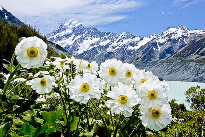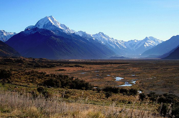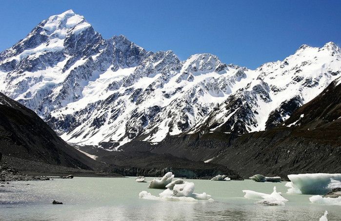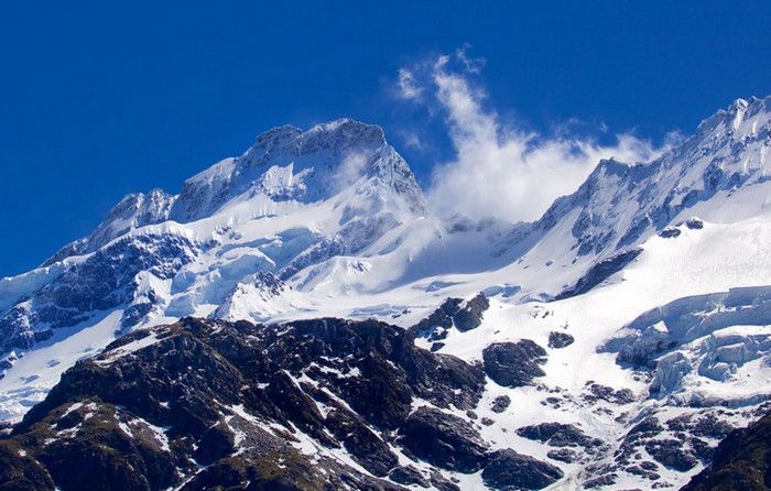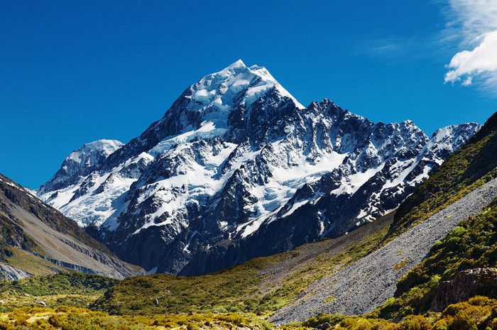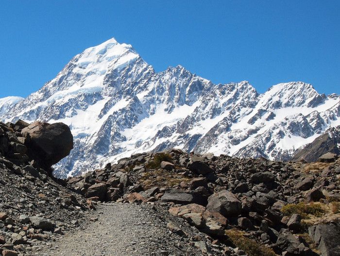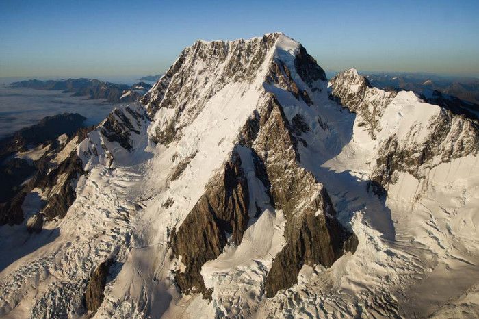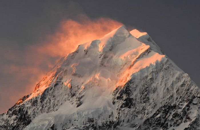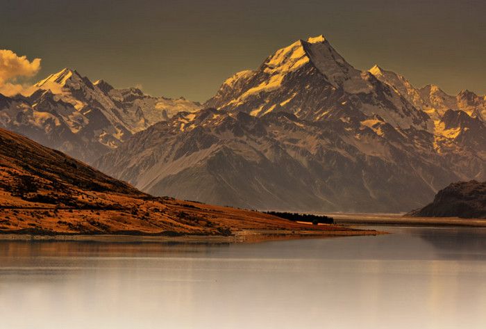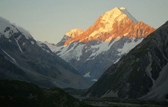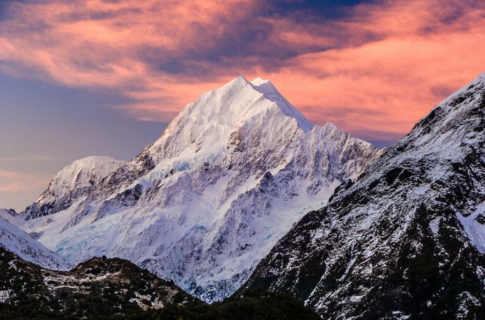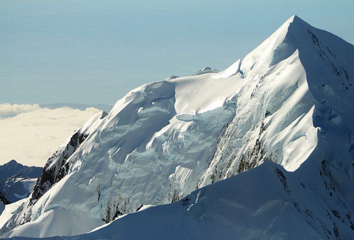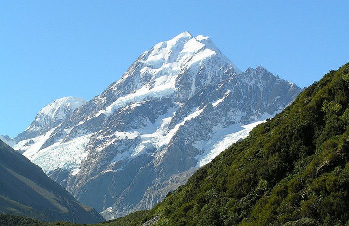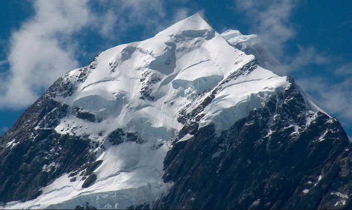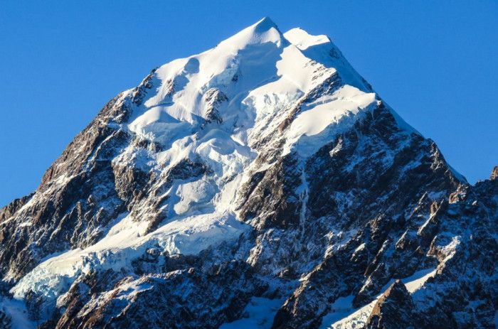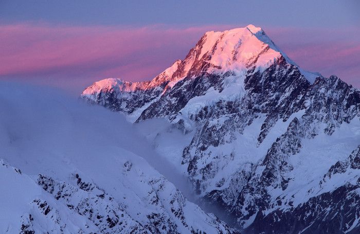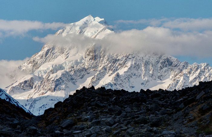 Гора Кука (Аораки) - наивысшая точка Новой Зеландии, высота которой составляет 3754 метра над уровнем моря, расположена в западной части Южного острова, в новозеландских Южных Альпах, на территории Национального парка Маунт-Кук. Гора состоит из трёх пиков - самый низкий из них имеет высоту 3593 метра над уровнем моря, средний - 3717 метров и самый высокий - 3754 метра (совсем недавно его высота равнялась 3764 метрам, но из-за сильного оползня, произошедшего 14 декабря 1991 года, гора стала ниже на 10 метров). Гора Кука сложена из кристаллических пород, имеет форму седла с крутыми склонами, а её вершина покрыта вечными снегами и ледниками. Вдоль восточного фланга горы спускается знаменитый ледник Тасмана - крупнейший ледник в Новой Зеландии, протяжённостью 29 километров и площадью 156,5 квадратных километров. Нижняя часть горных склонов покрыта уникальными дождевыми лесами умеренного климата и живописными альпийскими лугами, в которых произрастают эндемичные виды растений и редкие виды животных, встречающиеся только в Новой Зеландии. Для маори, коренного населения Новой Зеландии, Аораки является священной горой, на языке племени Нгай Таху название горы означает "большое белое облако". Существует красивая местная легенда о происхождении горы, которая рассказывает о том, как сыновьях Ранги (Небесного Отца) отправились в плавание на каноэ вокруг Папатуануку (Матери Земли). Во время плавания их лодка села на риф, и чтобы не утонуть, братья взобрались на нос каноэ, но налетевший холодный ветер обратил их в камень. Каноэ (у маори оно называется вака) превратилось в Южный остров (Те Вака о Аораки), а братья стали вершинами Южных Альп - так как юноша по имени Аораки был самым высоким из братьев, его именем и была названа гора Аораки. Английское название Mount Cook (Гора Кука) дал горе в 1851 году капитан Джон Лорт Стокс в честь знаменитого мореплавателя Джеймса Кука, исследовавшего побережье Новой Зеландии и открывшего пролив, разделяющий её на два острова. Интересно, что саму гору Джеймс Кук даже не видел - первым европейцем, увидевшим Аораки, был голландский мореплаватель Абель Тасман, высадившийся на берег Южного острова в 1642 году. Первая попытка подняться на Аораки была предпринята в 1882 году - вершину штурмовали ирландец Уильям Споттвуд Грин и швейцарцы Эмиль Босс и Ульрих Кауфман. Когда до вершины оставалось всего 200 метров, альпинисты вынуждены были завершить восхождение из-за сильного снегопада. Покорить гору Кука удалось в 1894 году трём новозеландцам - Тому Файфу, Джеку Кларку и Джорджу Грэму. Первой женщиной, поднявшейся на гору, стала австралийка Фреда Ду Фоур - она совершила восхождение в 1910 году, а в 1916 году на Аораки, в сопровождении знаменитого австрийского горного проводника Конрада Каина, поднялась 57-летняя новозеландская альпинистка Джейн Томсон. С момента открытия горы европейцами, её вершина постоянно манит альпинистов со всего мира. Несмотря на то, что Аораки - далеко не самая высокая гора на планете, она является технически очень сложной для восхождения. Огромную опасность для альпинистов представляют резкая смена погоды, сильные снегопады, высокий уровень обледенения скал, большие трещины ледников и высокая вероятность внезапного схода лавин. Только с начала XX века при восхождении на гору Кука погибло около 80 альпинистов, что делает её самым 