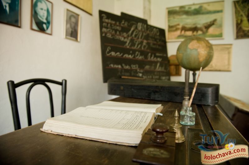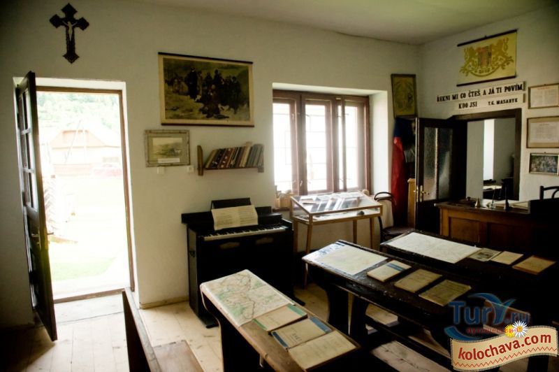 Партитура на фортепиано приглашает исполнить гимн республики и географическая и физическая карты тогдашней страны показывают просторы Чехословакии от Шумавского до Карпатского хребта. Ученики чешской школы носили деревянные пеналы пользовались чернильницами и перьями, громоздкими циркулями и тяжелыми геометрическими фигурами. На школьных полках - произведения чешских писателей и классные журналы с оценками колочавских учащихся.