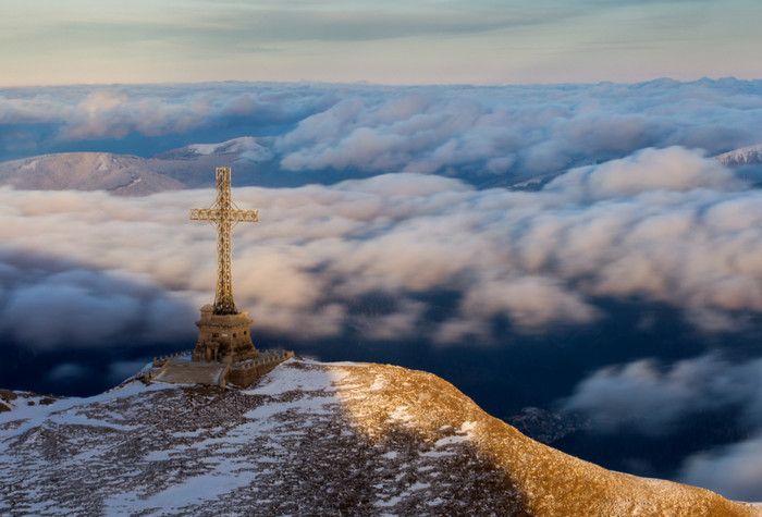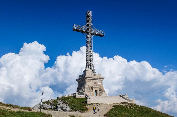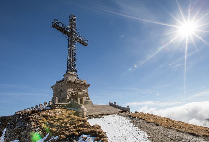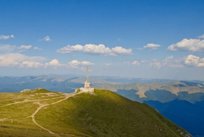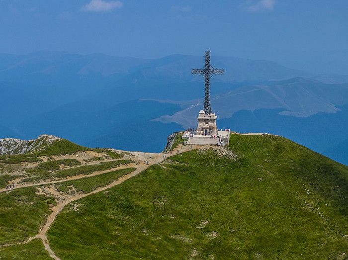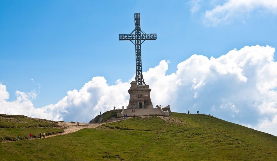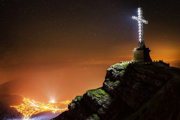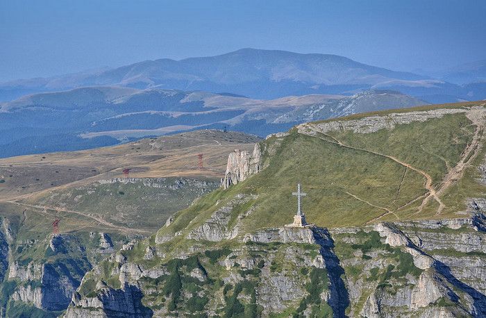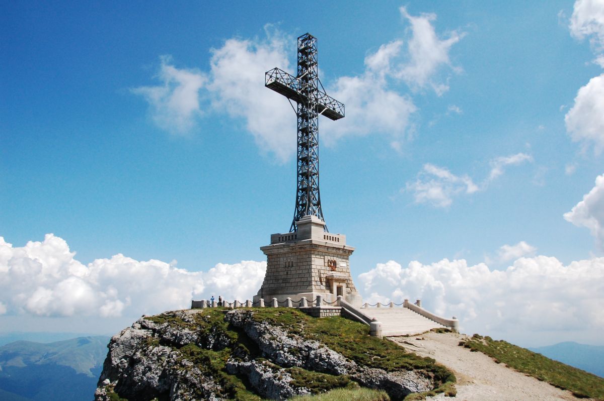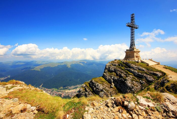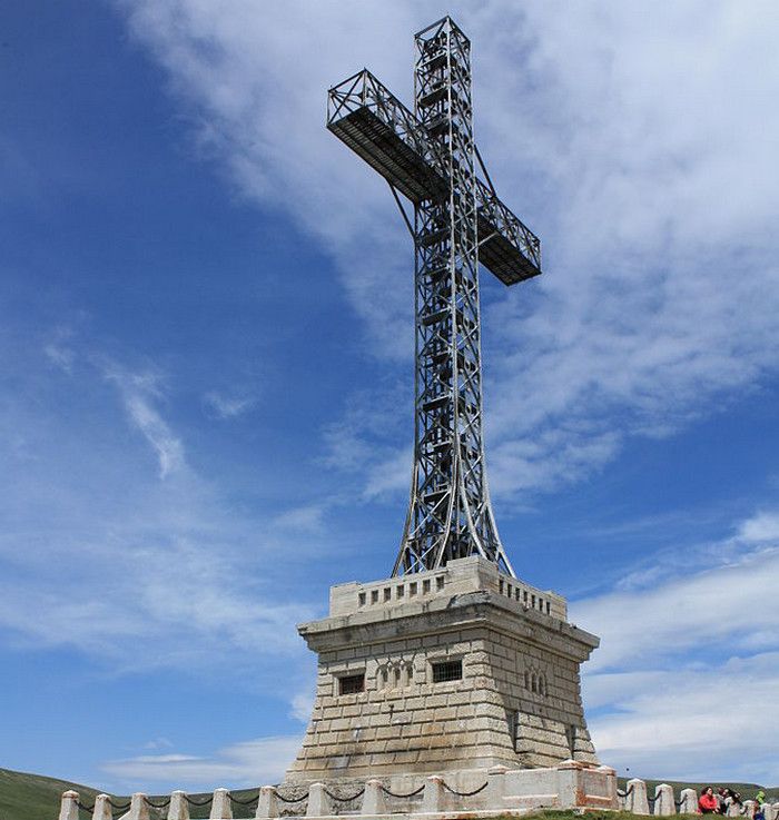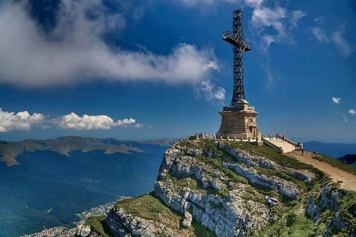 Карайманский крест или Крест Героям Отечества стоит на горе Карайман, на самом краю исполинского обрыва, спускающегося к городу Буштень. Этот монумент был построен в 1928 году в память о румынских солдатах, защищавших перевал от немецких и австрийских войск во время Первой мировой войны, и в то время казался румынам настоящим чудом. Снизу монумент кажется небольшим, он расположен на высоте 2291 метров, и на самом деле является впечатляющим сооружением, высота которого составляет 35 метров, а длинна перекладины - 14 метров. Крест на Караймане и сейчас производит сильное впечатление, особенно если не только увидеть его снизу, но и дойти до вершины, на которой он стоит. Но особенно он впечатляет ночью, когда включаются покрывающие его лампы, и крест кажется летящим в пустоте черного неба.