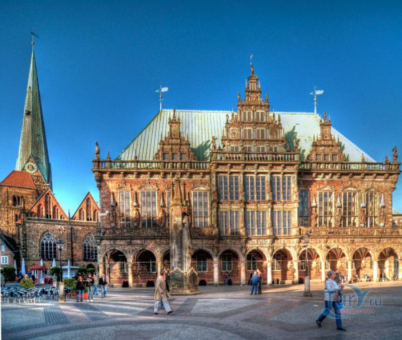 Бременская Ратуша - символ немецкого города Бремен, расположена в самом центре города, на Рыночной площади, рядом с Кафедральным собором. Здание городской ратуши Бремена признано шедевром кирпичной готики и ярким примером "везерского ренессанса" - архитектурного стиля, объединившего в себе черты итальянского и западноевропейского Возрождения. Ратуша была построена в 1405-1409 годах как символ свободы и независимости вольного имперского города Бремен, вошедшего в состав Ганзейского союза, вышедшего из-под власти архиепископа Бремена и достигшего к началу XV века своего наибольшего расцвета. Первоначально здание ратуши было построено в стиле кирпичной готики и представляло собой двухэтажное здание с двумя большими залами - Нижним и Верхним, и несколькими отдельными кабинетами в северной части здания. У стен ратуши были установлены статуи императоров и курфюрстов, пророков и древних философов. В таком виде здание просуществовало до конца XVI столетия, пока напротив него купеческая гильдия Бремена не построила на свои деньги здание торговой палаты (Schütting), затмившее своим великолепием Бременскую ратушу. Городской совет Бремена посчитал, что скромный облик готической ратуши более не соответствует её представительским целям и принял решение о перестройке здания в стиле "везерского ренессанса", которая и была проведена в 1608-1612 годах под руководством архитектора Людера фон Бентхайма. Средняя часть здания была снесена, а на её месте появился стеклянный эркер, увенчанный фламандским фронтоном. Окна здания были значительно увеличены в размере, фасад украшен рельефами, декоративными фризами и скульптурными изображениями людей, ангелов и мифических животных, выполненными нидерландскими скульпторами Гансом Вредеманом де Врисом, Хендриком Гольциусом и Якобом Флорисом. Нижний ярус центрального фасада ратуши украсила галерея из одиннадцати полукруглых арок, богато украшенных декоративными элементами, у главного входы в здание были установлены конные статуи рыцарей в средневековых доспехах. В начале XX века к Бременской ратуши было пристроено здание Новой ратуши в стиле неоренессанса, автором проекта которого является архитектор Габриэль фон Зайдль. Зодчему удалось гармонично соединить в одно целое оба здания - при том, что новое здание почти в два раза больше старого, Новая ратуша не доминирует над старой частью, а подчёркивает своим более скромным фасадом его красоту и величие. На втором этаже ратуши расположен Верхний зал - зал, в котором на протяжении столетий собирался Городской совет Бремена, принимались законы и устраивались приёмы в честь иностранных послов. В наши дни здесь проводятся концерты и торжественные приёмы. Резной деревянный потолок зала украшен портретами германских императоров, на стенах - фрески, выполненные в XVI веке кёльнским художником Бартоломеусом Брейном, на которых изображены основатели Бремена - император Карл Великий и епископ Виллегад. В Верхнем зале также можно увидеть макеты кораблей XVI-XVIII веков, вошедших в историю торгового флота Бремена. Зал сената - зал в котором каждый вторник за большим овальным столом проходят заседания Городского совета Бремена. Его стены покрыты красно-коричневыми шёлковыми обоями, на потолке - лепнина и огромные хрустальные люстры, пол устилает огромный ковер с вы