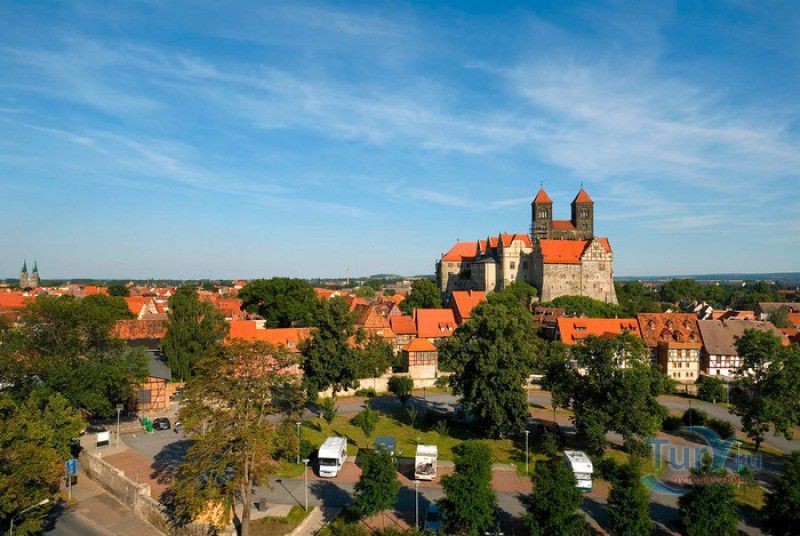Монастырская Церковь Святого Серватия в Кведлинбурге - романская церковь бывшего Кведлинбургского аббатства, основанного в 936 году Оттоном I Великим по просьбе своей матери, королевы Матильды, второй жены первого германского короля Генриха I Птицелова. Монастырь был построен на территории замка, возведенного Генрихом I на вершине Замковой горы Кведлинбурга. В средние века Кведлинбургское аббатство (Вольное светское Имперское аббатство в Кведлинбурге) считалось одним из самых больших и влиятельных в Священной Римской империи. Монастырём и городом, возникшим у подножия Замковой горы, управляла аббатиса, которой могла стать только одна из дочерей царствующей королевской семьи. Светский статус настоятельницы монастыря приравнивался к статусу княгини Священной Римской империи, по церковной иерархии аббатиса была выведена из подчинения главы своей епархии и подчинялась напрямую римскому папе. На месте небольшой замковой часовни, в которой в были похоронены король Генрих I и королева Матильда, в конце X века было начато строительство большой монастырской церкви, более соответствующей престижу Кведлинбургского аббатства. Возведение церкви (трёхневной базилики в романском стиле) было завершено в 1021 году, 21 сентября 1021 года она была освящена в честь Святых Серватия Маастрихтского и Дионисия Парижского. На церемонии освящения присутствовал император Генрих II. В 1070 году в церкви вспыхнул пожар, практически уничтоживший здание. Реконструкция церкви длилась почти шесть десятилетий, и в 1129 году, в присутствии императора Лотаря III, восстановленная в своем первоначальном виде базилика была вновь освящена. В 1320 году, при аббатисе Ютте фон Кранихфельд, восточный хор был перестроен в готическом стиле (в 1938-1940 годах заменен на неороманский), а в в 1863-1882 годах к нему были пристроены две неороманские башни с острыми шпилями, которые в 1946 году заменили на невысокие шатровые крыши. Здание Коллегиатской церкви впечатляет своими размерами, декоративным оформлением фасадов и богатым внутренним убранством. Неф церкви разделен на проходы аркадами из колонн, второй этаж по периметру опоясывает крытая галерея, фризы, капители и импосты (карнизы над пилястрами) колонн внутри церкви украшены скульптурным декором (в орнаменте преобладают растительные и анималистические мотивы). От романской архитектуры в церкви сохранились главный вход на северной стене фасада и крипта, в которой находятся гробницы короля Генриха I и Святой Матильды, а также романские и готические скульптурные надгробия аббатис монастыря, в том числе Матильды - дочери Оттона I, Адельгейды I - сестры Оттона III и Беатрикс I - дочери Генриха III. Своды нефа и крипты украшает хорошо сохранившаяся до наших дней потолочная роспись, датируемая началом XII века. К алтарной части церкви пристроена монастырская сокровищница, в которой хранятся дары представителей Оттоновской династии Кведлинбургскому аббатству (сокровищница считается богатейшей в Германии). В годы Второй мировой войны сокровища монастыря были спрятаны в глубокой штольне, расположенной на окраине города. Но в 1945 году клад был обнаружен лейтенантом американской армии Джо Томом Мидором - бесценные реликвии были вывезены в США и только в 1987 году возвращены в сокровищницу Кведлинбургского аббатства. Среди раритетов, хранящи