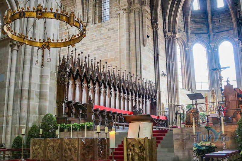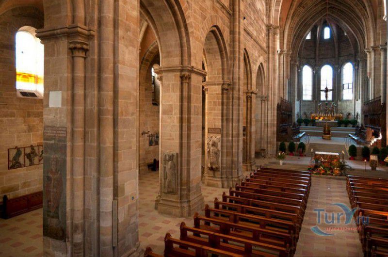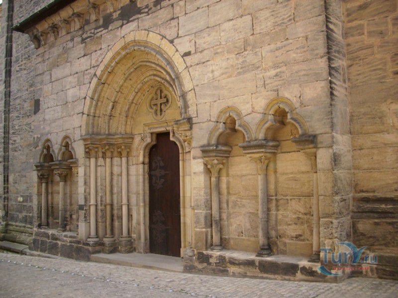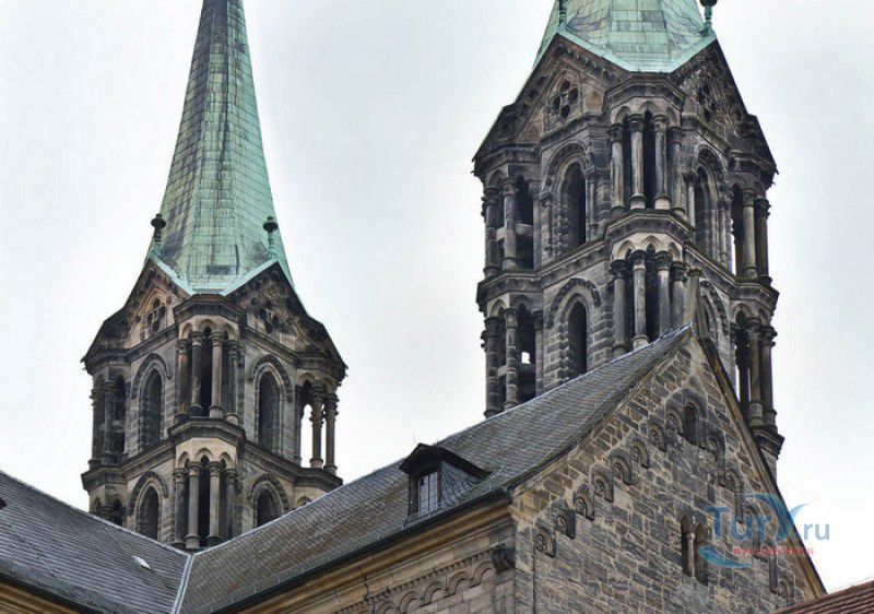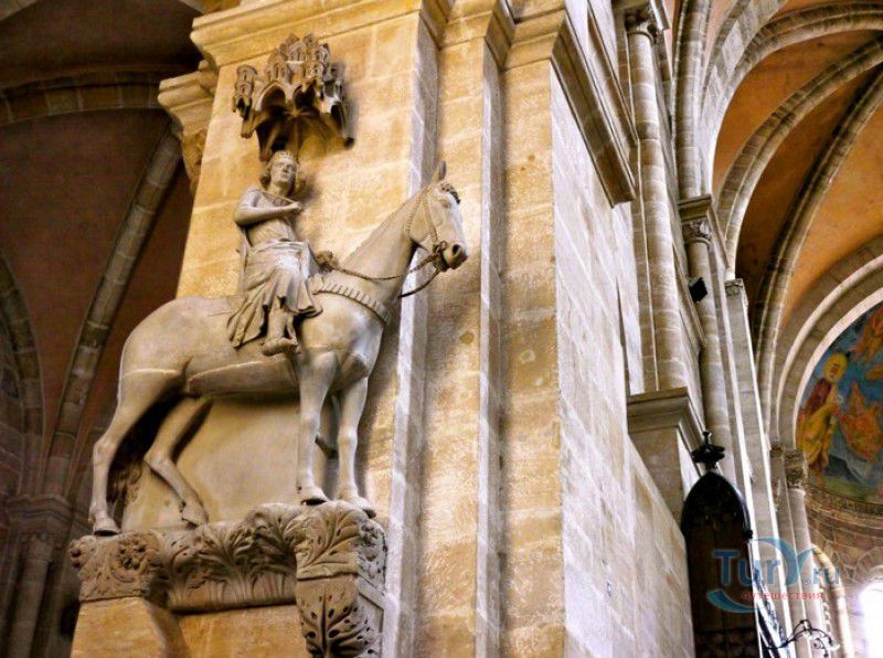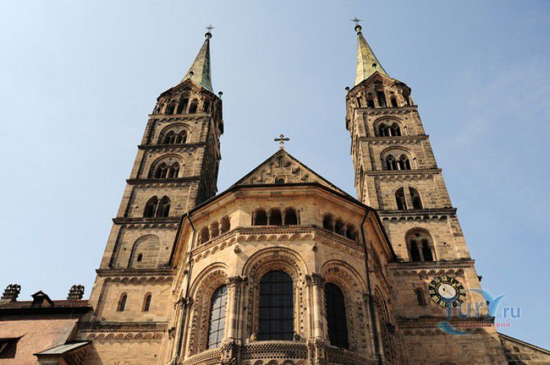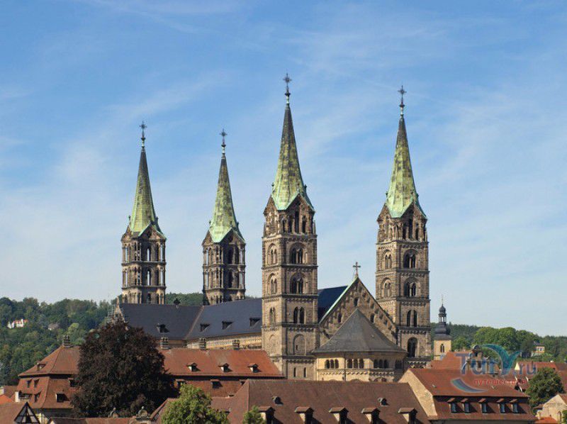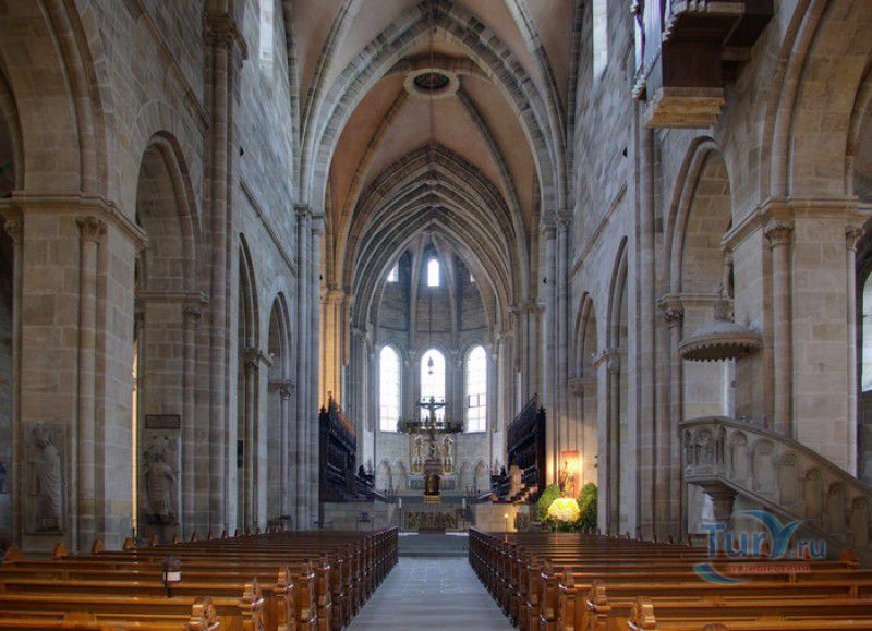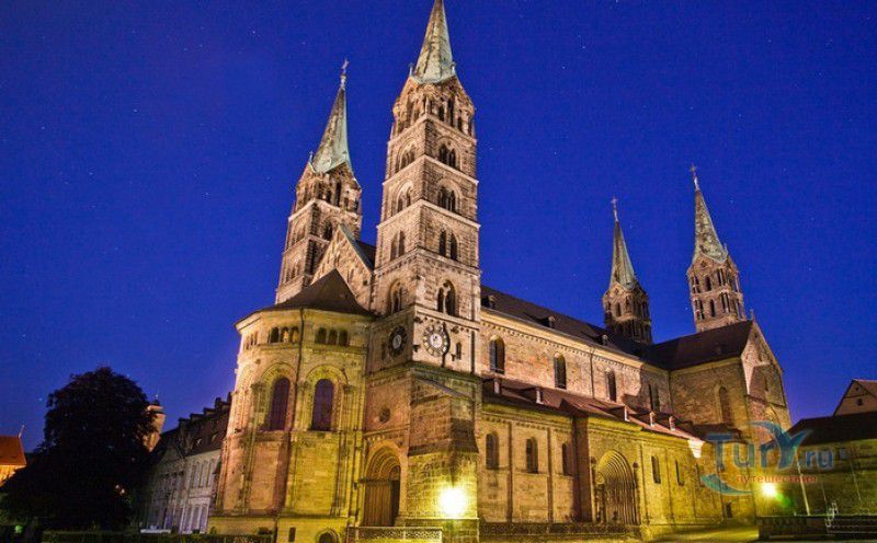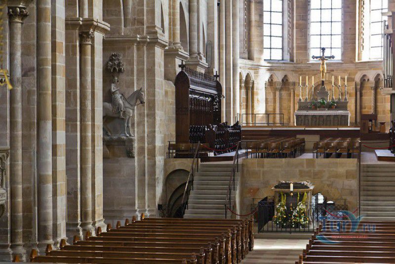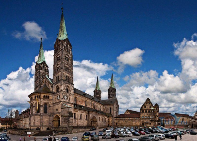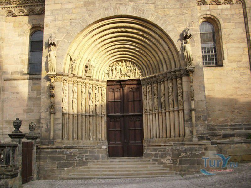 Кафедральный Собор в Бамберге (Кафедральный Собор Святого Петра и Святого Георгия в Бамберге) - один из семи имперских соборов Германии, расположен в историческом центре города Бамберг, в составе которого в 1993 году внесен в список всемирного наследия ЮНЕСКО. Возведение собора было начато в 1004 году по приказу императора Священной Римской империи Генриха II Святого. Работы велись 8 лет и завершились в 1012 году, в этом же году собор был освящён в честь Святых Петра и Григория. На церемонии присутствовали сам император Генрих II, тридцать шесть епископов и толпы простых верующих. Но уже в 1081 году первый собор был полностью уничтожен во время сильного пожара, его отстроили заново, но в 1185 году храм снова сгорел. Собор решили не восстанавливать, а строить на его месте новый. Возведение третьего по счёту собора было начато в 1215 году, а освящён он был 6 мая 1237 года. Архитектурный стиль Кафедрального собора в Бамберге представляет собой смесь позднего романского и раннего готического стилей - при строительстве нового здания использовали уцелевшие фрагменты более раннего храма, построенного в романском стиле. Собор представляет собой трёхнефную базилику с четырьмя башнями - восточными, построенными в романском стиле, и готическими - западными. Высота восточных башен - 76 метров, западных - 74 метра. Собор имеет неф с восточным и западным хорами, северный и южный трансепты, боковые капеллы и два склепа (западный и восточный). Главный вход в собор носит название Королевский портал, он расположен на северной стороне нефа. Тимпан портала украшен барельефом "Страшный суд" и статуями пророков Ветхого Завета и апостолов Нового Завета. С южной стороны находится портал Адама, который служил входом в собор для простых верующих. С правой стороны от входа размещены статуи Евы, Адама и Святого Петра, с левой - Святого Стефана, императора Генриха Святого и императрицы Кунигунды. В северо-восточной башне расположены портал Марии, в северной стене трансепта - портал Файт. Если внешний облик собора с тех времён почти не изменился, то интерьер на протяжении веков подвергался многократным перестройкам. Так, в 1648-1653 годах внутреннее убранство собора было оформлено в стиле барокко и оставалось таковым до середины XIX столетия. В 1826 году, во время своего визита в Бамберг, Людвиг I Баварский посетил собор и "пришёл в ужас" от плачевного состояния величественного храма и уродующей его художественный вид реконструкции, выполненной в стиле барокко. Монарх велел архиепископу Бамберга немедленно приступить к работам по возвращению храму его первоначального средневекового вида. Реставрационные работы велись в 1829-1837 годах под руководством архитектора Фридриха фон Гертнера. Интерьер собора богато украшен рельефами и скульптурами, великолепными алтарями, дубовые резные скамьи хора, выполненные в 1380 году, считаются шедевром готического зодчества. Одна из главных достопримечательностей собора - знаменитая скульптура "Бамбергский всадник", датируемая 1230 годом. Скульптура находится у входа в восточный хор, на северном пирсе. Статуя лошади и всадника, выполненные из песчаника, являются одним из самых известных скульптурных произведений немецкого средневекового искусства. Достоверно неизвестно чьё изображение увековечено в камне, наиболее вероятно, что всадник - это Иштва
