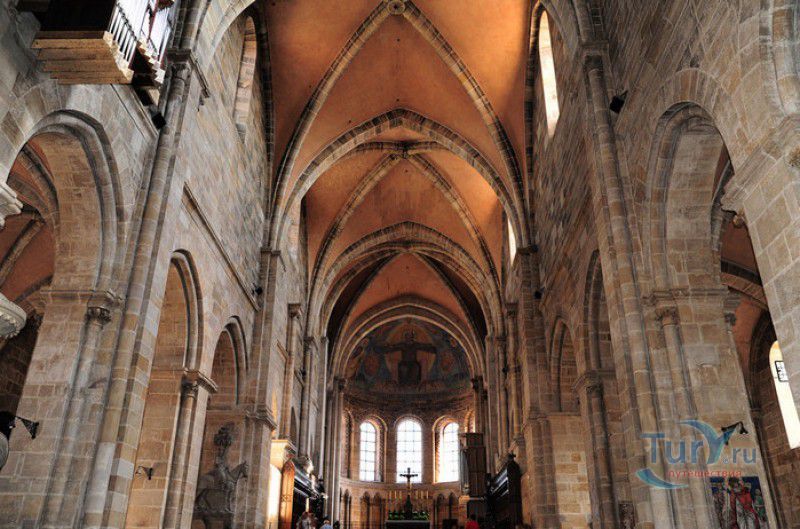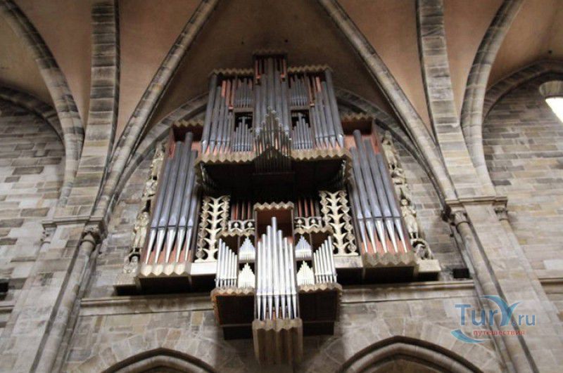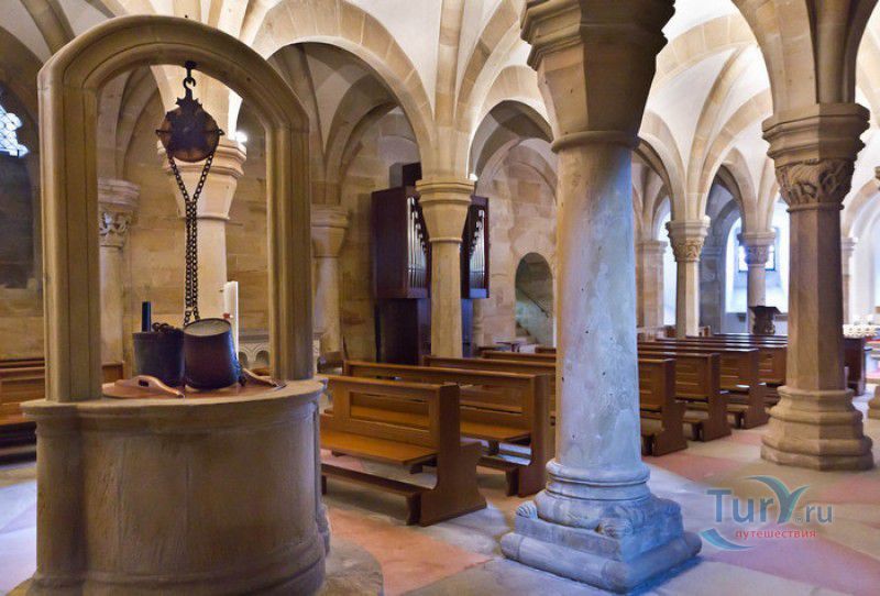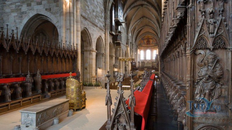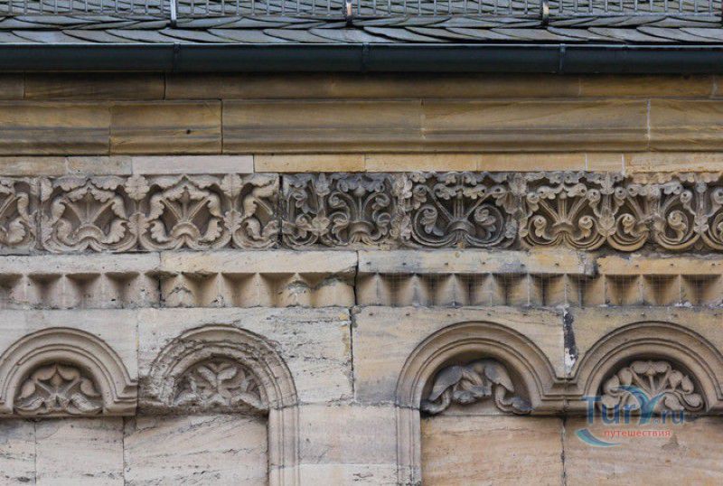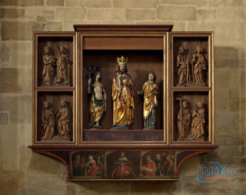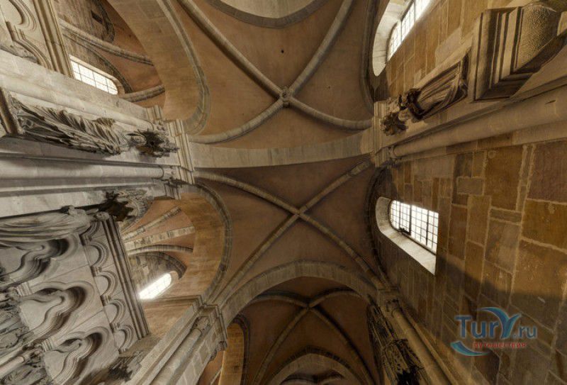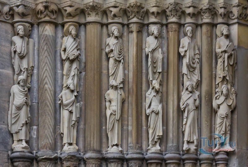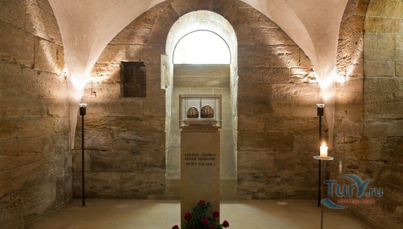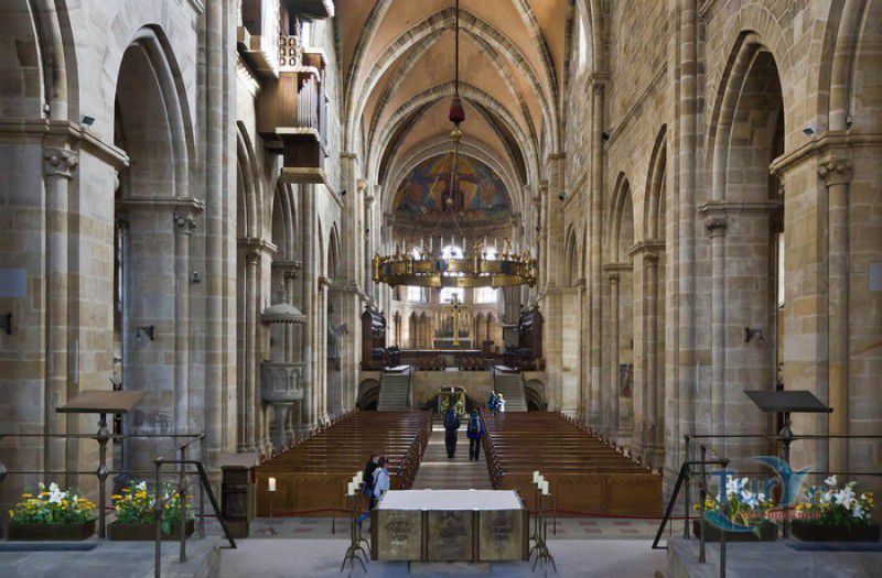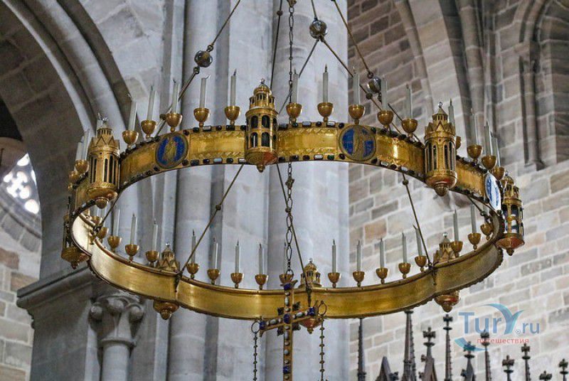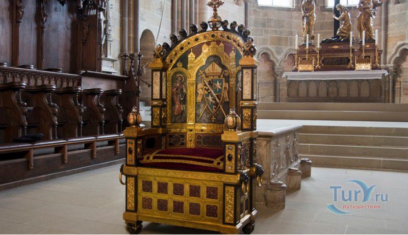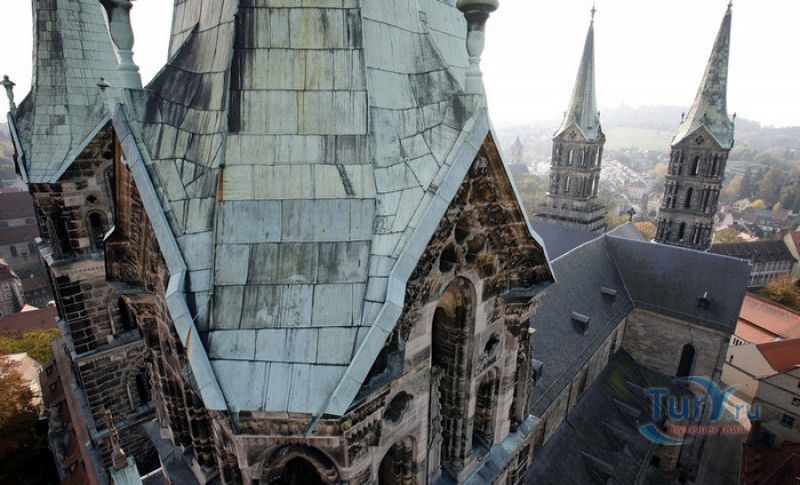 Кафедральный Собор в Бамберге (Кафедральный Собор Святого Петра и Святого Георгия в Бамберге) - один из семи имперских соборов Германии, расположен в историческом центре города Бамберг, в составе которого в 1993 году внесен в список всемирного наследия ЮНЕСКО. Возведение собора было начато в 1004 году по приказу императора Священной Римской империи Генриха II Святого. Работы велись 8 лет и завершились в 1012 году, в этом же году собор был освящён в честь Святых Петра и Григория. На церемонии присутствовали сам император Генрих II, тридцать шесть епископов и толпы простых верующих. Но уже в 1081 году первый собор был полностью уничтожен во время сильного пожара, его отстроили заново, но в 1185 году храм снова сгорел. Собор решили не восстанавливать, а строить на его месте новый. Возведение третьего по счёту собора было начато в 1215 году, а освящён он был 6 мая 1237 года. Архитектурный стиль Кафедрального собора в Бамберге представляет собой смесь позднего романского и раннего готического стилей - при строительстве нового здания использовали уцелевшие фрагменты более раннего храма, построенного в романском стиле. Собор представляет собой трёхнефную базилику с четырьмя башнями - восточными, построенными в романском стиле, и готическими - западными. Высота восточных башен - 76 метров, западных - 74 метра. Собор имеет неф с восточным и западным хорами, северный и южный трансепты, боковые капеллы и два склепа (западный и восточный). Главный вход в собор носит название Королевский портал, он расположен на северной стороне нефа. Тимпан портала украшен барельефом "Страшный суд" и статуями пророков Ветхого Завета и апостолов Нового Завета. С южной стороны находится портал Адама, который служил входом в собор для простых верующих. С правой стороны от входа размещены статуи Евы, Адама и Святого Петра, с левой - Святого Стефана, императора Генриха Святого и императрицы Кунигунды. В северо-восточной башне расположены портал Марии, в северной стене трансепта - портал Файт. Если внешний облик собора с тех времён почти не изменился, то интерьер на протяжении веков подвергался многократным перестройкам. Так, в 1648-1653 годах внутреннее убранство собора было оформлено в стиле барокко и оставалось таковым до середины XIX столетия. В 1826 году, во время своего визита в Бамберг, Людвиг I Баварский посетил собор и "пришёл в ужас" от плачевного состояния величественного храма и уродующей его художественный вид реконструкции, выполненной в стиле барокко. Монарх велел архиепископу Бамберга немедленно приступить к работам по возвращению храму его первоначального средневекового вида. Реставрационные работы велись в 1829-1837 годах под руководством архитектора Фридриха фон Гертнера. Интерьер собора богато украшен рельефами и скульптурами, великолепными алтарями, дубовые резные скамьи хора, выполненные в 1380 году, считаются шедевром готического зодчества. Одна из главных достопримечательностей собора - знаменитая скульптура "Бамбергский всадник", датируемая 1230 годом. Скульптура находится у входа в восточный хор, на северном пирсе. Статуя лошади и всадника, выполненные из песчаника, являются одним из самых известных скульптурных произведений немецкого средневекового искусства. Достоверно неизвестно чьё изображение увековечено в камне, наиболее вероятно, что всадник - это Иштва