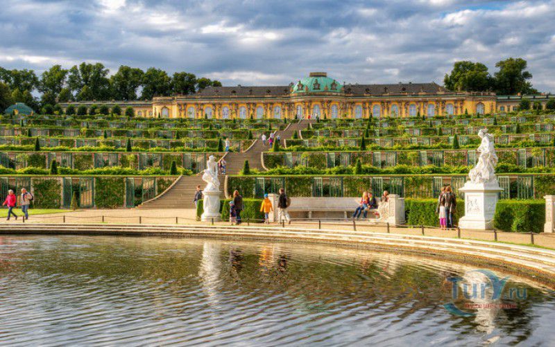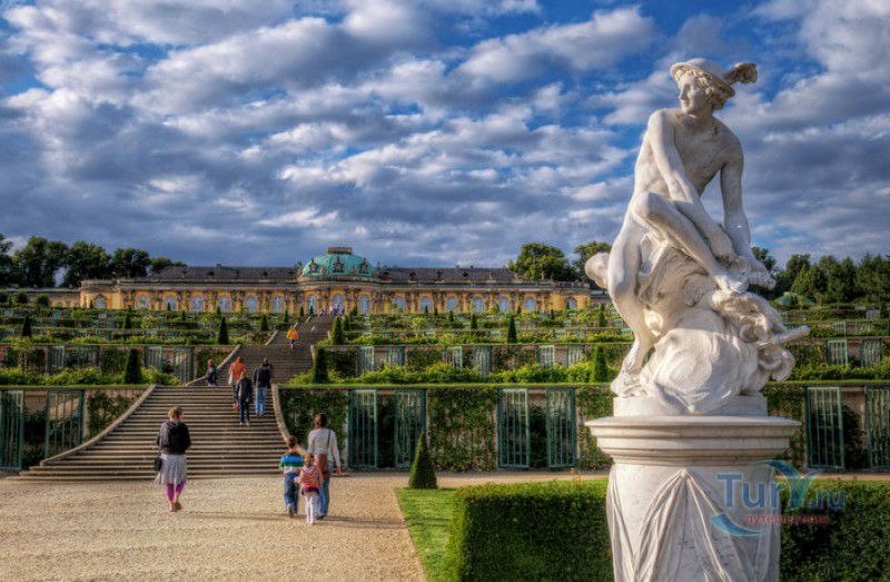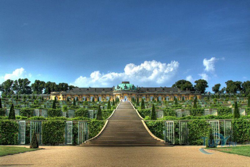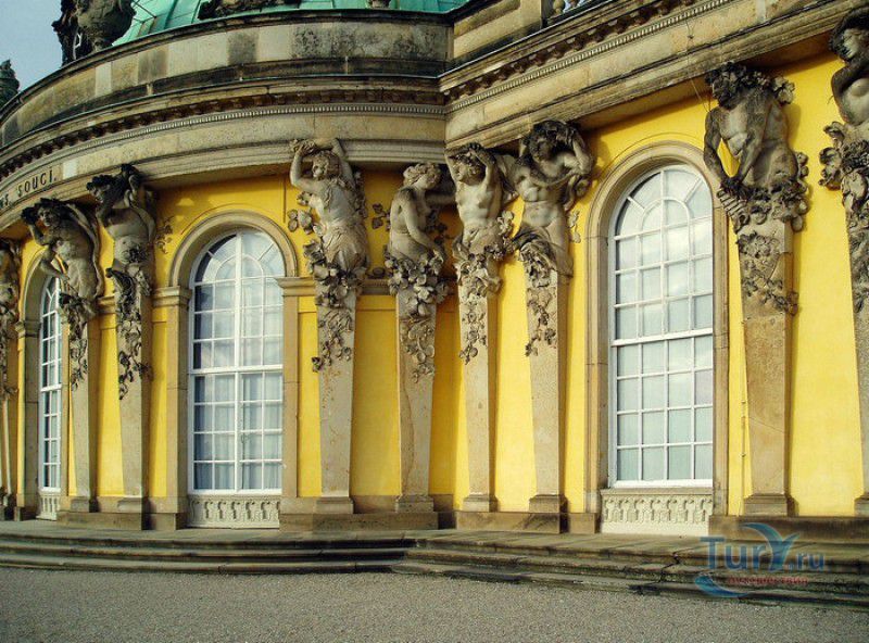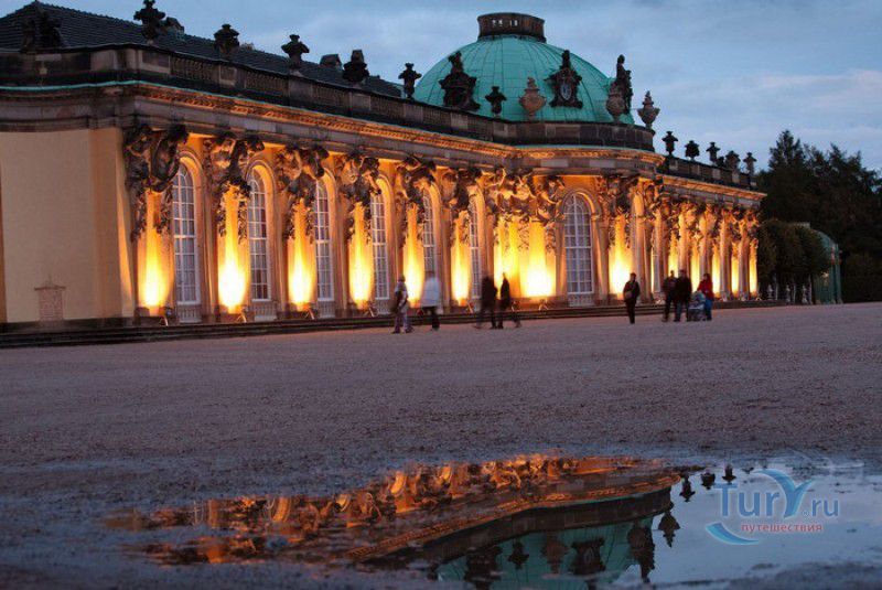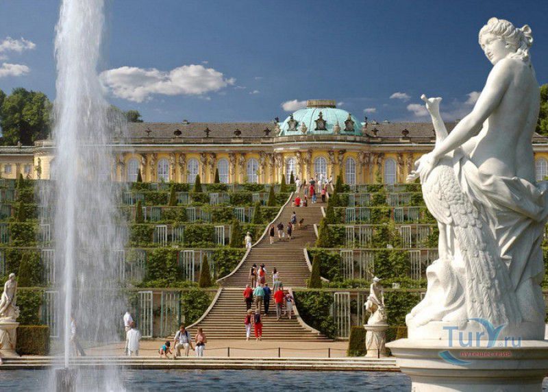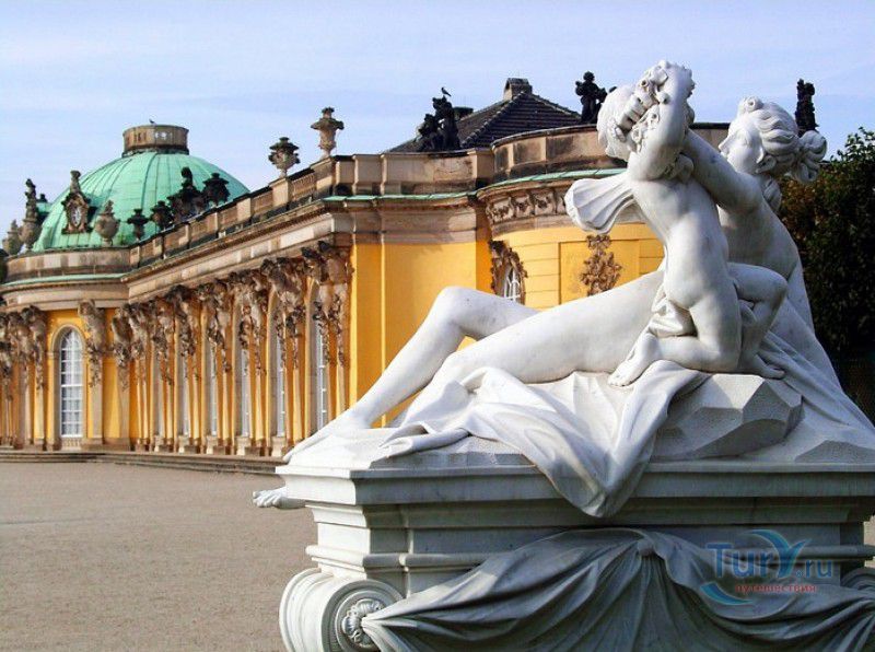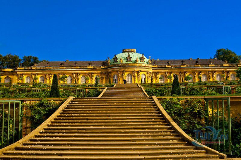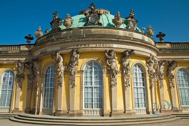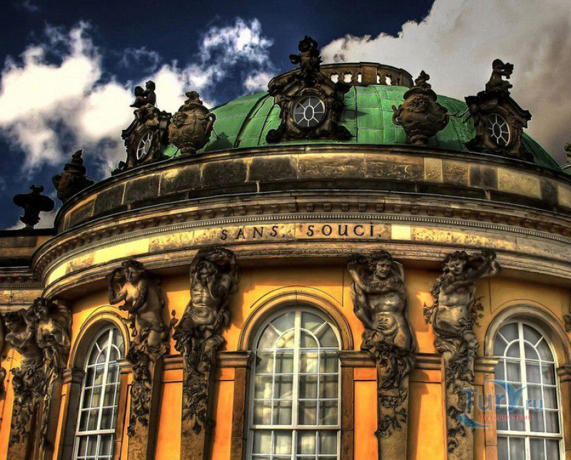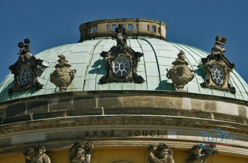 Дворец Сан-Суси - один из самых знаменитых дворцов Германии, расположен в восточной части парка Сан-Суси в Потсдаме. Некогда здесь, на южных склонах Борнштедтских холмов, росли вековые дубы, вырубленные при "короле-солдате" Фридрихе Вильгельме I для нужд армии и строящихся укреплений. Его сын и преемник, король Пруссии Фридрих II Великий, во время своей поездки в Потсдам в 1743 году, был очарован живописными видами, открывающимися с этих холмов. Монарх повелел разбить на голых холмах виноградные террасы, здесь же он начал строительство своей летней резиденции Сан-Суси (в переводе с французского - "без забот"), в которой он мог бы уединяться, философствовать, заниматься музыкой и литературой. Фридрих II принимал непосредственное участие в проектировании и строительстве дворцово-паркового комплекса. Многие эскизы были созданы им лично, ни одни работы не начинались без согласования с королём. Строительство дворца велось в 1745-1747 годах, руководить работами было поручено придворному архитектору Георгу Венцеслаусу фон Кнобельсдорфу. Сначала на склонах холма появились виноградники - на шести широких террасах была посажена виноградная лоза, специально доставленная в Потсдам из Португалии, Италии, Франции и Нейруппина. По центру холма была построена лестница из 120 ступеней (сейчас 132 ступени), разделённая на шесть пролётов, в соответствии с количеством террас. На вершине виноградного холма расположен летний дворец Сан-Суси, в местоположении и декоративном оформленим которого, по замыслу Фридриха II, была воплощена идея "гармонии между человеком и окружающей природой". Дворец построен в стиле рококо. Длинное одноэтажное здание с примыкающими к нему боковыми флигелями соответствует по длине верхней террасе. Центральная часть здания имеет полуовальную форму и увенчана куполом. Дворец буквально "насыщен" светом, который проникает во внутренние помещения через большие окна и стеклянные двери. Фасад, обращённый к винограднику, украшен скульптурами, выполненными в виде атлантов и кариатид, поддерживающих крышу. С противоположной стороны вдоль фасада установлены статуи вакхов и менад, а также декоративные вазы, изготовленные в мастерской скульптора Фридриха Кристиана Глуме. Парадный двор резиденции окружает полукругом колоннада, которая доходит до подъездной рампы, обустроенной у подножия холма. Внутренняя планировка дворца выполнена по принципу французского загородного дома с анфиладой комнат, расположенных на одном уровне, что позволяло прямо из помещений дворца попасть в сад. Центральное место во дворце занимают вестибюль и Мраморный зал, к западу от которого разместились пять гостевых комнат, к востоку - королевские апартаменты, состоящие из зала Аудиенций, Концертного зала, кабинета, спальни, библиотеки и длинной галереи на северной стороне. Вестибюль оформлен в стиле "изысканной элегантности", на фоне которой выделяется пышная роспись потолка, выполненная шведским художником Георгом Францем Эбенхехом. Парадный овальный Мраморный зал с куполообразным потолком, богато украшенным позолоченной лепниной, и большим потолочным окном, напоминает римский Пантеон. Парные колонны и мозаика пола выполнены из каррарского и силезского мрамора, в нишах установлены статуи Венеры Урании и Аполлона. Стены зала Аудиенций украшены полотнами