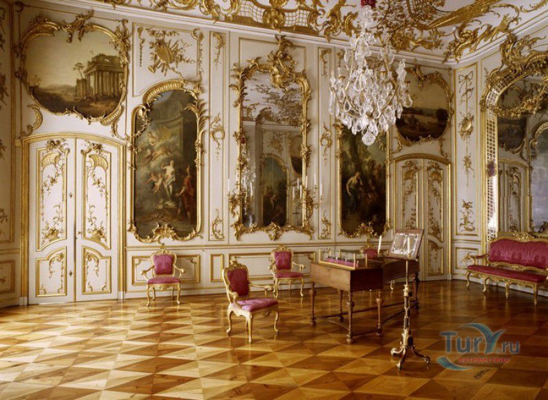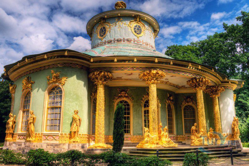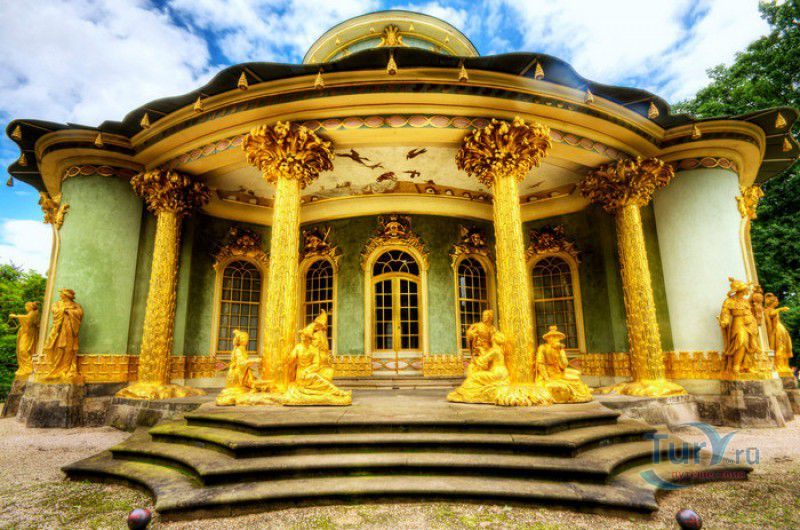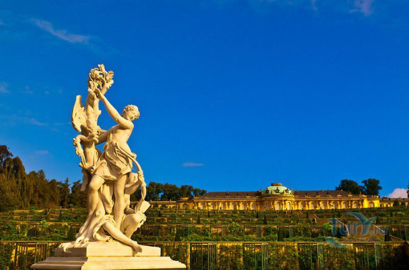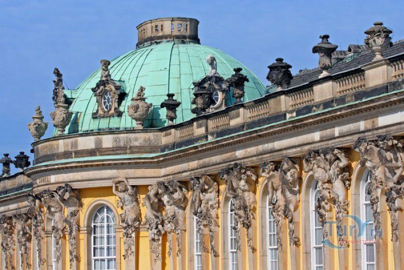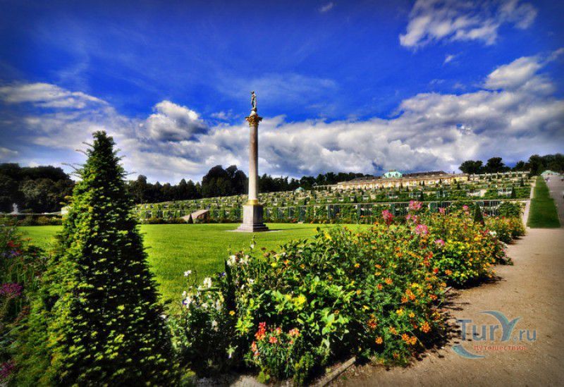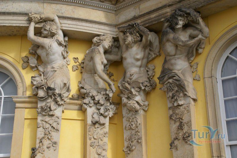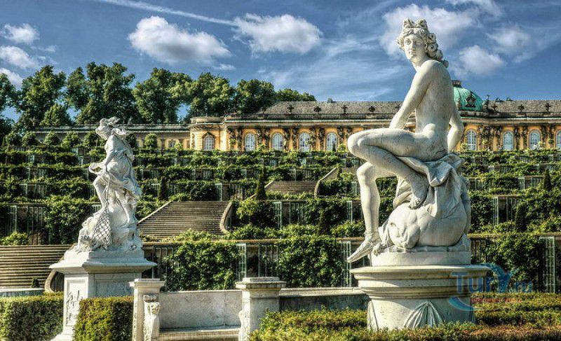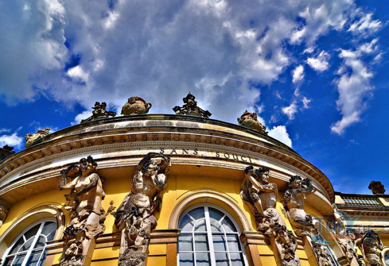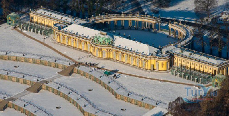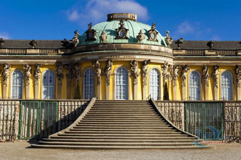 Дворец Сан-Суси - один из самых знаменитых дворцов Германии, расположен в восточной части парка Сан-Суси в Потсдаме. Некогда здесь, на южных склонах Борнштедтских холмов, росли вековые дубы, вырубленные при "короле-солдате" Фридрихе Вильгельме I для нужд армии и строящихся укреплений. Его сын и преемник, король Пруссии Фридрих II Великий, во время своей поездки в Потсдам в 1743 году, был очарован живописными видами, открывающимися с этих холмов. Монарх повелел разбить на голых холмах виноградные террасы, здесь же он начал строительство своей летней резиденции Сан-Суси (в переводе с французского - "без забот"), в которой он мог бы уединяться, философствовать, заниматься музыкой и литературой. Фридрих II принимал непосредственное участие в проектировании и строительстве дворцово-паркового комплекса. Многие эскизы были созданы им лично, ни одни работы не начинались без согласования с королём. Строительство дворца велось в 1745-1747 годах, руководить работами было поручено придворному архитектору Георгу Венцеслаусу фон Кнобельсдорфу. Сначала на склонах холма появились виноградники - на шести широких террасах была посажена виноградная лоза, специально доставленная в Потсдам из Португалии, Италии, Франции и Нейруппина. По центру холма была построена лестница из 120 ступеней (сейчас 132 ступени), разделённая на шесть пролётов, в соответствии с количеством террас. На вершине виноградного холма расположен летний дворец Сан-Суси, в местоположении и декоративном оформленим которого, по замыслу Фридриха II, была воплощена идея "гармонии между человеком и окружающей природой". Дворец построен в стиле рококо. Длинное одноэтажное здание с примыкающими к нему боковыми флигелями соответствует по длине верхней террасе. Центральная часть здания имеет полуовальную форму и увенчана куполом. Дворец буквально "насыщен" светом, который проникает во внутренние помещения через большие окна и стеклянные двери. Фасад, обращённый к винограднику, украшен скульптурами, выполненными в виде атлантов и кариатид, поддерживающих крышу. С противоположной стороны вдоль фасада установлены статуи вакхов и менад, а также декоративные вазы, изготовленные в мастерской скульптора Фридриха Кристиана Глуме. Парадный двор резиденции окружает полукругом колоннада, которая доходит до подъездной рампы, обустроенной у подножия холма. Внутренняя планировка дворца выполнена по принципу французского загородного дома с анфиладой комнат, расположенных на одном уровне, что позволяло прямо из помещений дворца попасть в сад. Центральное место во дворце занимают вестибюль и Мраморный зал, к западу от которого разместились пять гостевых комнат, к востоку - королевские апартаменты, состоящие из зала Аудиенций, Концертного зала, кабинета, спальни, библиотеки и длинной галереи на северной стороне. Вестибюль оформлен в стиле "изысканной элегантности", на фоне которой выделяется пышная роспись потолка, выполненная шведским художником Георгом Францем Эбенхехом. Парадный овальный Мраморный зал с куполообразным потолком, богато украшенным позолоченной лепниной, и большим потолочным окном, напоминает римский Пантеон. Парные колонны и мозаика пола выполнены из каррарского и силезского мрамора, в нишах установлены статуи Венеры Урании и Аполлона. Стены зала Аудиенций украшены полотнами