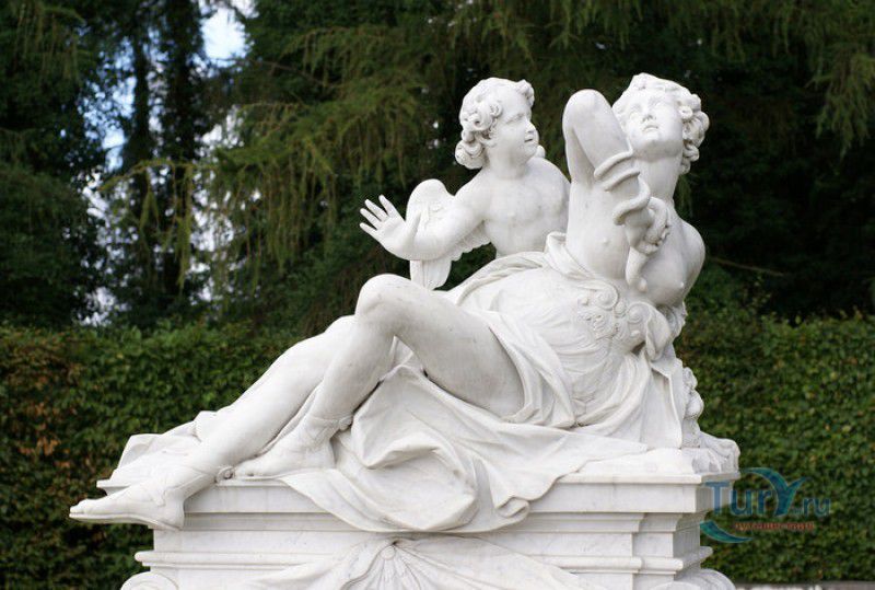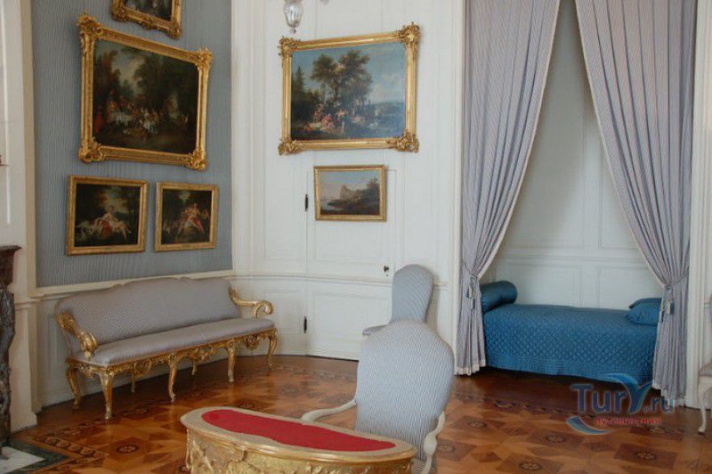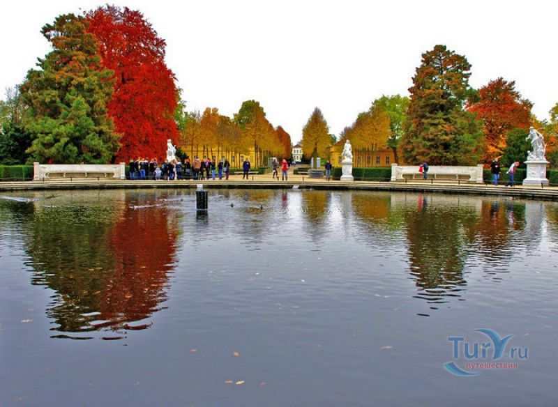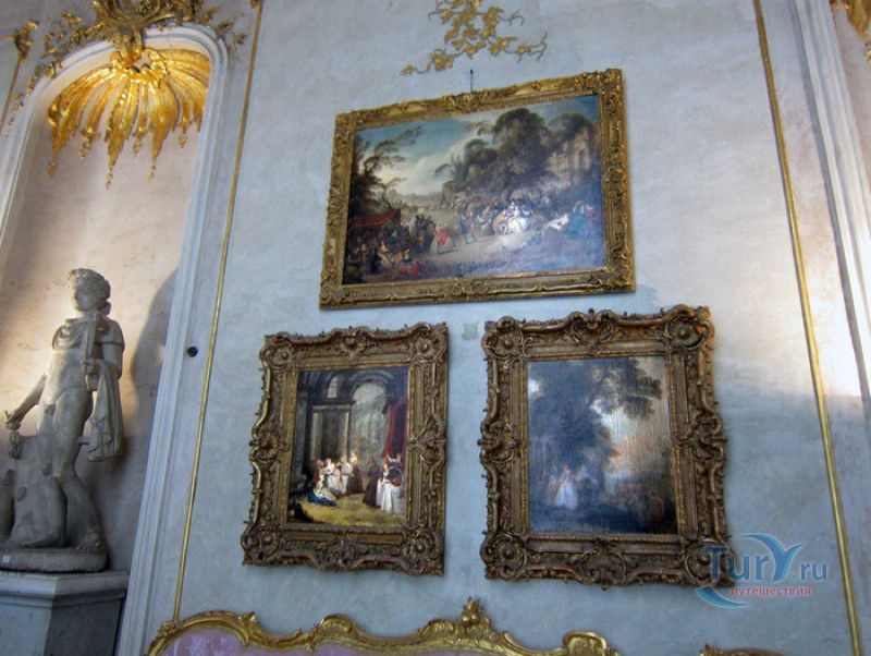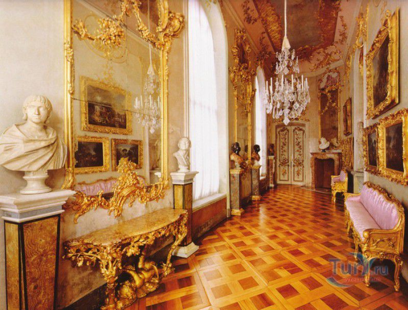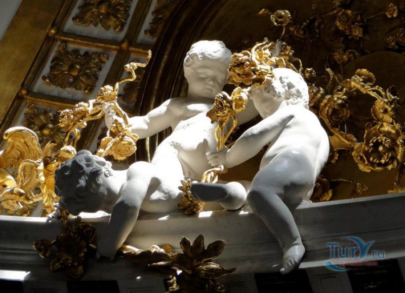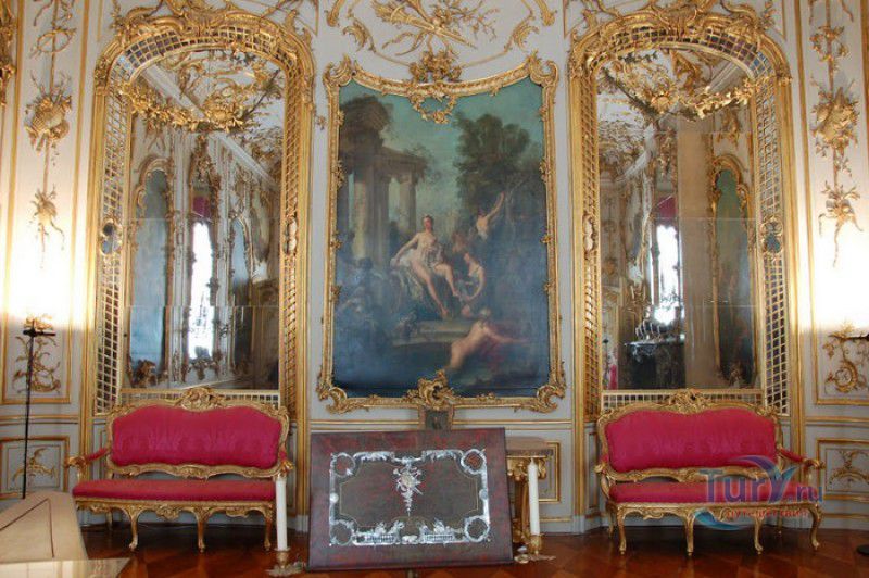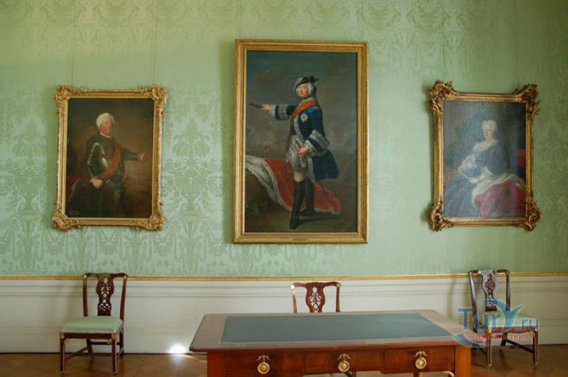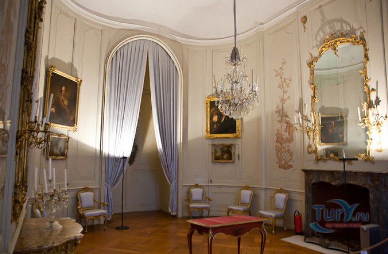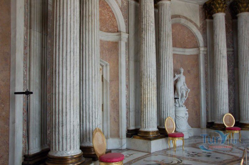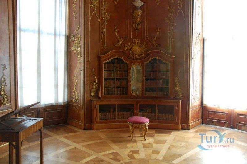 Дворец Сан-Суси - один из самых знаменитых дворцов Германии, расположен в восточной части парка Сан-Суси в Потсдаме. Некогда здесь, на южных склонах Борнштедтских холмов, росли вековые дубы, вырубленные при "короле-солдате" Фридрихе Вильгельме I для нужд армии и строящихся укреплений. Его сын и преемник, король Пруссии Фридрих II Великий, во время своей поездки в Потсдам в 1743 году, был очарован живописными видами, открывающимися с этих холмов. Монарх повелел разбить на голых холмах виноградные террасы, здесь же он начал строительство своей летней резиденции Сан-Суси (в переводе с французского - "без забот"), в которой он мог бы уединяться, философствовать, заниматься музыкой и литературой. Фридрих II принимал непосредственное участие в проектировании и строительстве дворцово-паркового комплекса. Многие эскизы были созданы им лично, ни одни работы не начинались без согласования с королём. Строительство дворца велось в 1745-1747 годах, руководить работами было поручено придворному архитектору Георгу Венцеслаусу фон Кнобельсдорфу. Сначала на склонах холма появились виноградники - на шести широких террасах была посажена виноградная лоза, специально доставленная в Потсдам из Португалии, Италии, Франции и Нейруппина. По центру холма была построена лестница из 120 ступеней (сейчас 132 ступени), разделённая на шесть пролётов, в соответствии с количеством террас. На вершине виноградного холма расположен летний дворец Сан-Суси, в местоположении и декоративном оформленим которого, по замыслу Фридриха II, была воплощена идея "гармонии между человеком и окружающей природой". Дворец построен в стиле рококо. Длинное одноэтажное здание с примыкающими к нему боковыми флигелями соответствует по длине верхней террасе. Центральная часть здания имеет полуовальную форму и увенчана куполом. Дворец буквально "насыщен" светом, который проникает во внутренние помещения через большие окна и стеклянные двери. Фасад, обращённый к винограднику, украшен скульптурами, выполненными в виде атлантов и кариатид, поддерживающих крышу. С противоположной стороны вдоль фасада установлены статуи вакхов и менад, а также декоративные вазы, изготовленные в мастерской скульптора Фридриха Кристиана Глуме. Парадный двор резиденции окружает полукругом колоннада, которая доходит до подъездной рампы, обустроенной у подножия холма. Внутренняя планировка дворца выполнена по принципу французского загородного дома с анфиладой комнат, расположенных на одном уровне, что позволяло прямо из помещений дворца попасть в сад. Центральное место во дворце занимают вестибюль и Мраморный зал, к западу от которого разместились пять гостевых комнат, к востоку - королевские апартаменты, состоящие из зала Аудиенций, Концертного зала, кабинета, спальни, библиотеки и длинной галереи на северной стороне. Вестибюль оформлен в стиле "изысканной элегантности", на фоне которой выделяется пышная роспись потолка, выполненная шведским художником Георгом Францем Эбенхехом. Парадный овальный Мраморный зал с куполообразным потолком, богато украшенным позолоченной лепниной, и большим потолочным окном, напоминает римский Пантеон. Парные колонны и мозаика пола выполнены из каррарского и силезского мрамора, в нишах установлены статуи Венеры Урании и Аполлона. Стены зала Аудиенций украшены полотнами