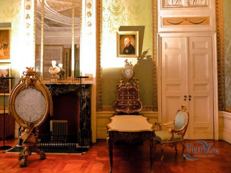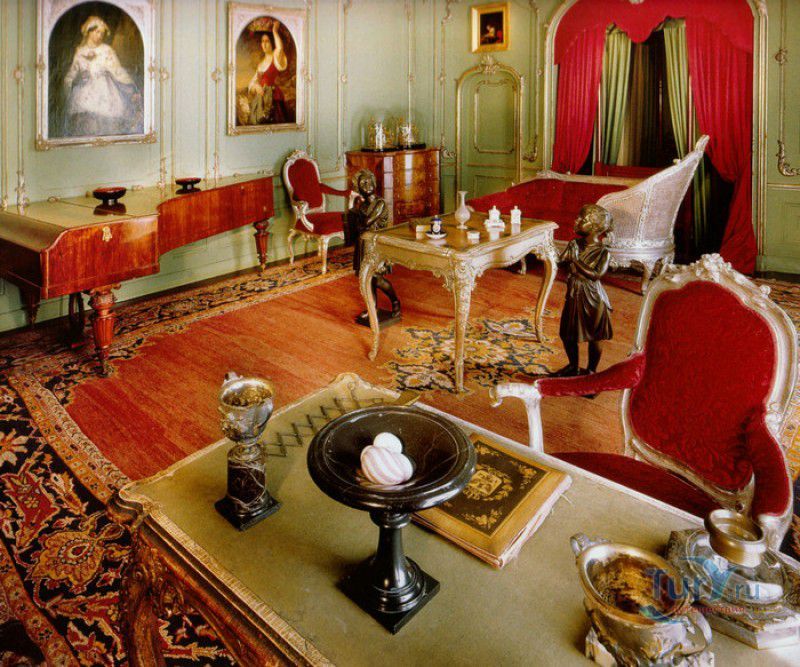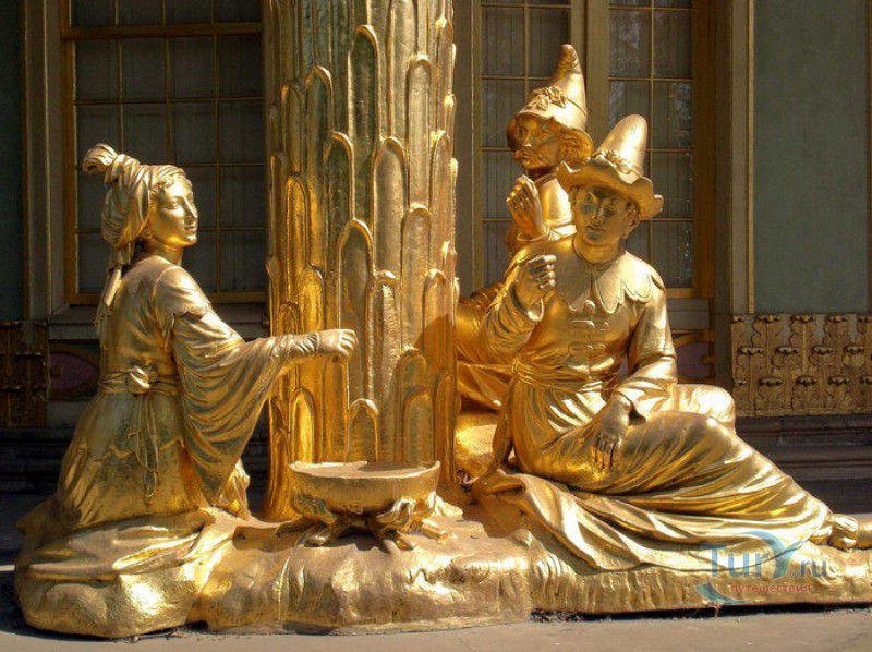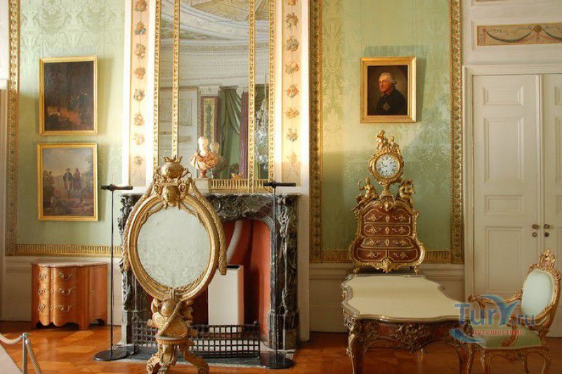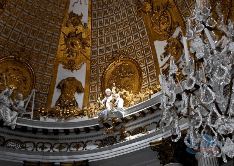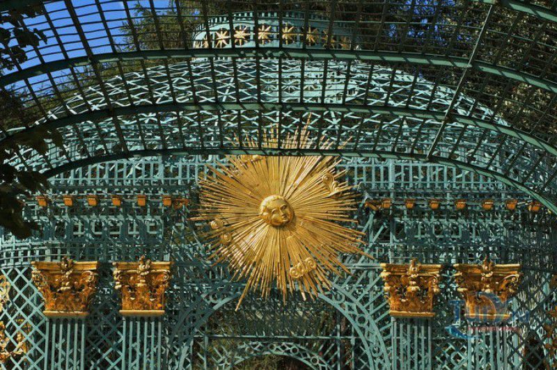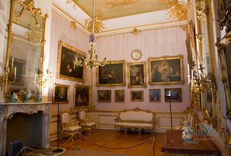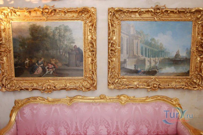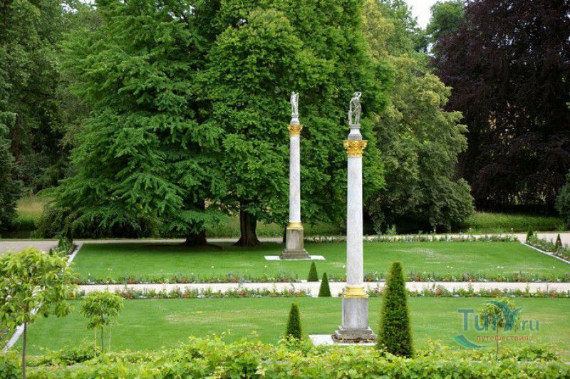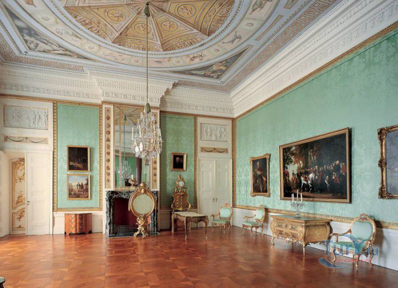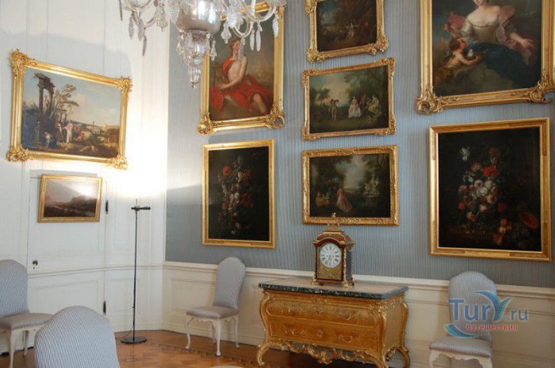 Дворец Сан-Суси - один из самых знаменитых дворцов Германии, расположен в восточной части парка Сан-Суси в Потсдаме. Некогда здесь, на южных склонах Борнштедтских холмов, росли вековые дубы, вырубленные при "короле-солдате" Фридрихе Вильгельме I для нужд армии и строящихся укреплений. Его сын и преемник, король Пруссии Фридрих II Великий, во время своей поездки в Потсдам в 1743 году, был очарован живописными видами, открывающимися с этих холмов. Монарх повелел разбить на голых холмах виноградные террасы, здесь же он начал строительство своей летней резиденции Сан-Суси (в переводе с французского - "без забот"), в которой он мог бы уединяться, философствовать, заниматься музыкой и литературой. Фридрих II принимал непосредственное участие в проектировании и строительстве дворцово-паркового комплекса. Многие эскизы были созданы им лично, ни одни работы не начинались без согласования с королём. Строительство дворца велось в 1745-1747 годах, руководить работами было поручено придворному архитектору Георгу Венцеслаусу фон Кнобельсдорфу. Сначала на склонах холма появились виноградники - на шести широких террасах была посажена виноградная лоза, специально доставленная в Потсдам из Португалии, Италии, Франции и Нейруппина. По центру холма была построена лестница из 120 ступеней (сейчас 132 ступени), разделённая на шесть пролётов, в соответствии с количеством террас. На вершине виноградного холма расположен летний дворец Сан-Суси, в местоположении и декоративном оформленим которого, по замыслу Фридриха II, была воплощена идея "гармонии между человеком и окружающей природой". Дворец построен в стиле рококо. Длинное одноэтажное здание с примыкающими к нему боковыми флигелями соответствует по длине верхней террасе. Центральная часть здания имеет полуовальную форму и увенчана куполом. Дворец буквально "насыщен" светом, который проникает во внутренние помещения через большие окна и стеклянные двери. Фасад, обращённый к винограднику, украшен скульптурами, выполненными в виде атлантов и кариатид, поддерживающих крышу. С противоположной стороны вдоль фасада установлены статуи вакхов и менад, а также декоративные вазы, изготовленные в мастерской скульптора Фридриха Кристиана Глуме. Парадный двор резиденции окружает полукругом колоннада, которая доходит до подъездной рампы, обустроенной у подножия холма. Внутренняя планировка дворца выполнена по принципу французского загородного дома с анфиладой комнат, расположенных на одном уровне, что позволяло прямо из помещений дворца попасть в сад. Центральное место во дворце занимают вестибюль и Мраморный зал, к западу от которого разместились пять гостевых комнат, к востоку - королевские апартаменты, состоящие из зала Аудиенций, Концертного зала, кабинета, спальни, библиотеки и длинной галереи на северной стороне. Вестибюль оформлен в стиле "изысканной элегантности", на фоне которой выделяется пышная роспись потолка, выполненная шведским художником Георгом Францем Эбенхехом. Парадный овальный Мраморный зал с куполообразным потолком, богато украшенным позолоченной лепниной, и большим потолочным окном, напоминает римский Пантеон. Парные колонны и мозаика пола выполнены из каррарского и силезского мрамора, в нишах установлены статуи Венеры Урании и Аполлона. Стены зала Аудиенций украшены полотнами
