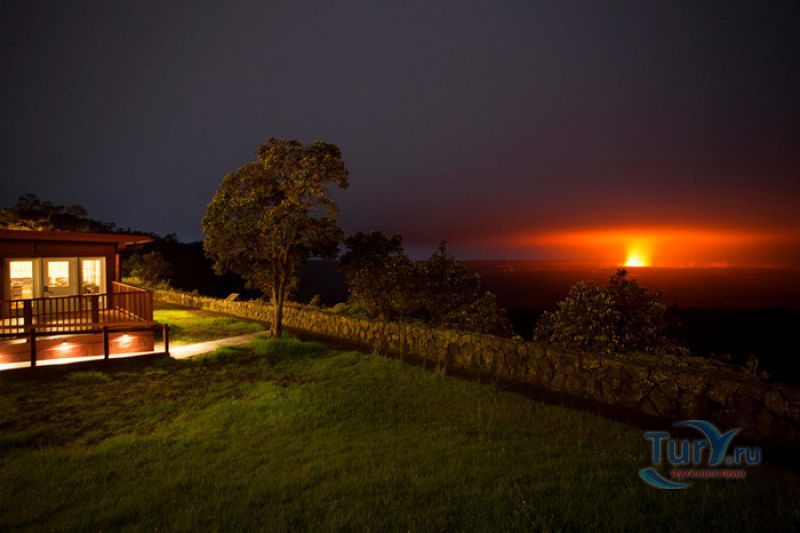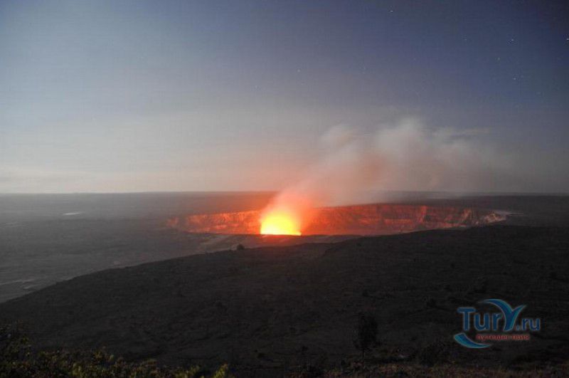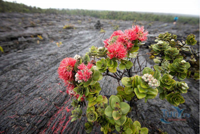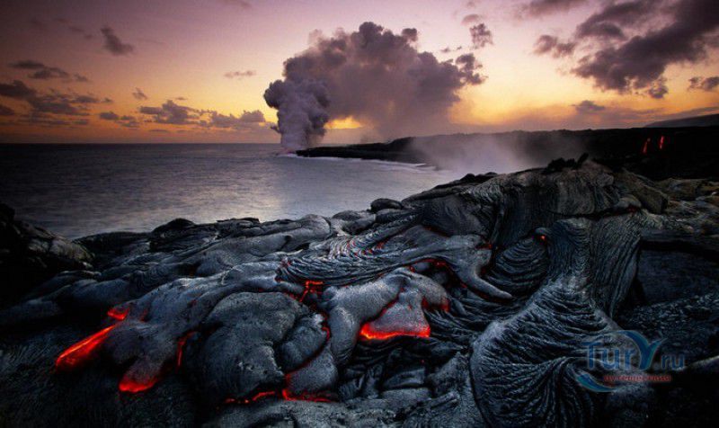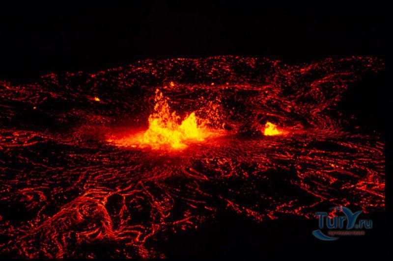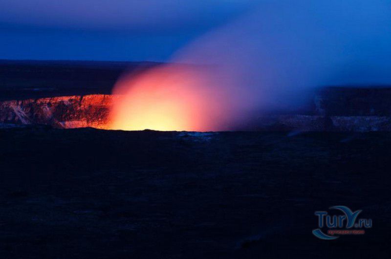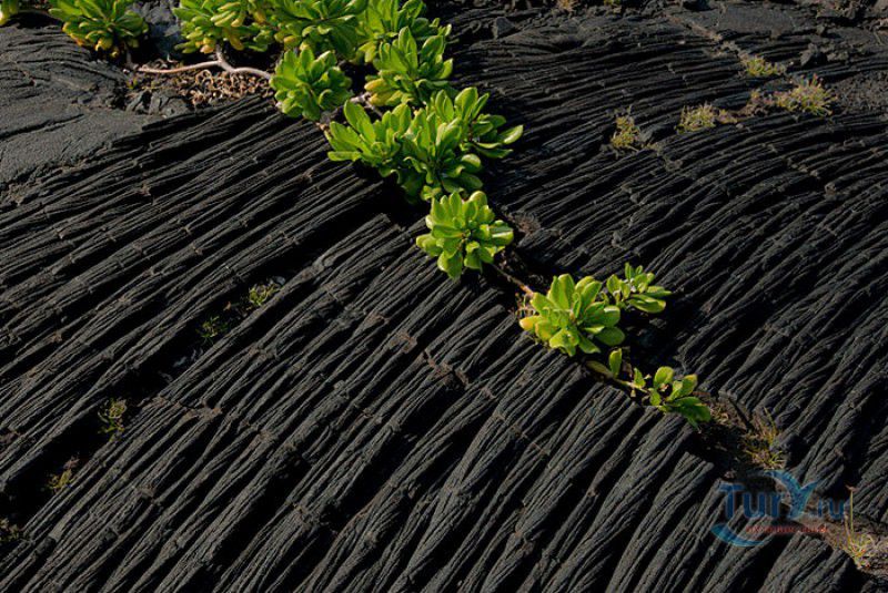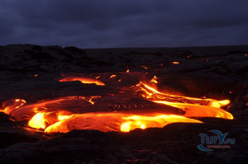 Национальный Парк Гавайские Вулканы расположен на юго-востоке острова Гавайи, в 48 километрах к юго-западу от города Хило. Парк Гавайские Вулканы - одно из немногих мест на планете, где можно вблизи увидеть множество гейзеров, выбрасывающих тонны вулканических газов, наблюдать за потоками раскалённой лавы и бурлящими лавовыми озёрами, а также стать свидетелем одного из самых завораживающих зрелищ - извержения вулканов. Парк Гавайские Вулканы был создан в 1916 году, он занимает территорию площадью 1308 квадратных километров, на которой расположены один из самых больших на Земле действующих вулканов - Мауна-Лоа (его высота над уровнем моря - 4169 метров, а общая высота, с учётом подводной части, - 9170 метров) и один из самых активных вулканов на планете - Килауэа (1247 метров над уровнем моря). Первое извержение Мауна-Лоа произошло около 700 000 лет назад, последнее - в 1984 году, а Килауэа, самый молодой из Гавайских вулканов, активен постоянно с момента своего образования. Последнее его извержение, начавшееся в 1983 году, продолжается и по сей день, в 2008 году оно перешло в фазу интенсивной активности - из кратера Халемаумау, расположенного в центре кальдеры Килауэа, постоянно выделяются вулканические газы, выбрасываются столбы вулканического пепла и непрерывно стекают в океан потоки раскалённой лавы. Следствием постоянной вулканической активности на протяжении тысячелетий стало большое разнообразие ландшафтов и экосистем парка - бесплодные пустыни, покрытые застывшей лавой, шлаковые конусы, пещеры, реки и озёра из расплавленной лавы, участки вечнозелёных влажных тропических лесов и пляжи из чёрного песка на океаническом побережье. В зимний период вершина Мауна-Лоа часто покрыта снегом, при этом на побережье острова температура никогда не опускается ниже + 20° С. Такое разнообразие экосистем и природных зон способствовали появлению на территории парка большого количества видов животных и растений, значительная часть которых являются эндемиками острова. В парке произрастают 36 видов редких или находящихся под угрозой исчезновения видов растений, в числе которых знаменитые Гавайский древовидный папоротник, древовидный "колокольчик" Клермонтия пелеана - растение, почти исчезнувшее в дикой природе, и Метросидерос - кустарник с большими ярко-красными цветами. В парке обитают 23 эндемичных вида птиц, в том числе огненная гавайская цветочница, гавайский гусь, гавайский буревестник и гавайский ястреб. На территории парка водятся плотоядные гусеницы, огромные стрекозы, улыбающийся паук, в прибрежных водах можно встретить находящуюся под угрозой исчезновения черепаху бисса. А вот млекопитающие в парке представлены всего одним видом летучих мышей. Среди исторических и археологических памятников парка Гавайские Вулканы самой известной является долина петроглифов Пуу Лоа, расположенная на южном склоне вулкана Килауэа. Пуу Лоа представляет собой огромное поле, состоящее из 23 000 рисунков (прямых линий, геометрических фигур, концентрических колец, изображений людей и животных), высеченных гавайскими аборигенами в застывшей лаве более 200 000 лет назад. Через поле петроглифов проложен деревянный настил, по которому посетители, желающие увидеть загадочные рисунки, могут отправиться в поход по долине Пуу Лоа. Ещё один интересный объект парка - окаменел