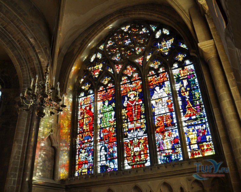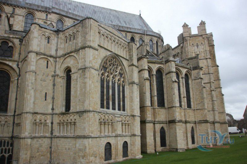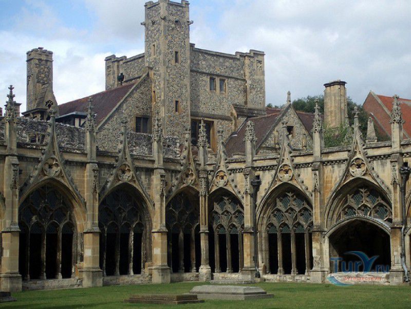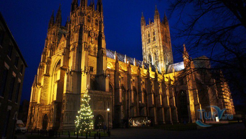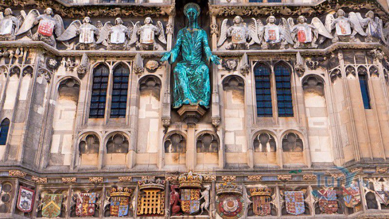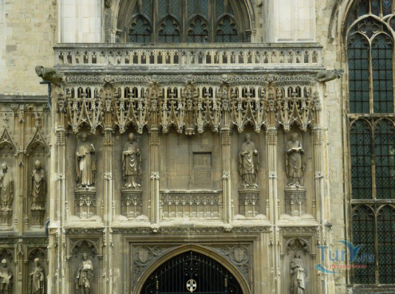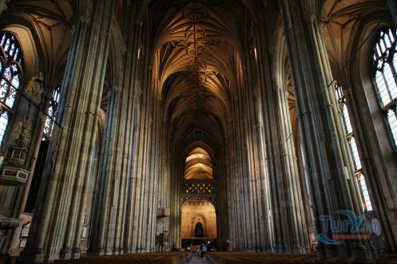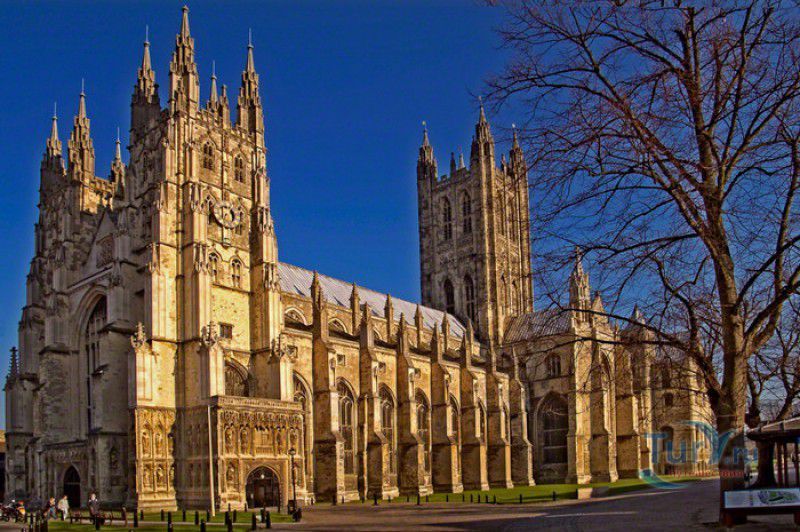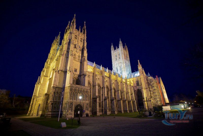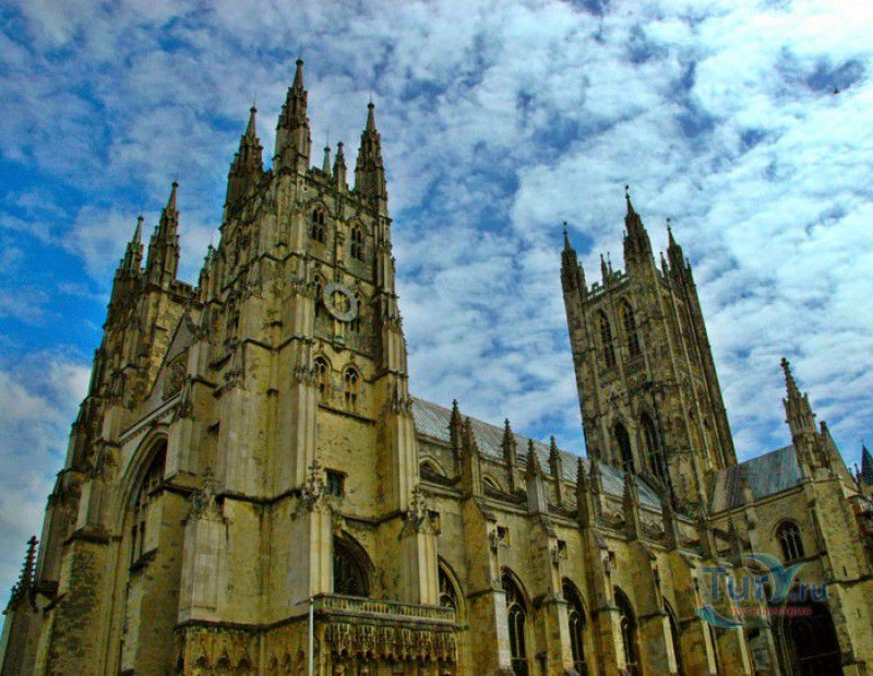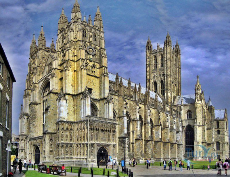 Кентерберийский Собор - главный англиканский храм Великобритании, расположен на юго-востоке Англии, в графстве Кент, в центре города Кентербери. Собор был основан в 597 году Блаженным Августином, будущим первым архиепископом Кентерберийским, прибывшим в Кент в качестве миссионера Папы римского Григория Великого. После получения разрешения поселиться в Кентербери Августину удалось склонить короля Кента Этельберта I принять христианство и крестить тысячи его подданных. Первый христианский храм, возведенный Августином в Кентербери, был освящён в честь Христа Спасителя (в 1993 году археологами был обнаружен фундамент этого строения). В 1067 году, через год после норманнского завоевания Англии, церковь была уничтожена пожаром. В 1070 году, при архиепископе Ланфранке, она была восстановлена в романском стиле и значительно расширена. Позже, при архиепископе Ансельме Кентерберийском, в церкви была построена крипта (подземное сводчатое помещение), а при архиепископе Конраде, в 1107 году, - новый хор, трансепт, три часовни и амбулаторий. С 1162 по 1170 год архиепископом Кентерберийским был Томас Бекет, убитый на ступенях алтаря собора 29 декабря 1170 года, как предполагают, по велению короля Генриха II Плантагенета. В 1173 Томас Бекет был канонизирован, а его гробница, расположенная в Кентерберийском соборе, стала местом массового паломничества. В 1174 году в соборе вспыхнул сильный пожар, почти полностью уничтоживший здание. Во время восстановления храма к нему была пристроена Троицкая капелла, в которую в 1220 году были перенесены мощи священномученика Томаса Бекета. В 1538 году, во времена английской Реформации, по приказу Генриха VIII, гробница Томаса Бекета была вскрыта, хранившиеся в ней ценности, принесенные в дар святому, были конфискованы в пользу королевской казны, мощи Томаса Бекета были сожжены, а его прах развеян по ветру (существует версия, что мощи святого были тайно перезахоронены). Сейчас на месте, где когда-то в соборе располагалась гробница Томаса Бекета, постоянно горит свеча. Нынешний свой вид Кентерберийский собор приобрёл лишь в XV веке. В это время неф храма был перестроен в стиле английской (перпендикулярной) готики, а центральная башня немного "подросла". В начале XIX столетии была разобрана находившаяся в полуразрушенном состоянии северо-западная башня, и на её месте в 1830 году построена точная копия юго-западной башни, что придало симметричность западному фасаду. Из-за большого числа перестроек, собор имеет сложную структуру, состоящую из ряда следующих друг за другом помещений, окружённых пристройками, в его архитектуре присутствуют элементы романского, раннего (украшенного) и перпендикулярного готических стилей. Длина храма составляет 160 метров. В центре собора расположена высокая Центральная башня, западный фасад венчают две менее высокие башни. Вокруг храма расположены два клуатра, монастырский садик и многочисленные подсобные помещения. Кентерберийский собор славится великолепными витражами XII-XIII веков, общая площадь витражей в соборе - 1200 квадратных метров. К большому готическому хору собора примыкают капеллы с множеством реликвий и средневековых произведений искусства. Интерьер храма украшен колоннами с капителями, лепниной, фресками, настенными и потолочными росписями, картинами и скульптурами. Самая древняя часть К