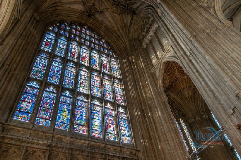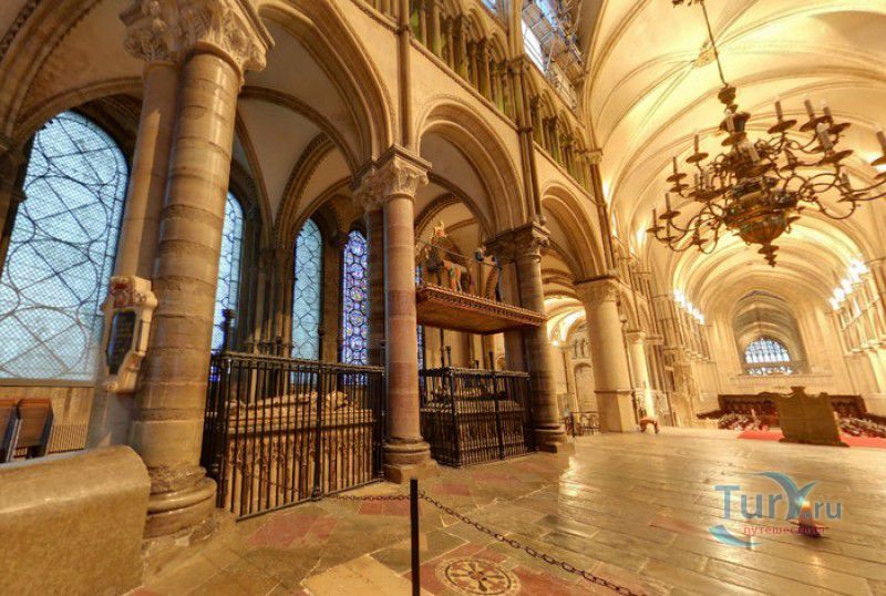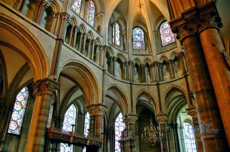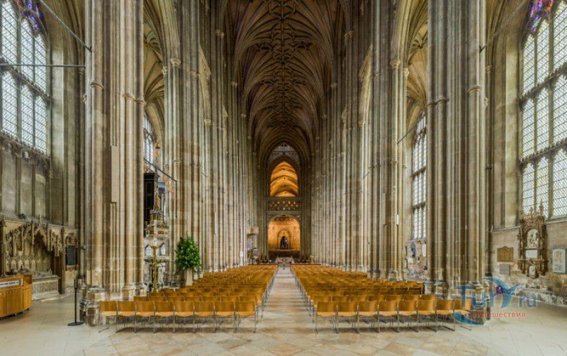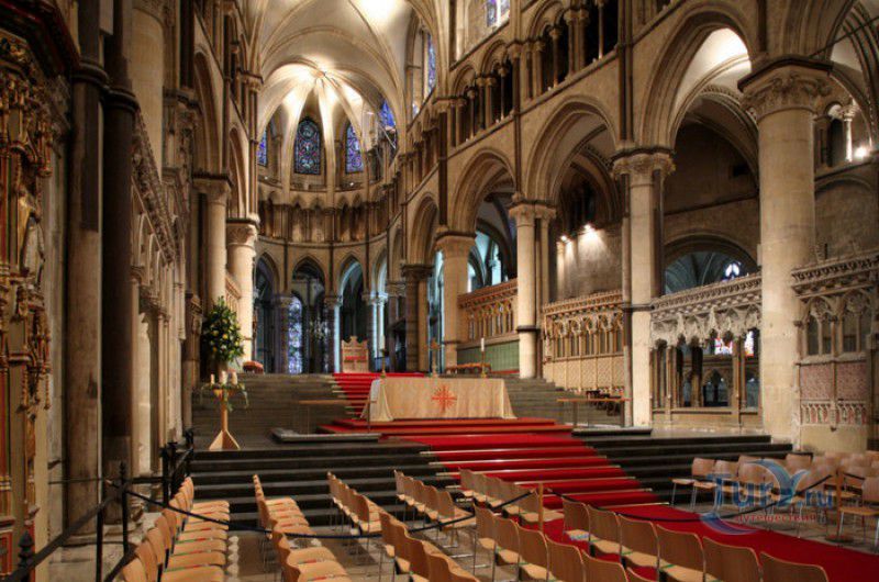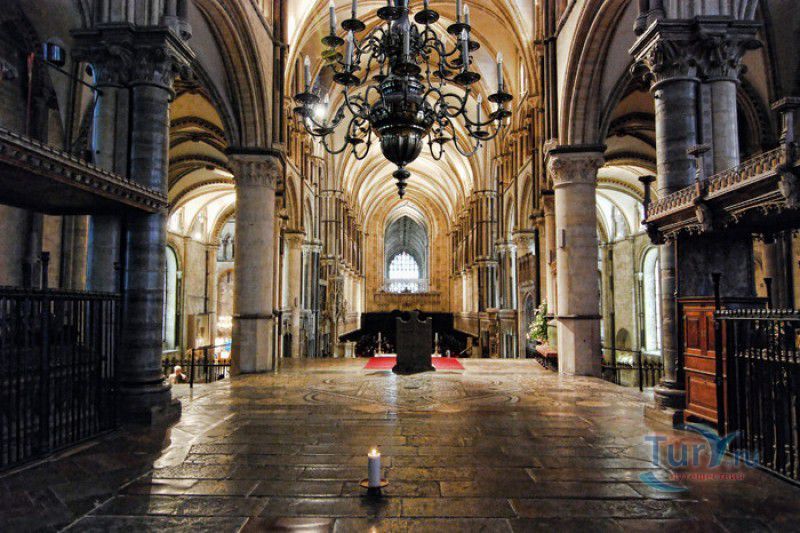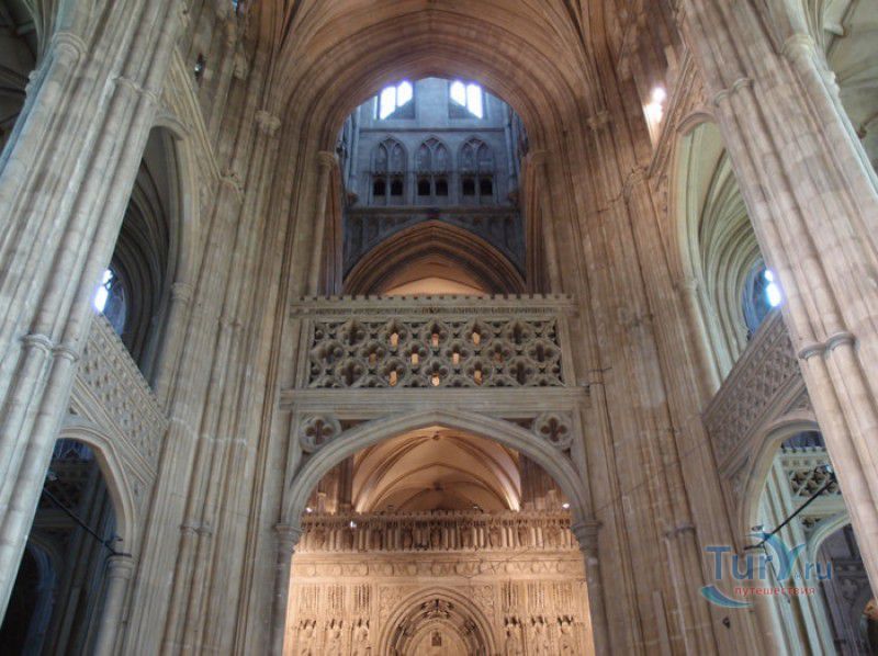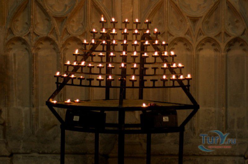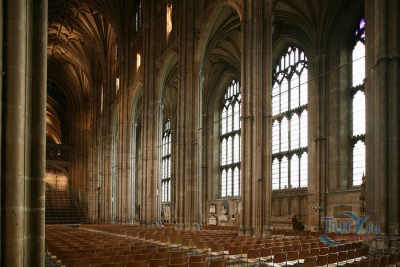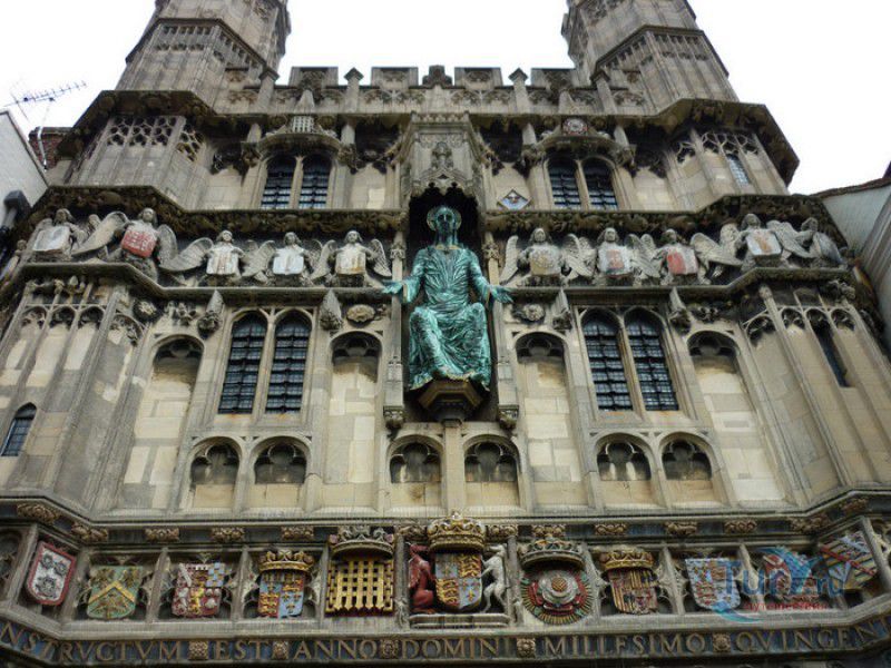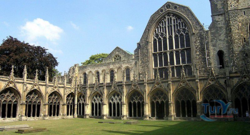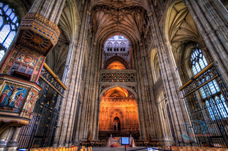 Кентерберийский Собор - главный англиканский храм Великобритании, расположен на юго-востоке Англии, в графстве Кент, в центре города Кентербери. Собор был основан в 597 году Блаженным Августином, будущим первым архиепископом Кентерберийским, прибывшим в Кент в качестве миссионера Папы римского Григория Великого. После получения разрешения поселиться в Кентербери Августину удалось склонить короля Кента Этельберта I принять христианство и крестить тысячи его подданных. Первый христианский храм, возведенный Августином в Кентербери, был освящён в честь Христа Спасителя (в 1993 году археологами был обнаружен фундамент этого строения). В 1067 году, через год после норманнского завоевания Англии, церковь была уничтожена пожаром. В 1070 году, при архиепископе Ланфранке, она была восстановлена в романском стиле и значительно расширена. Позже, при архиепископе Ансельме Кентерберийском, в церкви была построена крипта (подземное сводчатое помещение), а при архиепископе Конраде, в 1107 году, - новый хор, трансепт, три часовни и амбулаторий. С 1162 по 1170 год архиепископом Кентерберийским был Томас Бекет, убитый на ступенях алтаря собора 29 декабря 1170 года, как предполагают, по велению короля Генриха II Плантагенета. В 1173 Томас Бекет был канонизирован, а его гробница, расположенная в Кентерберийском соборе, стала местом массового паломничества. В 1174 году в соборе вспыхнул сильный пожар, почти полностью уничтоживший здание. Во время восстановления храма к нему была пристроена Троицкая капелла, в которую в 1220 году были перенесены мощи священномученика Томаса Бекета. В 1538 году, во времена английской Реформации, по приказу Генриха VIII, гробница Томаса Бекета была вскрыта, хранившиеся в ней ценности, принесенные в дар святому, были конфискованы в пользу королевской казны, мощи Томаса Бекета были сожжены, а его прах развеян по ветру (существует версия, что мощи святого были тайно перезахоронены). Сейчас на месте, где когда-то в соборе располагалась гробница Томаса Бекета, постоянно горит свеча. Нынешний свой вид Кентерберийский собор приобрёл лишь в XV веке. В это время неф храма был перестроен в стиле английской (перпендикулярной) готики, а центральная башня немного "подросла". В начале XIX столетии была разобрана находившаяся в полуразрушенном состоянии северо-западная башня, и на её месте в 1830 году построена точная копия юго-западной башни, что придало симметричность западному фасаду. Из-за большого числа перестроек, собор имеет сложную структуру, состоящую из ряда следующих друг за другом помещений, окружённых пристройками, в его архитектуре присутствуют элементы романского, раннего (украшенного) и перпендикулярного готических стилей. Длина храма составляет 160 метров. В центре собора расположена высокая Центральная башня, западный фасад венчают две менее высокие башни. Вокруг храма расположены два клуатра, монастырский садик и многочисленные подсобные помещения. Кентерберийский собор славится великолепными витражами XII-XIII веков, общая площадь витражей в соборе - 1200 квадратных метров. К большому готическому хору собора примыкают капеллы с множеством реликвий и средневековых произведений искусства. Интерьер храма украшен колоннами с капителями, лепниной, фресками, настенными и потолочными росписями, картинами и скульптурами. Самая древняя часть К