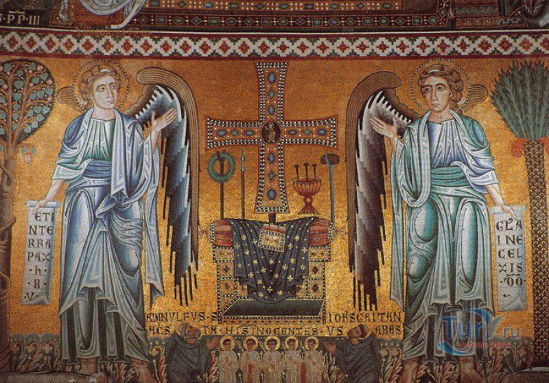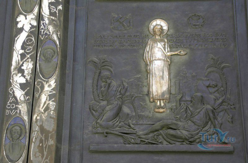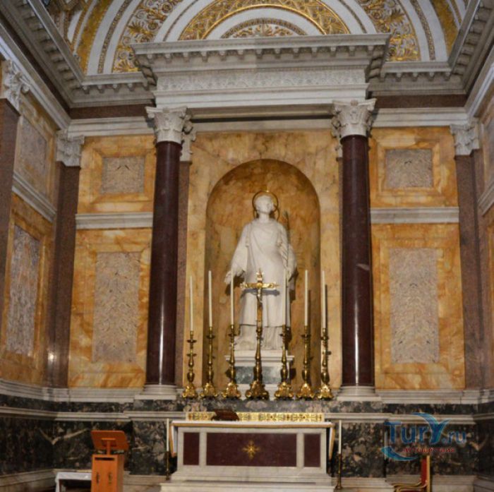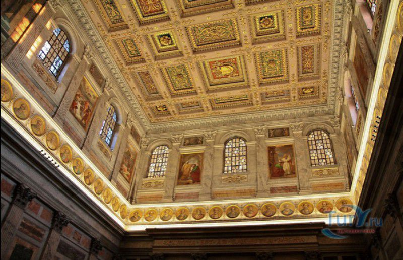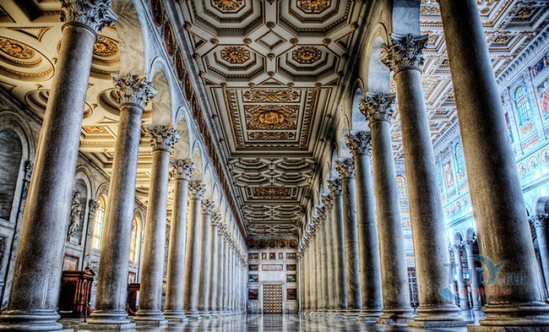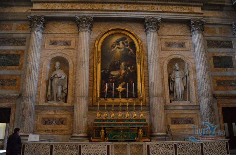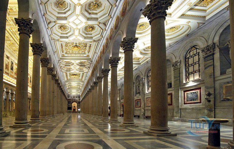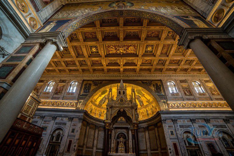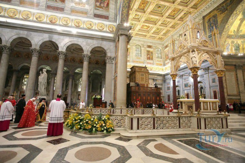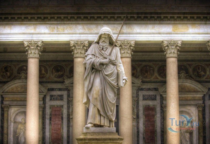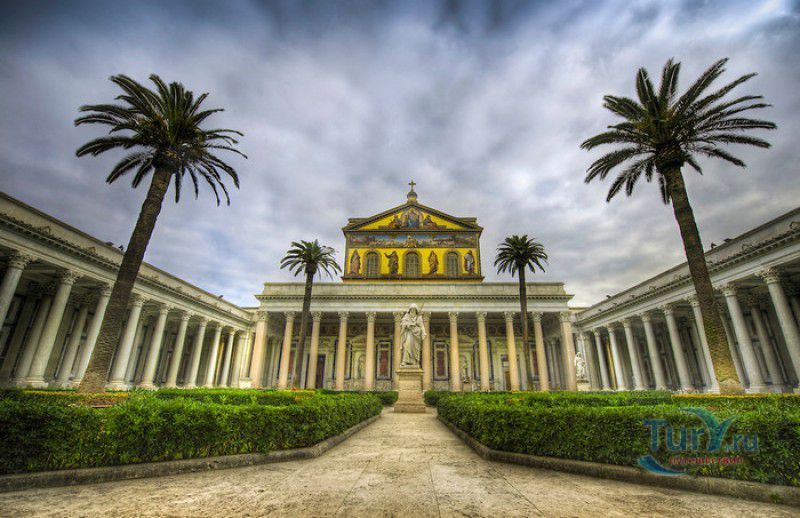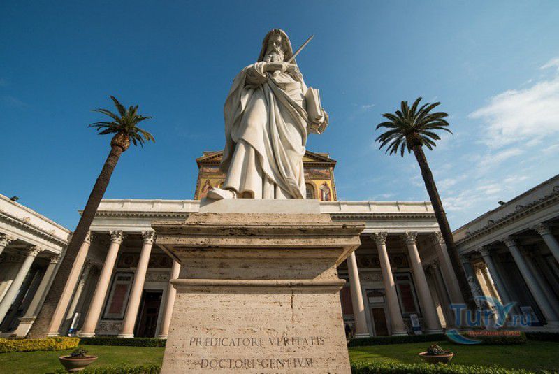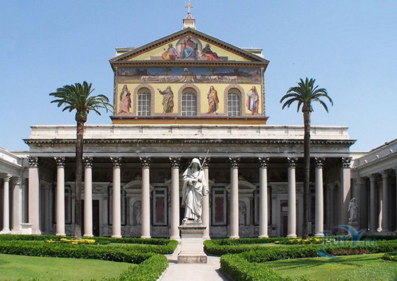 Базилика Сан Паоло Фуори Ле Мура (Базилика Святого Павла За Городскими Стенами) является одной из четырёх великих папских базилик Рима и второй по величине после собора Святого Петра в Ватикане. Она расположена в южной части Рима, за пределами городской стены Аврелиана, возведенной вокруг древнего Рима при императоре Аврелиане в III веке - отсюда и название базилики "за городскими стенами". Первая церковь на месте захоронения Апостола Павла, казнённого в 67 году по приказу императора Нерона, была построена в начале IV века императором Константином I. Вскоре эта церковь уже не могла вместить паломников, желающих поклониться мощам Святого Павла, и в 386 году, при императоре Феодосии I, на её месте начали строить новый храм с пятью нефами и трансептом. Базилика была достроена только в середине V века, при папе Льве I, и на протяжении последующих столетий неоднократно перестраивалась и расширялась - добавлялись новые часовни, её интерьер украшался мозаиками, фресками, картинами и скульптурами, в VI веке, при папе Григории Великом, в базилике был установлен алтарь над могилой Апостола Павла. В это же время рядом с храмом были возведены два монастыря - женский и мужской. В IX веке участились набеги сарацин, и папа Иоанн VIII окружил религиозный комплекс стеной с башнями, создав небольшой укреплённый город Джованниполи (Giovannipoli). Базилика Сан Паоло Фуори Ле Мура, в отличие от других папских базилик, сохраняла свой первоначальный облик на протяжении почти полутора тысячелетий, её архитектура не претерпела существенных изменений ни в эпоху Возрождения, ни во времена барокко. Но 15 июля 1823 года сильный пожар, произошедший по вине рабочих, чинивших крышу, уничтожил базилику почти до основания. Восстановление храма было начато в 1825 году, при папе Льве XII, и продолжалось до 1840 года, работами руководил архитектор Луиджи Полетти. Помощь в восстановлении храма оказывали монархи многих стран - правители Сардинии, Франции, Сицилии, Нидерландов, Египта и Российской империи (император Николай I прислал огромные блоки из малахита и лазурита для новых алтарей). В 1854 году Базилика Сан Паоло Фуори Ле Мура была повторно освящена папой Пием IX. Новая базилика сохранила первоначальную структуру, она по-прежнему состоит из пяти нефов. Длина здания составляет 132 метра, ширина - 65 метров, высота - 30 метров. Фасад храма украшен мозаикой с изображениями Иисуса Христа, апостолов Петра и Павла, пророков Исаии, Даниила, Иеремии и Иезеклииля, Святого Агнца и двенадцати ягнят, символизирующих двенадцать апостолов. В 1928 году по проекту Гульельмо Кальдерини вокруг внешнего двора храма был построен открытый портик из 150 колонн, в его центре установлена статуя Святого Павла с мечом и книгой в руках. Монументальная бронзовая дверь была установлена в 1931 году, при её изготовлении были использованы пластины из древней двери, выполненной в Константинополе в XI веке. Из интерьера базилики сохранились лишь часть апсиды и триумфальная арка, примыкающая к ней. Мозаика апсиды, выполненная в XIII веке Пьетро Каваллини, была почти полностью утрачена при пожаре, её уцелевшие фрагменты были использованы при реконструкции апсиды. Мозаики триумфальной арки, датируемые V веком, полностью сохранились. Большая же часть интерьера была заново воссоздана в XIX веке - 80 гранитных колонн, разделяющих нефы, бога