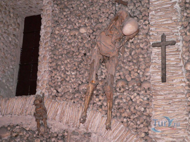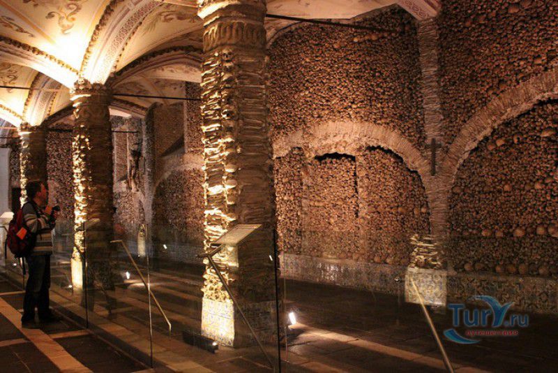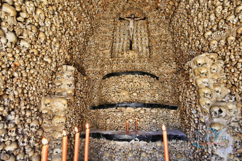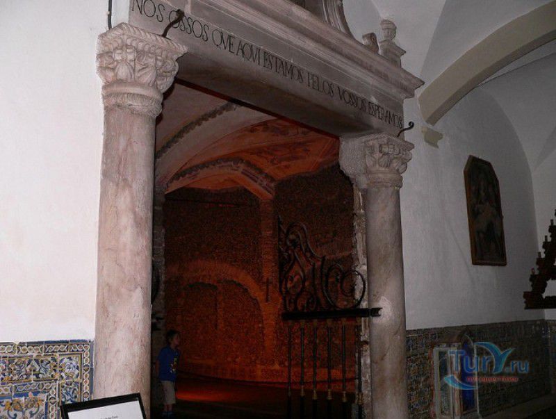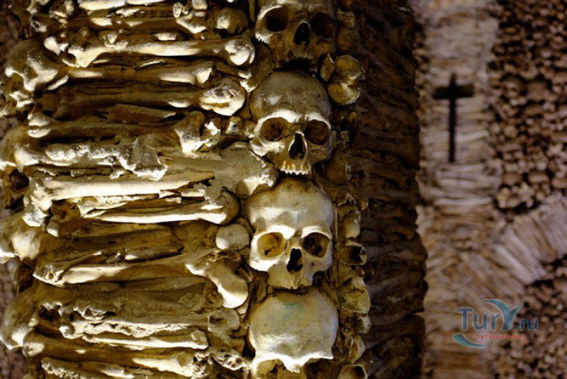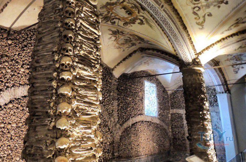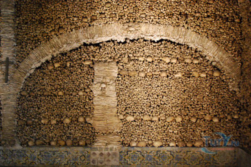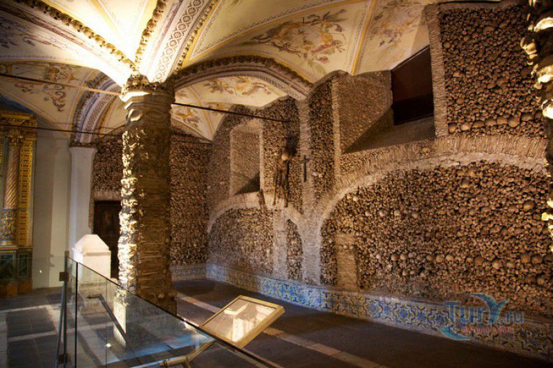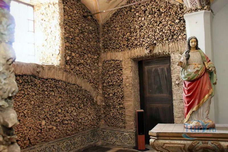 Часовня Костей - одна из самых известных и посещаемых достопримечательностей города Эвора, она расположена в центре города, рядом с входом в церковь Святого Франциска. Часовня Костей, в составе исторического центра Эворы, в 1988 году была внесена в список Всемирного наследия ЮНЕСКО. Часовня построена францисканскими монахами в XVII веке. В те времена в Португалии свирепствовала эпидемия чумы, уносившая тысячи жизней. В небольшой Эворе существовало уже 42 кладбища, часто в одной могиле хоронили нескольких человек. Чтобы "разгрузить" городские кладбища, а заодно напомнить братьям и прихожанам о недолговечности и бренности земной жизни, монахам пришла в голову идея использовать человеческие останки для оформления интерьера часовни. С кладбищ Эворы были извлечены более 5000 скелетов, в целях дезинфекции они тщательно обрабатывались гашёной известью, благодаря чему приобретали белый цвет. Обломки костей измельчались и добавлялись в цементный раствор. Все стены и колонны часовни сложены из человеческих костей и черепов, на некоторых из них написаны имена и даты смерти. В часовне очень мрачно и сумрачно, дневной свет в неё проникает через три небольших оконца, расположенных на левой стене. Самыми страшными "украшениями" часовни являются два высушенных трупа, висящие на цепях. Существует легенда, что женщина прокляла своих мужа и сына, жестоко с ней обращавшихся - на смертном одре несчастная крикнула, что оба они не достойны лежать в земле. Кости монахов, построивших часовню, также находятся внутри неё, но они не выставлены на показ, а покоятся в белом каменном гробу, стоящем у алтаря. На белом оштукатуренном потолке Часовни Костей нарисованы картины на тему смерти, на крыше начертана надпись на латыни "День смерти лучше дня рождения", а на входе в часовню посетителей встречает (и провожает) надпись "Nós ossos que aqui estamos pelos vossos esperamos" ("Мы, кости, которые находятся здесь, ждём вас").