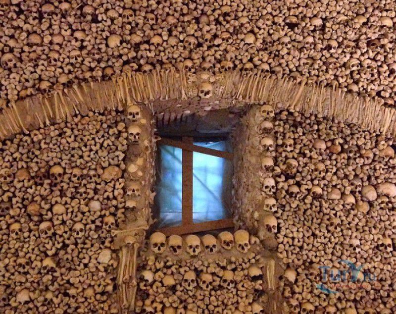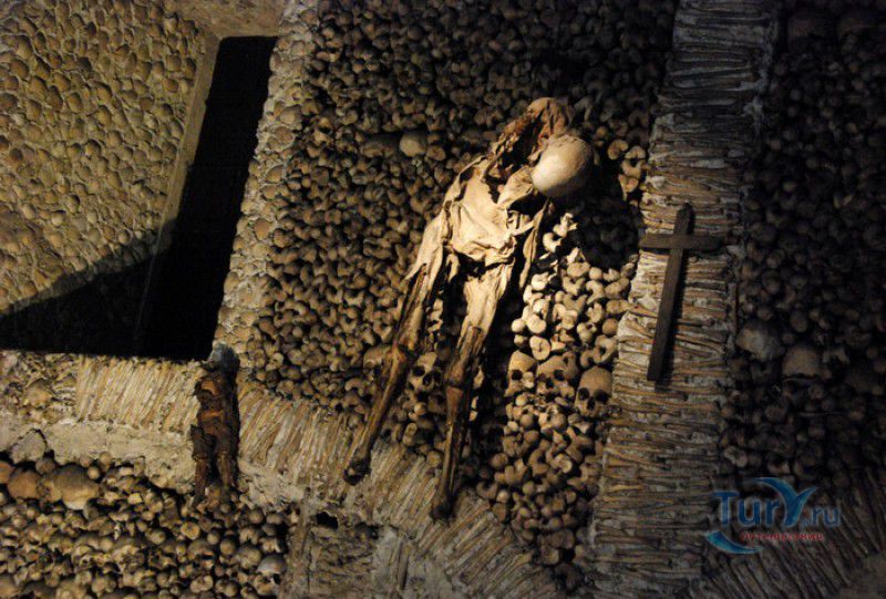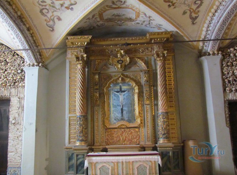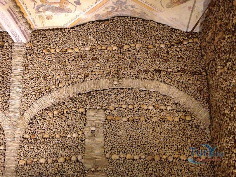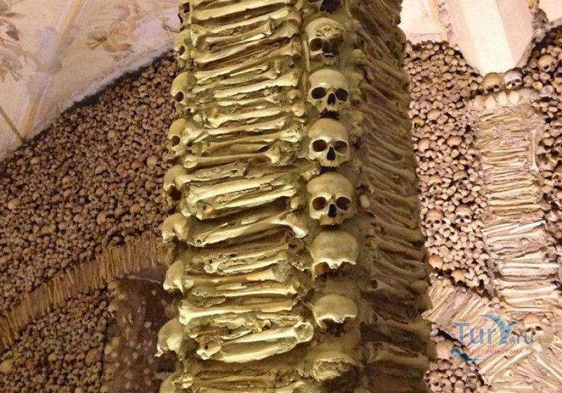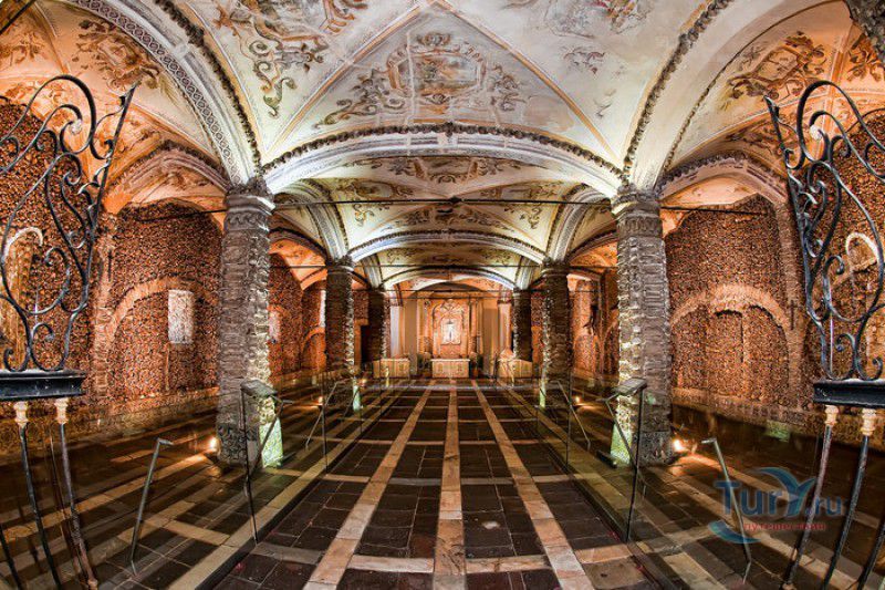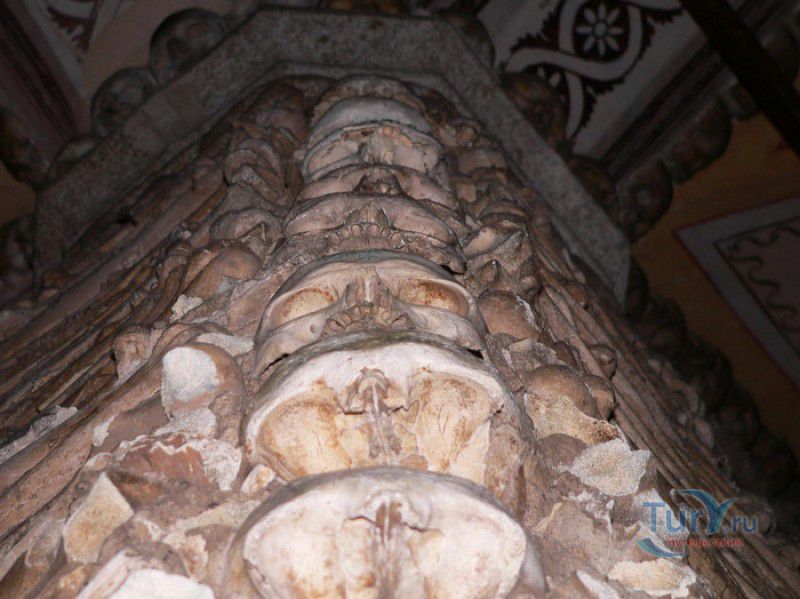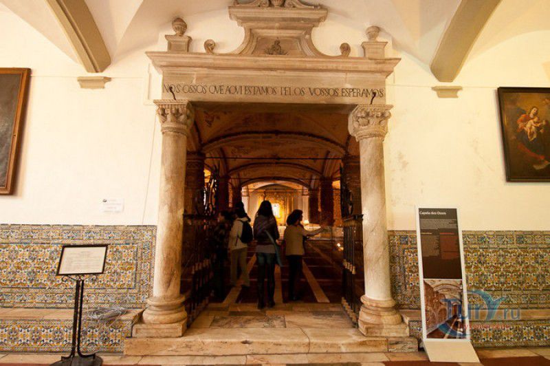 Часовня Костей - одна из самых известных и посещаемых достопримечательностей города Эвора, она расположена в центре города, рядом с входом в церковь Святого Франциска. Часовня Костей, в составе исторического центра Эворы, в 1988 году была внесена в список Всемирного наследия ЮНЕСКО. Часовня построена францисканскими монахами в XVII веке. В те времена в Португалии свирепствовала эпидемия чумы, уносившая тысячи жизней. В небольшой Эворе существовало уже 42 кладбища, часто в одной могиле хоронили нескольких человек. Чтобы "разгрузить" городские кладбища, а заодно напомнить братьям и прихожанам о недолговечности и бренности земной жизни, монахам пришла в голову идея использовать человеческие останки для оформления интерьера часовни. С кладбищ Эворы были извлечены более 5000 скелетов, в целях дезинфекции они тщательно обрабатывались гашёной известью, благодаря чему приобретали белый цвет. Обломки костей измельчались и добавлялись в цементный раствор. Все стены и колонны часовни сложены из человеческих костей и черепов, на некоторых из них написаны имена и даты смерти. В часовне очень мрачно и сумрачно, дневной свет в неё проникает через три небольших оконца, расположенных на левой стене. Самыми страшными "украшениями" часовни являются два высушенных трупа, висящие на цепях. Существует легенда, что женщина прокляла своих мужа и сына, жестоко с ней обращавшихся - на смертном одре несчастная крикнула, что оба они не достойны лежать в земле. Кости монахов, построивших часовню, также находятся внутри неё, но они не выставлены на показ, а покоятся в белом каменном гробу, стоящем у алтаря. На белом оштукатуренном потолке Часовни Костей нарисованы картины на тему смерти, на крыше начертана надпись на латыни "День смерти лучше дня рождения", а на входе в часовню посетителей встречает (и провожает) надпись "Nós ossos que aqui estamos pelos vossos esperamos" ("Мы, кости, которые находятся здесь, ждём вас").