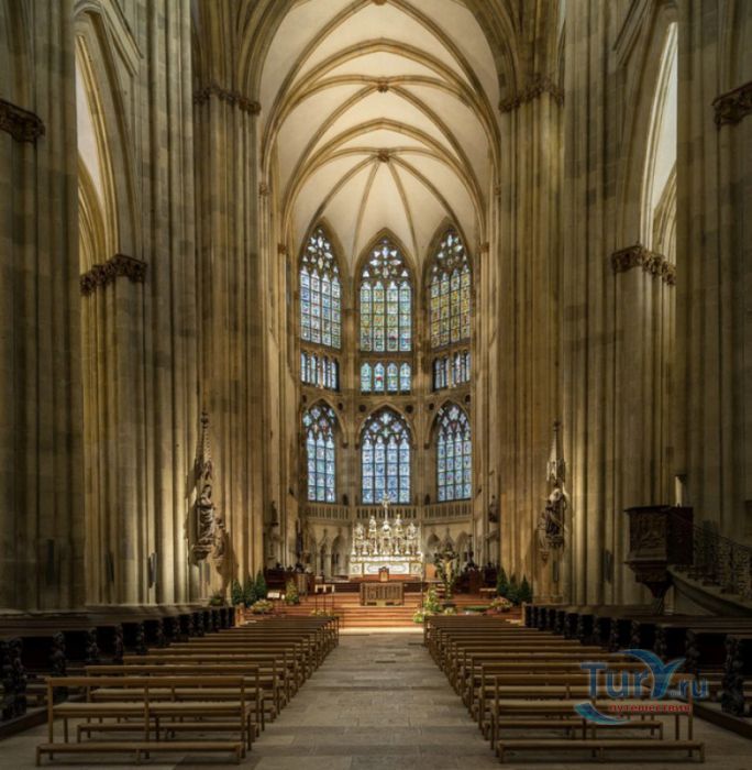 Кафедральный Собор Святого Петра в Регенсбурге (Регенсбургский Собор) расположен в историческом центре (Старом городе) Регенсбурга, в составе которого в 2006 году внесен в список Всемирного наследия ЮНЕСКО. Возведение Регенсбургского собора было начато в 1273 году и продолжалось, до окончательного его завершения, почти 250 лет. Уже в VII веке на месте нынешнего собора стояла романская церковь, которая на протяжении веков неоднократно разрушалась, восстанавливалась и перестраивалась. В 1250 году сильный пожар снова уничтожил здание церкви, и Регенсбургская епархия принимает решение о строительстве на её месте нового собора в стиле Высокой готики. Поскольку работы велись очень долго, на строительстве собора сменился ни один архитектор, каждый из которых внёс свою лепту во внешний облик здания. В результате фасад здания выглядит несколько разобщённым - отличаются как строительный материал, используемый при возведении собора (известняк, зелёный песчаник и снова известняк), так и декоративные элементы здания. Полностью работы были завершены в 1520 году, к этому времени здание собора представляло собой трёхневную базилику без трансепта. Длина фасада составляет 86 метров, ширина – 35 метров. Главный, западный, портал собора, построенный в 1415 году, богато украшен статуями святых, барельефами, резными стрельчатыми архивольтами, обрамляющими арочные проёмы, и ажурными каменными решётками. На тимпане правого портала располагается скульптурная композиция, на которой изображена сцена освобождения ангелом святого Петра, заключённого в темницу. Кроме того, на фасадах здания размещены статуи языческих властителей четырёх мировых империй - вавилонского царя Навуходоносора, верхом на медведе, македонского царя Александра Великого, сидящего на пантере, римского императора Августа, восседающего на единороге, и персидского царя Кира - на льве. Единственным сохранившимся элементом романской церкви является северная башня Эзельстурм, которую не стали сносить, так как использовали её для подъёма строительных материалов при возведении нового собора. До середины XIX века западные неоготические башни собора имели только три этажа, в 1859-1869 годах, по указу короля Людвига I, они были надстроены и увенчаны высокими остроконечными шпилями - высота башен, таким образом, стала равняться 105 метрам. Интерьер собора также богато украшен колоннами и скульптурными композициями, среди которых - сцена Благовещения (1280 год), располагающаяся на колоннах средокрестия, знаменитая статуя "Улыбающегося ангела", статуи святых Петра и Павла (всего в соборе насчитывается более 100 изображений Святого Петра), а также скульптурная композиция "Чёрт и его бабушка". Главная достопримечательность Регенсбургского собора - оригинальные готические витражи, украшающие окна клироса, поперечной части и боковых продольных нефов. Большинство витражей датируются 1220-1370 годами, они выполнены из мелких кусочков цветного стекла, скреплённых свинцовыми прутьями. Витражи на окнах западного фасада появились уже в XIX столетии. В центральном нефе установлен великолепный серебряный алтарь, выполненный в 1695-1785 годах ювелирами из Аугсбурга. Позади главного алтаря находится кафедра епископа Регенсбурга. На протяжении веков собор служил местом захоронения епископов и знатных горожан, в клуатре 