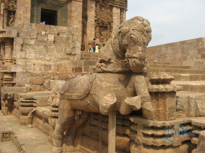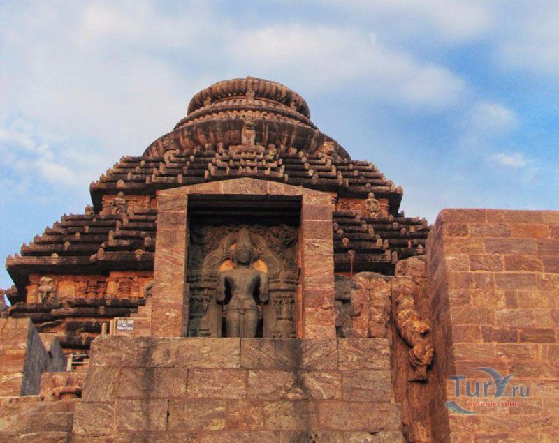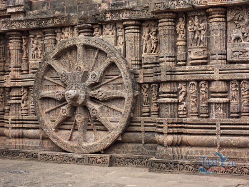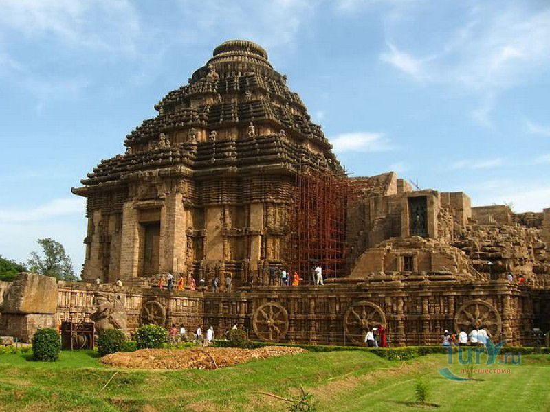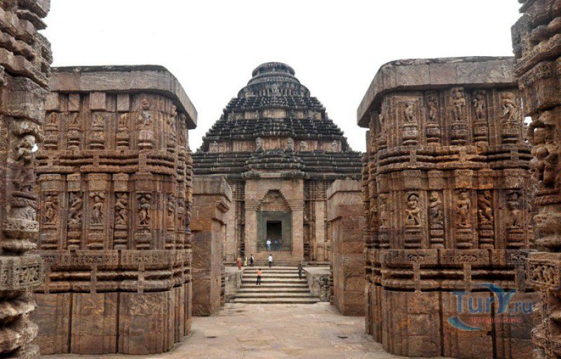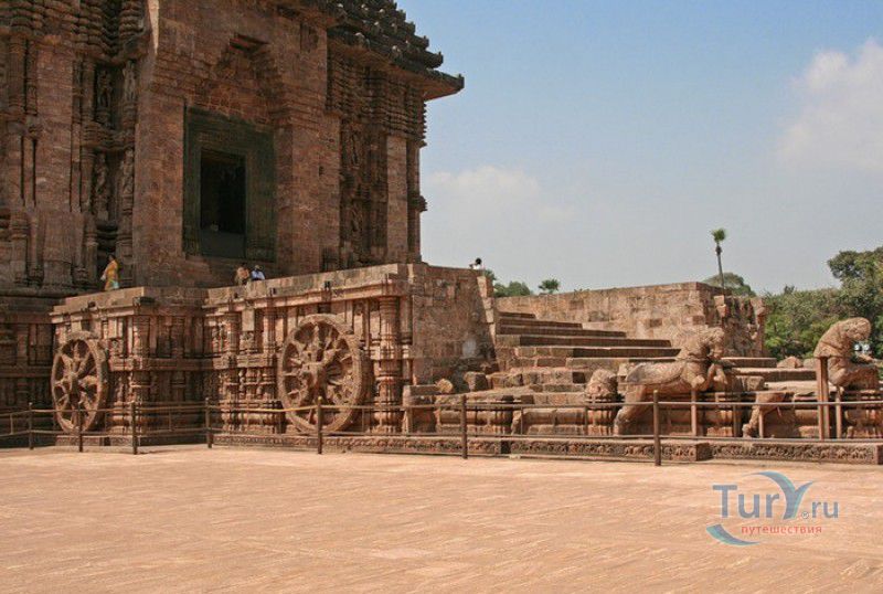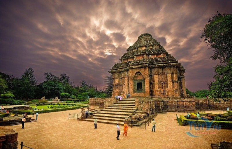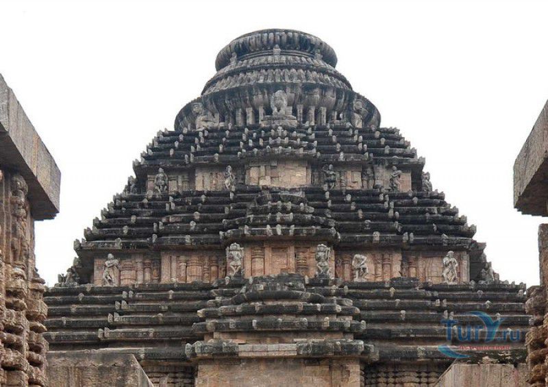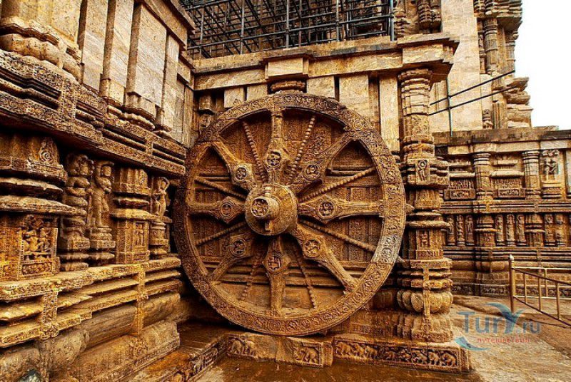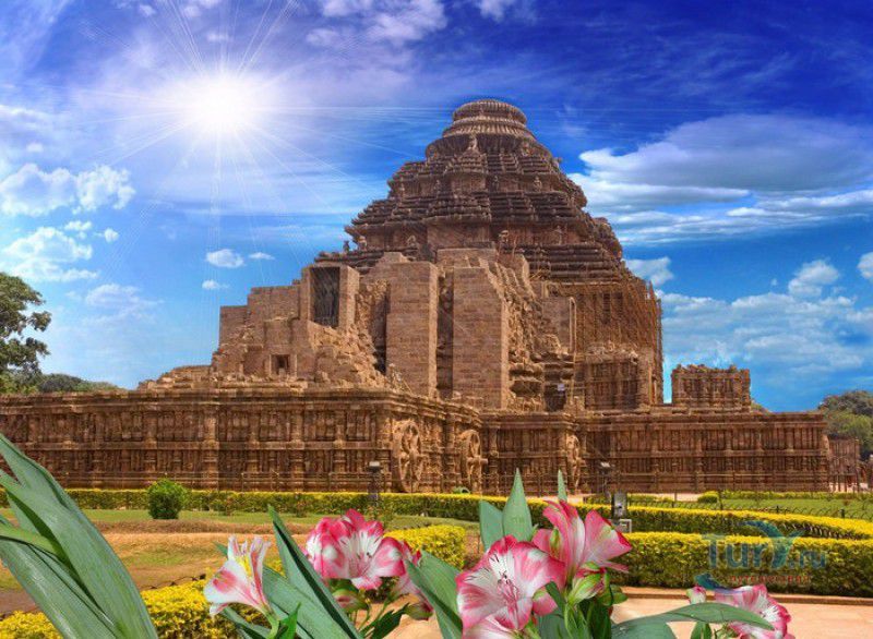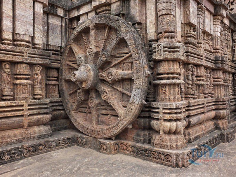 Храм Солнца в Конараке (Чёрная Пагода) расположен в Индии, в штате Орисса, в городе Конарак. Храм был возведен в 1243-1255 годах по приказу Нарасимхадевы I, короля Ориссы из династии Восточная Ганга. Правитель Ориссы поклонялся богу солнца Сурье и верил, что всеми своими успехами обязан его защите и покровительству - Нарасимхадева I не только успешно отражал нападения мусульман на Ориссу, но и освободил из-под их владычества большую часть Бенгалии. В честь победы Нарасимхадевы I над армией Туграл Туган-хана и был возведен храм Солнца в Конараке. Местность, в которой расположен храм, издавна считалась священной, здесь был наиболее развит культ бога Солнца, а само назване Конарак переводится как "уголок Солнца". Изначально храм располагался на самом берегу Бенгальского залива, но со временем океан отступил, и сейчас храм Солнца находится примерно в трёх километрах от побережья. Храм Солнца выполнен в традиционном стиле архитектуры Калинга (древнего королевства в Восточной Индии), его строительство длилось 12 лет, и всё это время здесь неустанно трудились около 1200 лучших мастеров - архитекторов, каменотёсов, резчиков и скульпторов. Храм построен в виде колесницы бога Солнца, в которой по верхнему и нижнему небу передвигался великий Сурья. Храм-колесница "запряжён" в упряжку из семи каменных лошадей, на цоколе храма, с северной и южной сторон здания, вырезаны из камня 24 огромных колеса (по 12 на каждой стороне) диаметром 3 метра, богато украшенные резьбой и декоративным орнаментом. Храм Солнца состоял из трёх структур - виманы (главного святилища), джагамохана (зала для молитв) и ната мандира (танцевального зала). Вимана была увенчана башней-шикхарой высотой около 60 метров. Очевидно, башня должна быть ещё выше, но её возведение прекратили из-за опасности обрушения - храм возводили на самом берегу океана, и песок стал оседать под тяжестью сооружения. Чтобы обезопасить храм от разрушения, строители применили инновационный на то время метод - здание было "сковано" металлическим каркасом (плиты стен скрепили железными прутьями и клиньями, а потолок джагамохана "подвесили" на металлических балках). Джагамохан, возведенный на той же платформе, что и главный храм, состоит из бады (кубического тела) и пиды (пирамидальной крыши), состоящей из трёх террас, на которые ведут каменные лестницы. На террасах установлены статуи в натуральную величину, изображающие женщин в различных танцевальных позах. Танцевальный зал расположен к востоку от главного храма и зала для молитв, он представляет собой большой колонный зал без крыши, установленный на высокой платформе. Здесь исполнялись ритуальные танцы, посвящённые богу Солнца. Вся поверхность стен храма украшена великолепными барельефами с изображениями богов, мифических животных, львов, боевых слонов, танцующих мужчин и женщин, а также эротических сцен "майтхуна". "Здесь язык камня превосходит язык человека" - так описал увиденное выдающийся индийский поэт Рабиндранат Тагор. С храмом Солнца в Конараке связаны множество легенд. По одной из них, огромная статуя бога Солнца Сурьи, расположенная в главном святилище, буквально "парила" в воздухе. Этого эффекта древние мастера смогли добиться с помощью мощнейших магнитов, расположенных сверху, снизу и по бокам скульптуры, изготовленной из материала с содержанием 