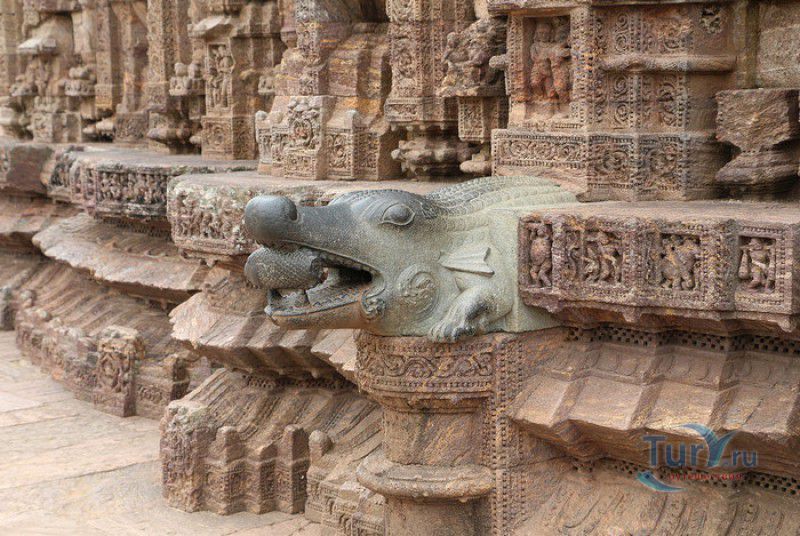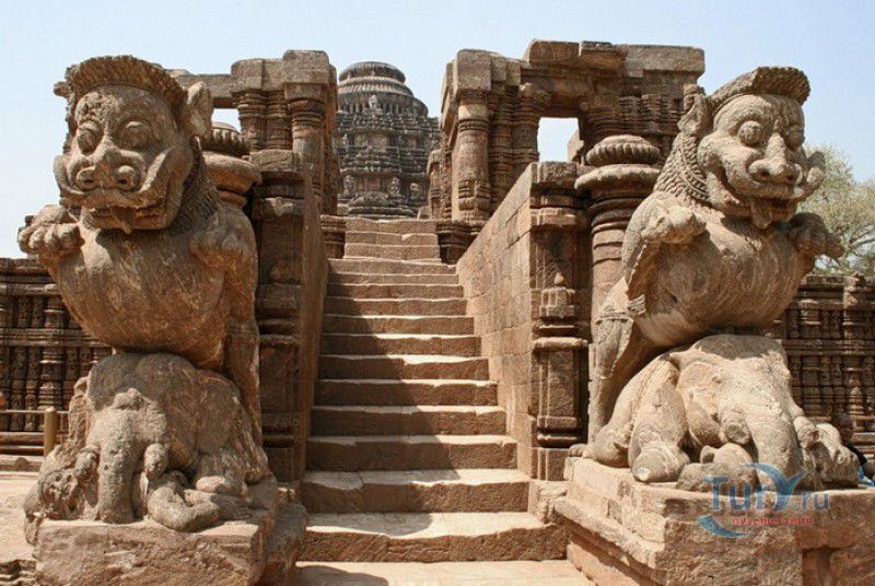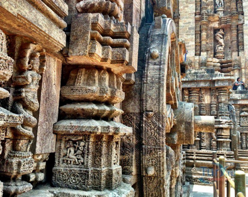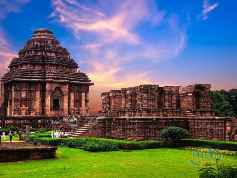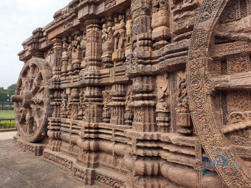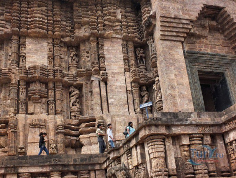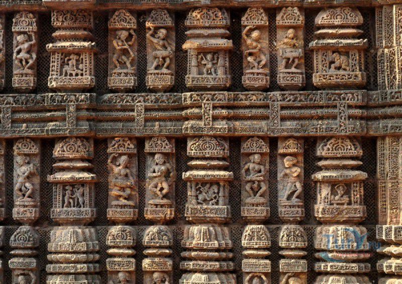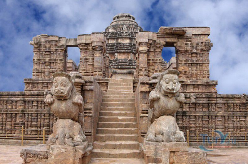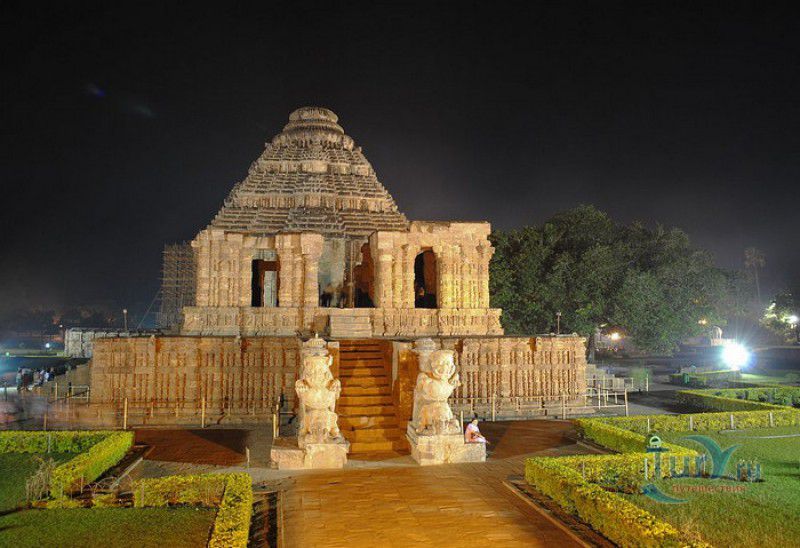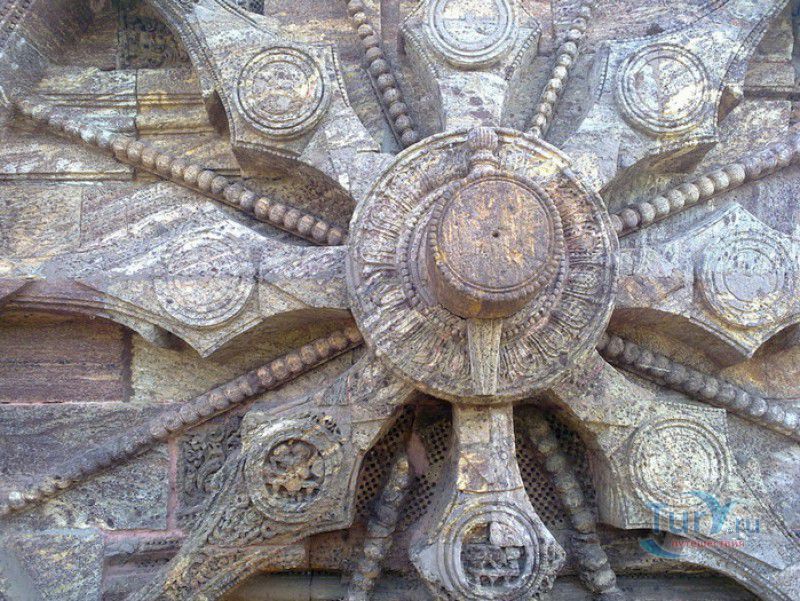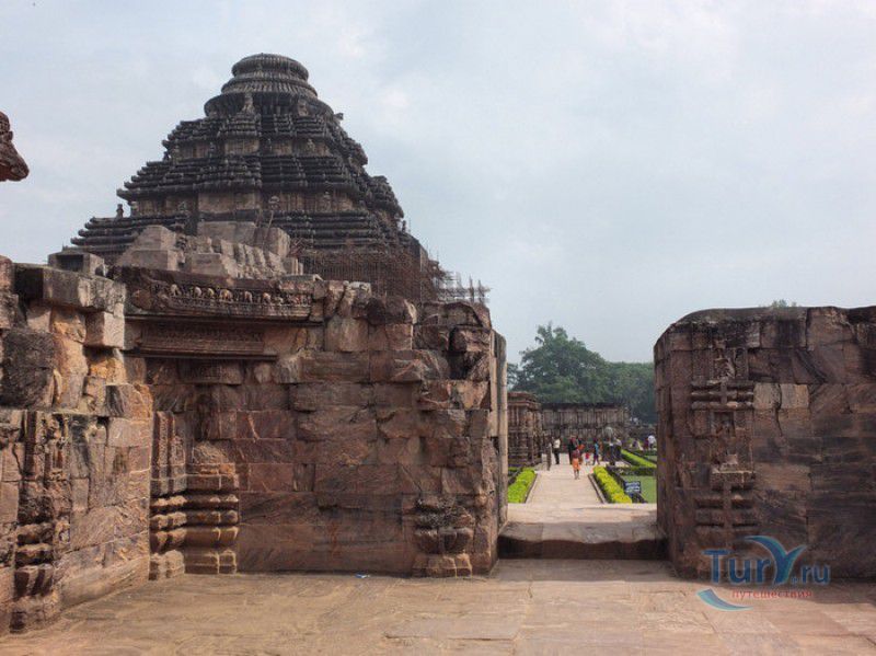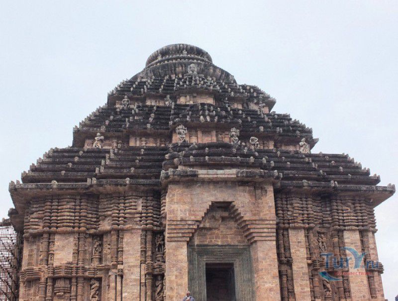 Храм Солнца в Конараке (Чёрная Пагода) расположен в Индии, в штате Орисса, в городе Конарак. Храм был возведен в 1243-1255 годах по приказу Нарасимхадевы I, короля Ориссы из династии Восточная Ганга. Правитель Ориссы поклонялся богу солнца Сурье и верил, что всеми своими успехами обязан его защите и покровительству - Нарасимхадева I не только успешно отражал нападения мусульман на Ориссу, но и освободил из-под их владычества большую часть Бенгалии. В честь победы Нарасимхадевы I над армией Туграл Туган-хана и был возведен храм Солнца в Конараке. Местность, в которой расположен храм, издавна считалась священной, здесь был наиболее развит культ бога Солнца, а само назване Конарак переводится как "уголок Солнца". Изначально храм располагался на самом берегу Бенгальского залива, но со временем океан отступил, и сейчас храм Солнца находится примерно в трёх километрах от побережья. Храм Солнца выполнен в традиционном стиле архитектуры Калинга (древнего королевства в Восточной Индии), его строительство длилось 12 лет, и всё это время здесь неустанно трудились около 1200 лучших мастеров - архитекторов, каменотёсов, резчиков и скульпторов. Храм построен в виде колесницы бога Солнца, в которой по верхнему и нижнему небу передвигался великий Сурья. Храм-колесница "запряжён" в упряжку из семи каменных лошадей, на цоколе храма, с северной и южной сторон здания, вырезаны из камня 24 огромных колеса (по 12 на каждой стороне) диаметром 3 метра, богато украшенные резьбой и декоративным орнаментом. Храм Солнца состоял из трёх структур - виманы (главного святилища), джагамохана (зала для молитв) и ната мандира (танцевального зала). Вимана была увенчана башней-шикхарой высотой около 60 метров. Очевидно, башня должна быть ещё выше, но её возведение прекратили из-за опасности обрушения - храм возводили на самом берегу океана, и песок стал оседать под тяжестью сооружения. Чтобы обезопасить храм от разрушения, строители применили инновационный на то время метод - здание было "сковано" металлическим каркасом (плиты стен скрепили железными прутьями и клиньями, а потолок джагамохана "подвесили" на металлических балках). Джагамохан, возведенный на той же платформе, что и главный храм, состоит из бады (кубического тела) и пиды (пирамидальной крыши), состоящей из трёх террас, на которые ведут каменные лестницы. На террасах установлены статуи в натуральную величину, изображающие женщин в различных танцевальных позах. Танцевальный зал расположен к востоку от главного храма и зала для молитв, он представляет собой большой колонный зал без крыши, установленный на высокой платформе. Здесь исполнялись ритуальные танцы, посвящённые богу Солнца. Вся поверхность стен храма украшена великолепными барельефами с изображениями богов, мифических животных, львов, боевых слонов, танцующих мужчин и женщин, а также эротических сцен "майтхуна". "Здесь язык камня превосходит язык человека" - так описал увиденное выдающийся индийский поэт Рабиндранат Тагор. С храмом Солнца в Конараке связаны множество легенд. По одной из них, огромная статуя бога Солнца Сурьи, расположенная в главном святилище, буквально "парила" в воздухе. Этого эффекта древние мастера смогли добиться с помощью мощнейших магнитов, расположенных сверху, снизу и по бокам скульптуры, изготовленной из материала с содержанием 